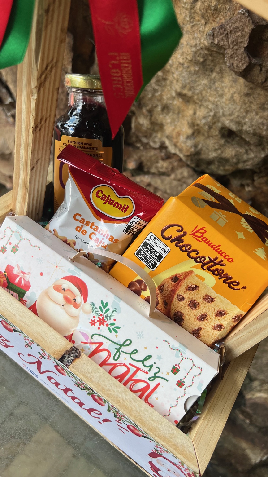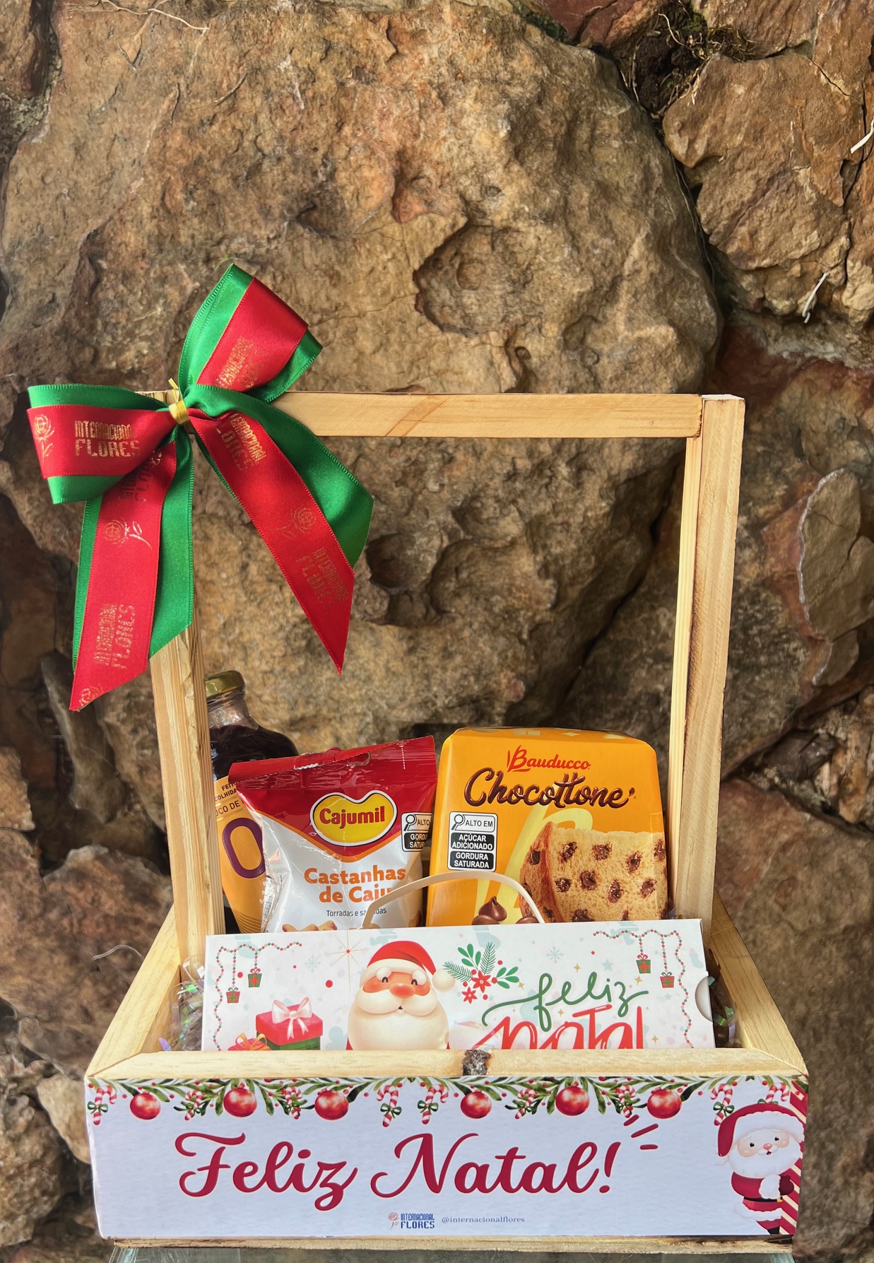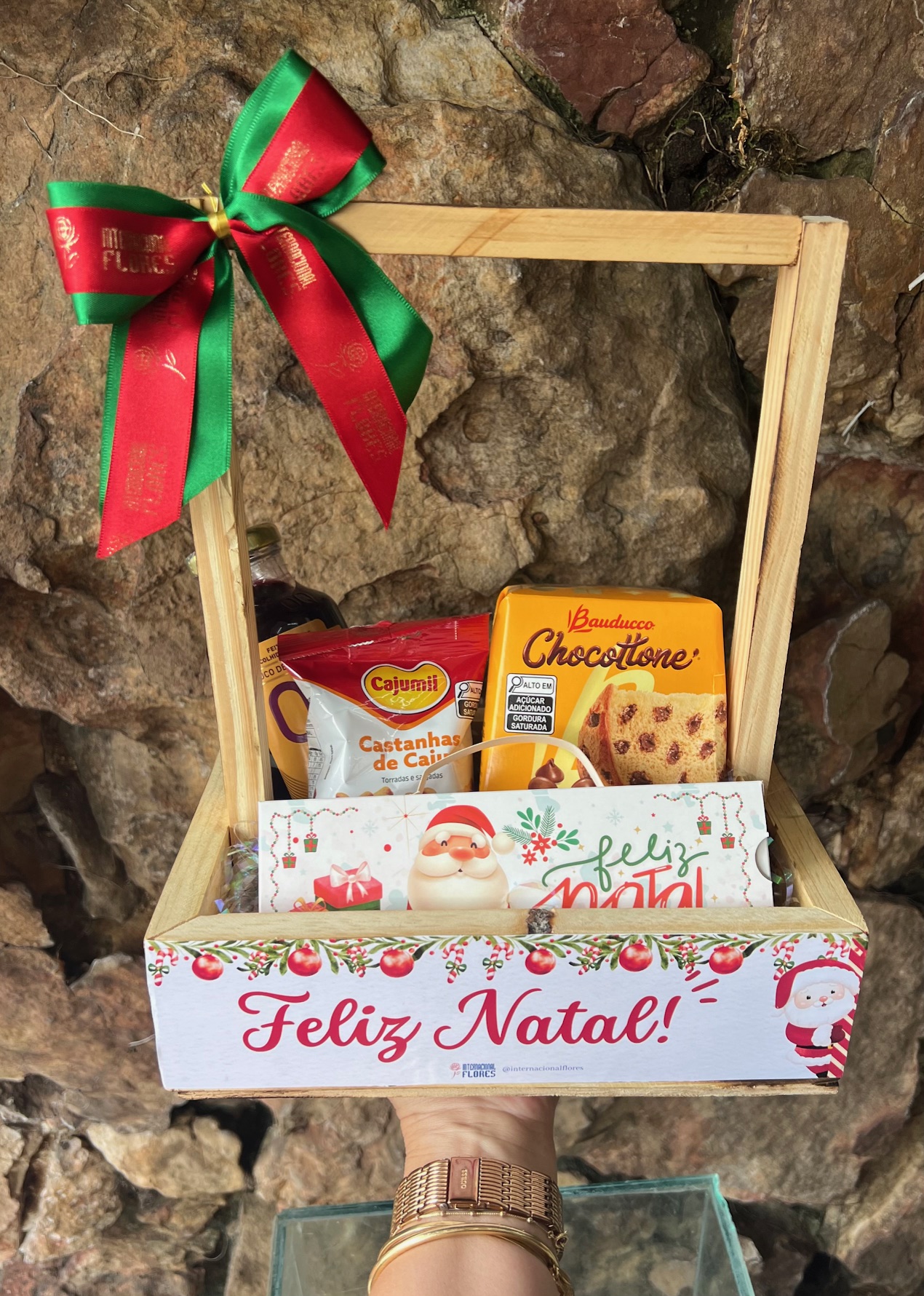 01 Cesta (24x18x29cm) de madeira rústica ou palha com decoração de Natal e adesivo de “Feliz Natal”