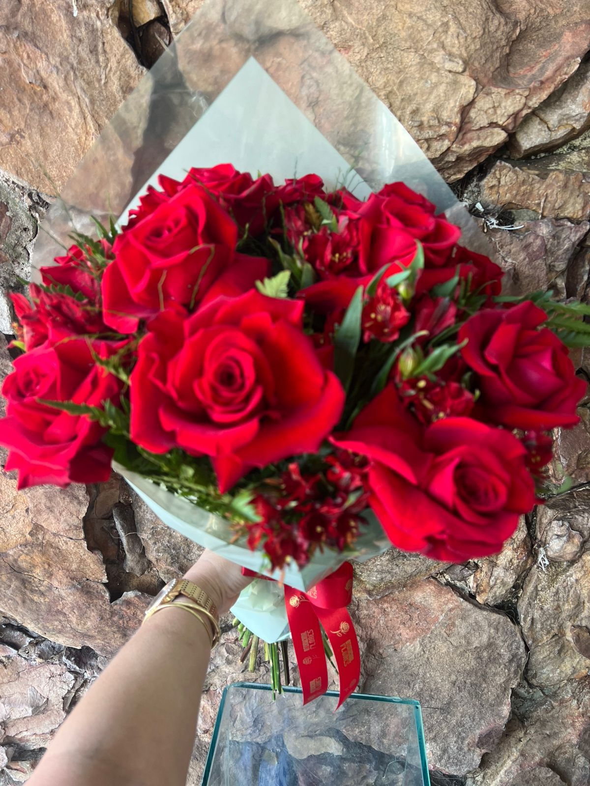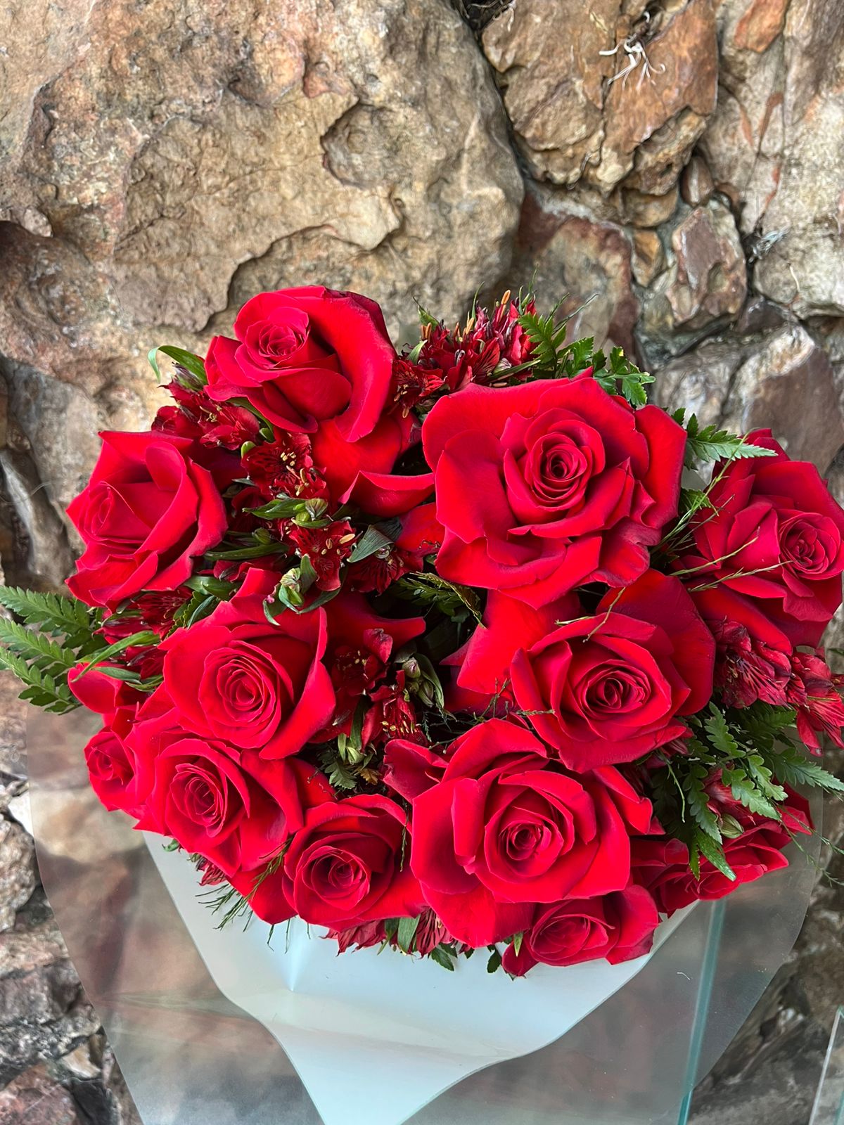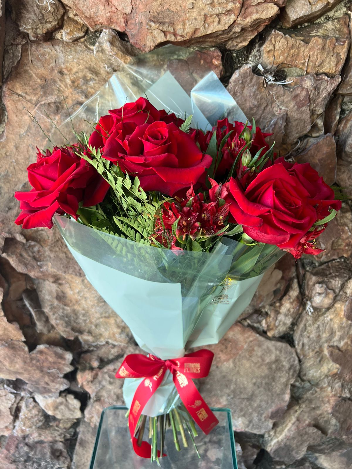 Buquê contendo 12 rosas colombinas vermelhas e 8/10 galhos de astromélias vermelhas, complemento em folhagens, embalado em papel especial com laço de fita.