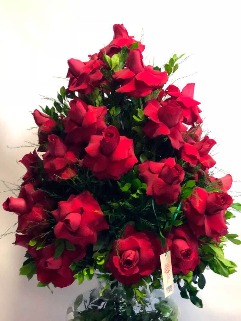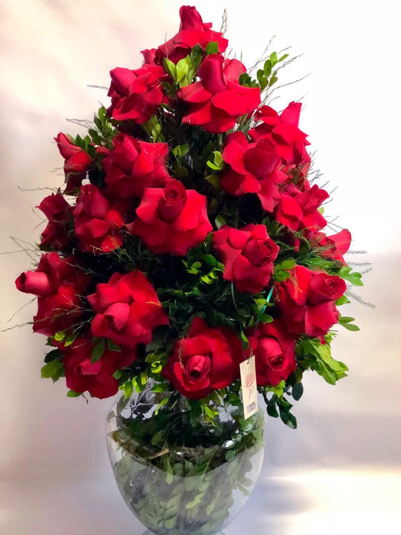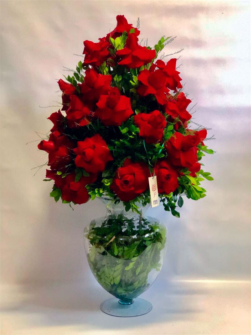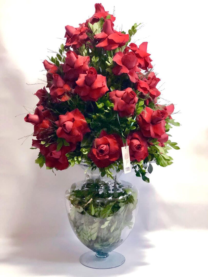 Arranjo redondo com 36 rosas importadas vermelha, acabamento em folhagem sobre um vaso de vidro de 40 cm de altura e 20 cm de diâmetro.