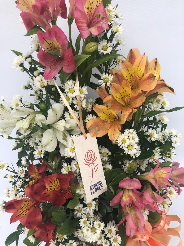 Arranjo confeccionado com mais ou menos 5/6 galhos de astromelias coloridas (as cores variam com a disponibilidade em estoque) em cachepô de madeira com complementos de folhagem e aster branco com laço de fita e etiqueta.
