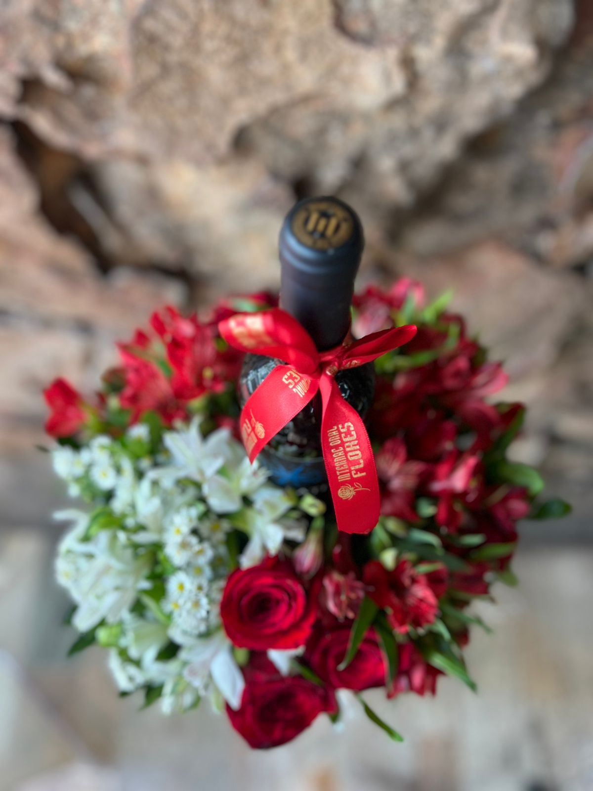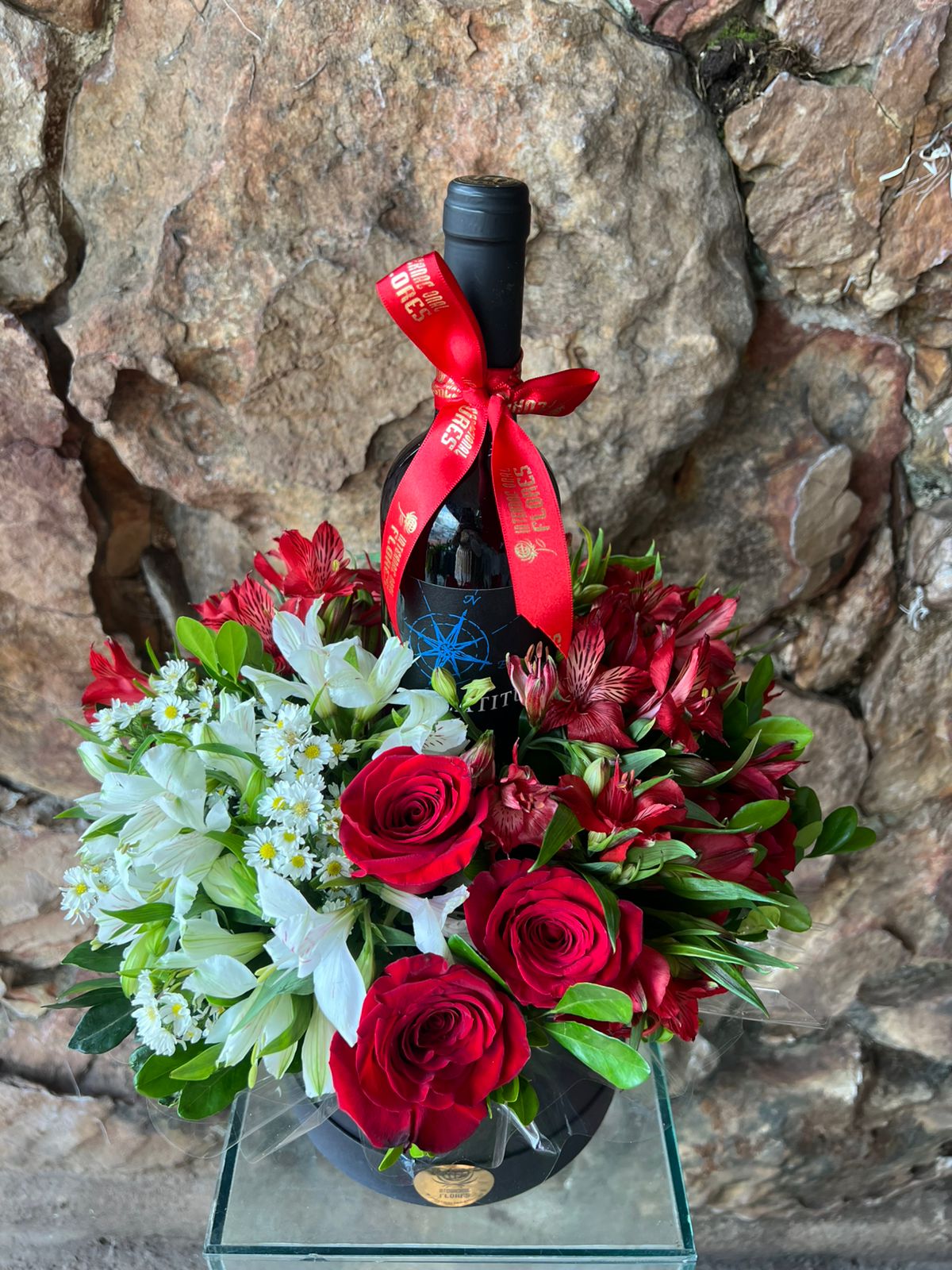 ARRANJO BOX FLORES MISTAS COM VINHO
