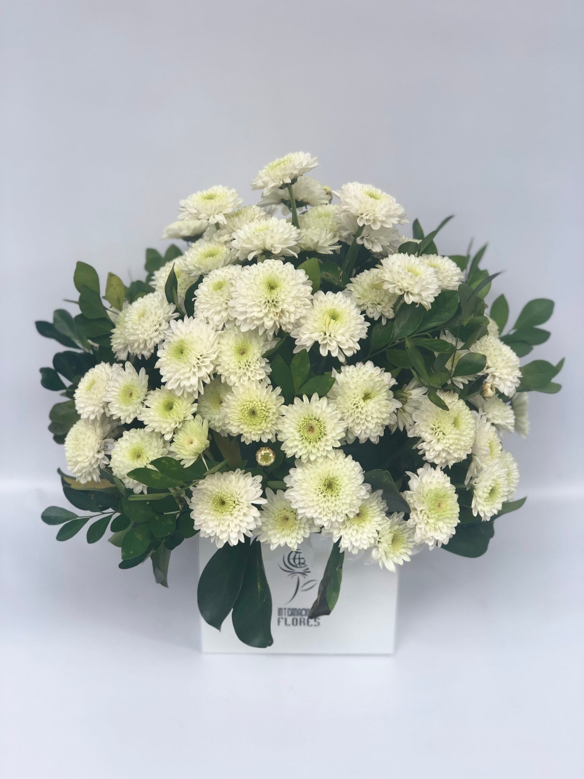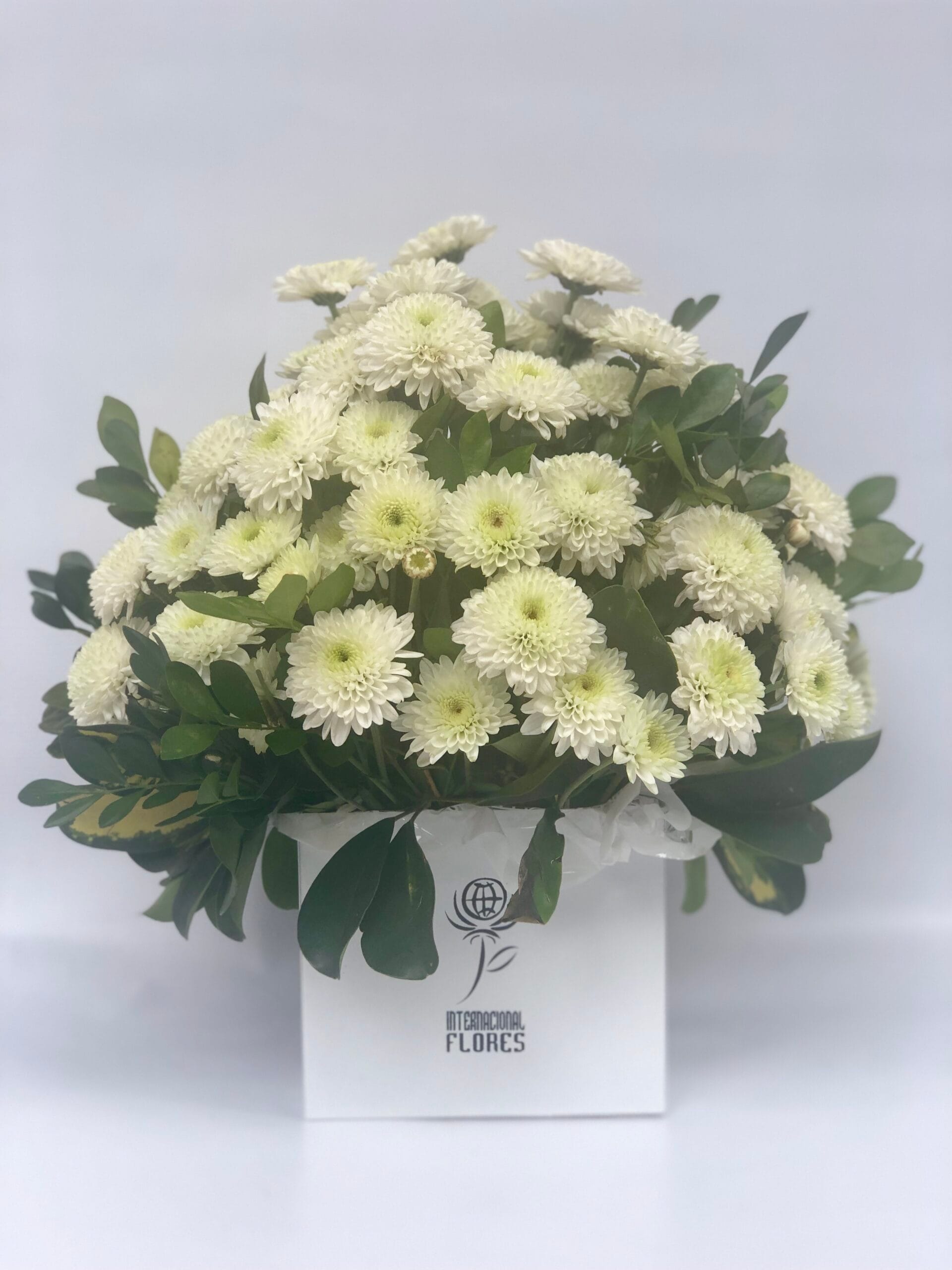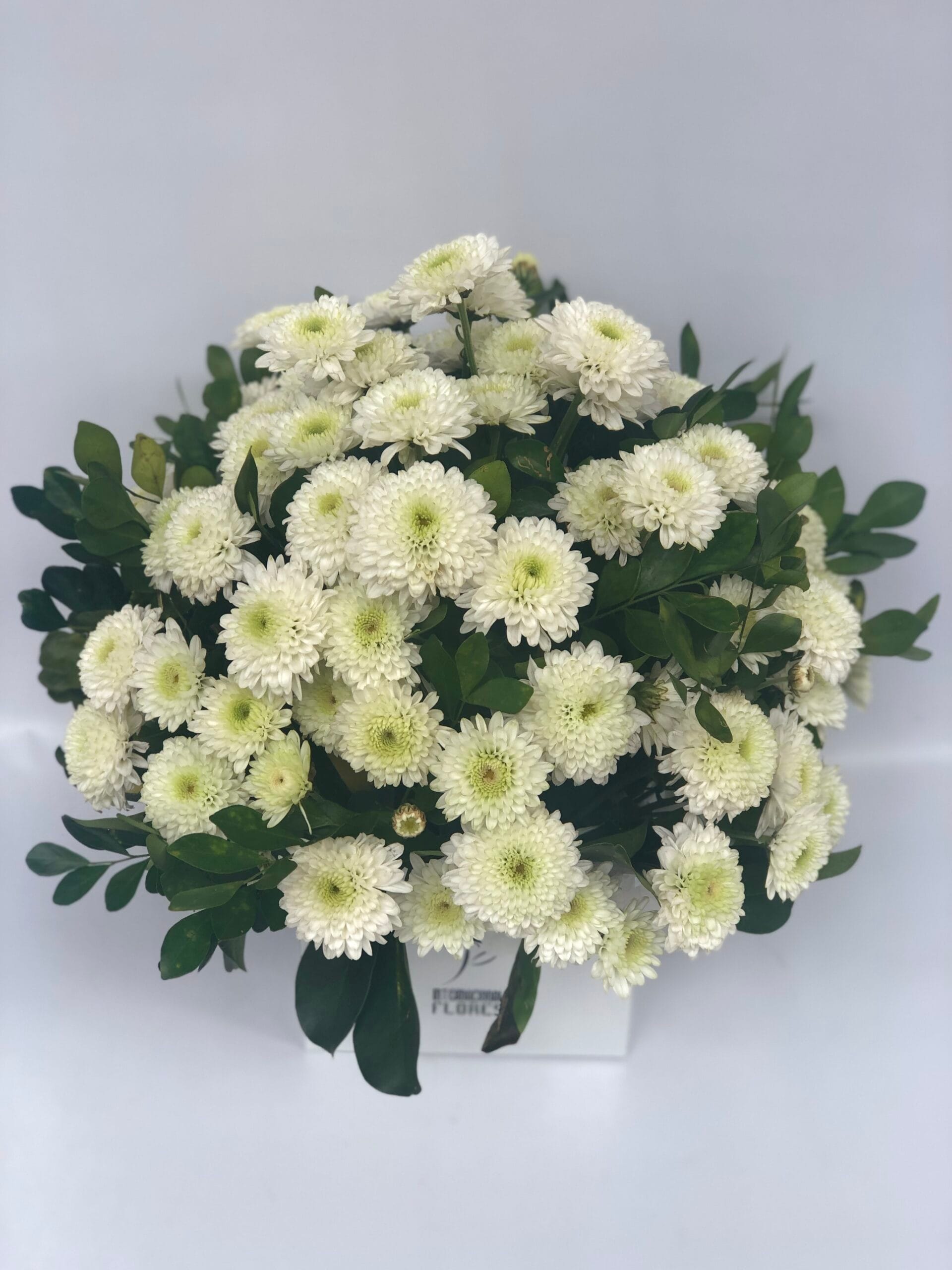 Singelo arranjo redondo em flores do campo OU margaridas BRANCAS complemento em folhagens no cachepô de madeira rústica OU box quadrado branco ou kraft.