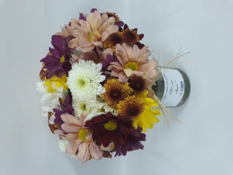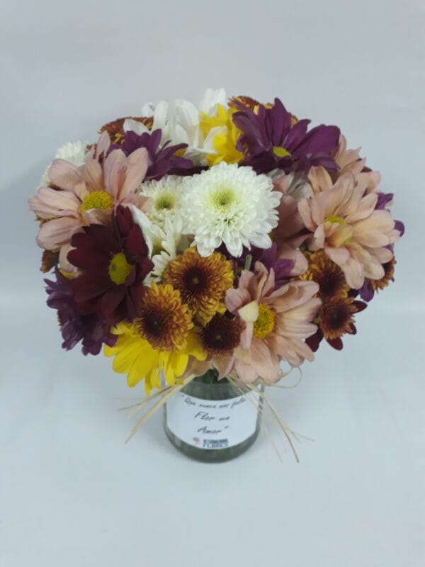 Pequeno arranjo de flores do campo mistas no vidro reciclado com singelo laço de rafia e adesivo “Que nunca nos falte Flor nem Amor”