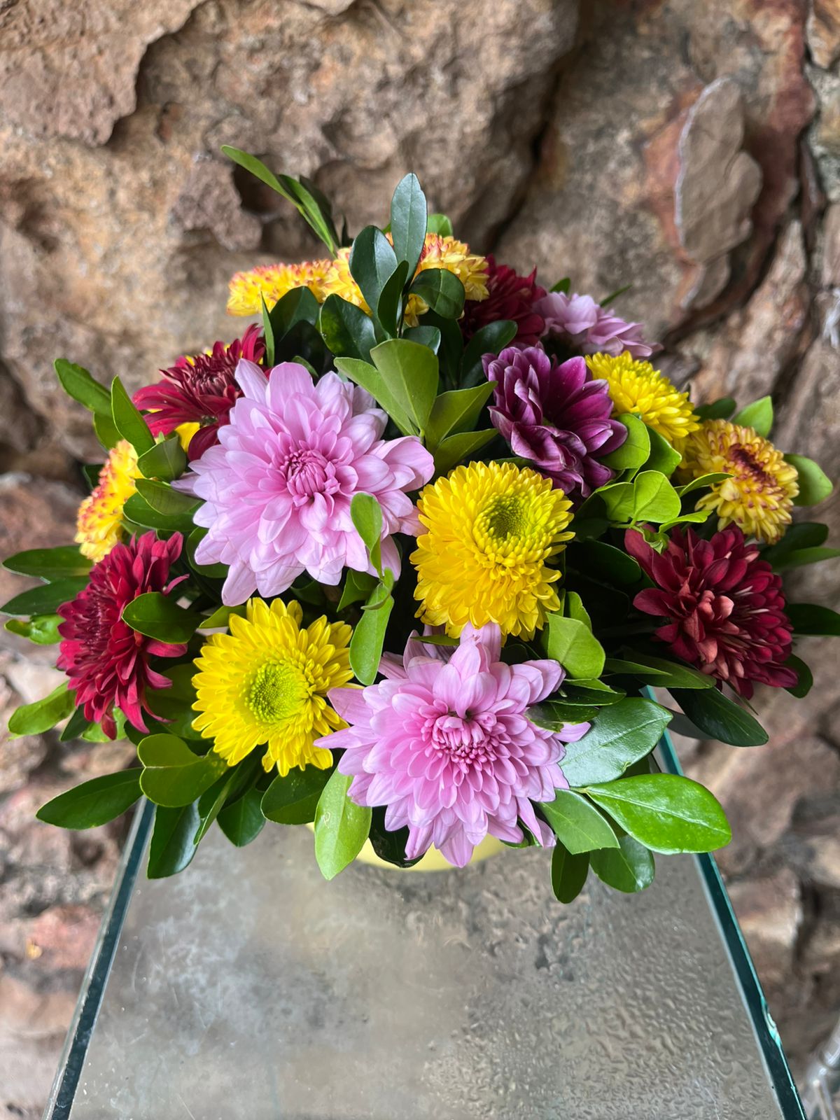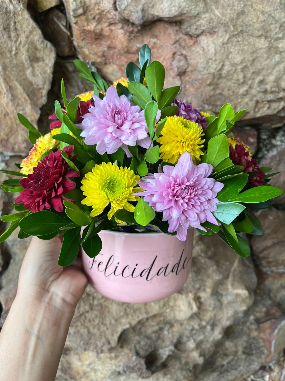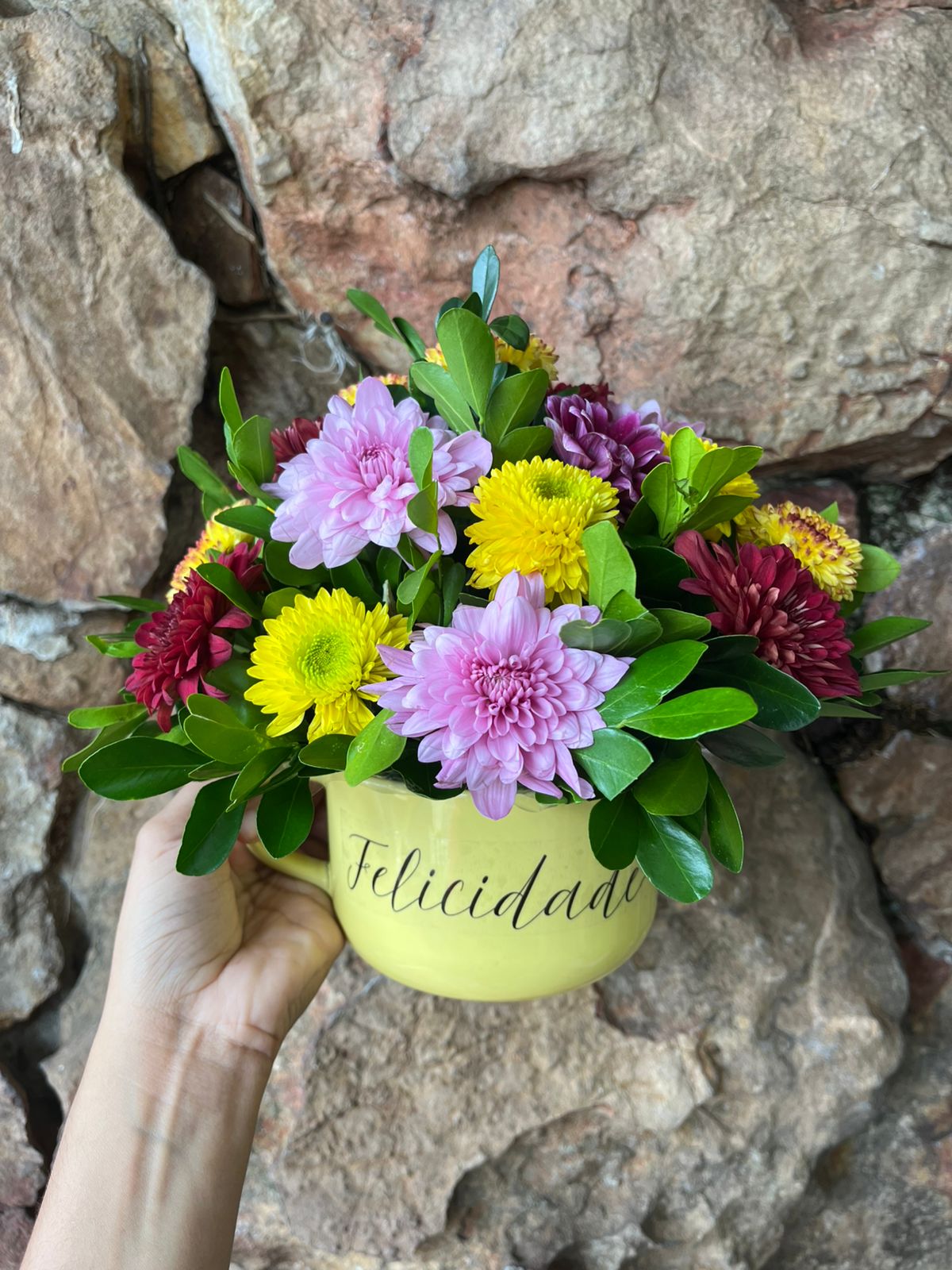 Arranjo redondo na caneca jumbo amarela, rosa ou azul  700ml com adesivo “Felicidade” em flores campestre coloridas (as cores podem variar conforme estoque)