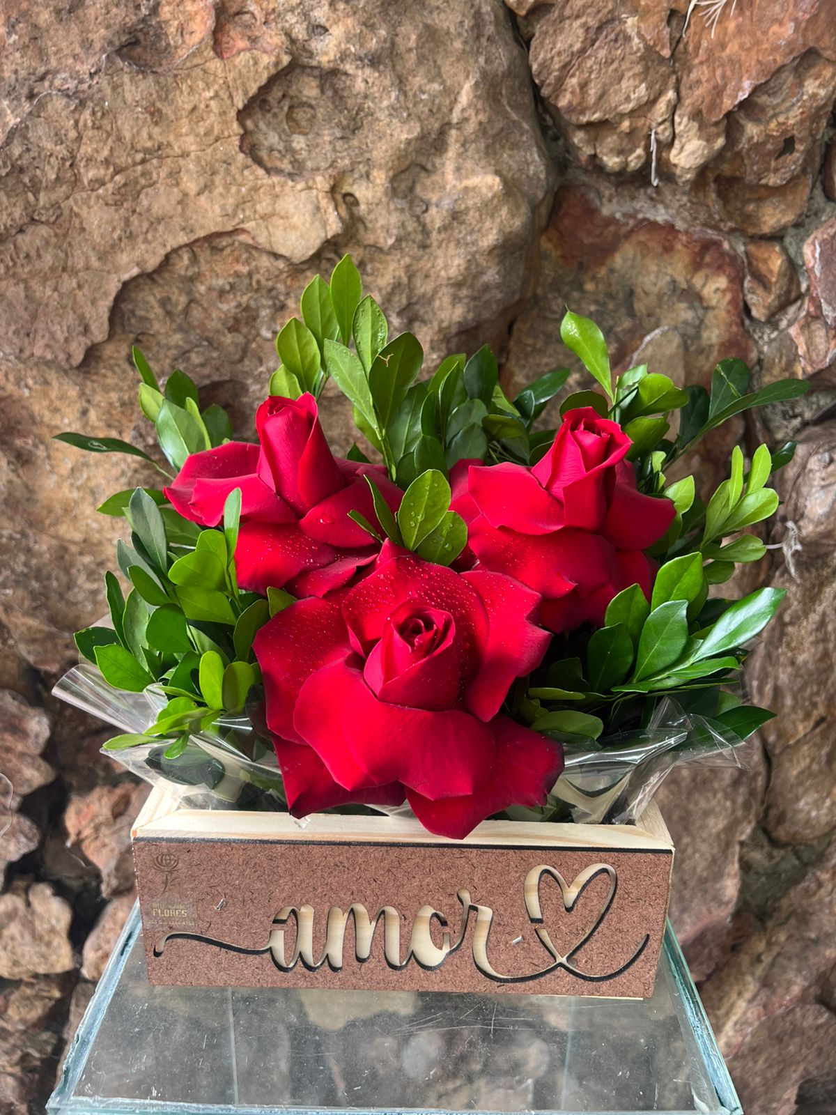 Arranjo de uma frente em base de floral na Cesta retangular “Amor” (20x14x07cm) contendo 3 rosas colombianas vermelhas complemento em folhagem.