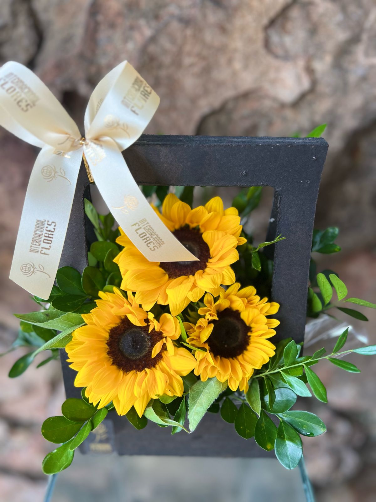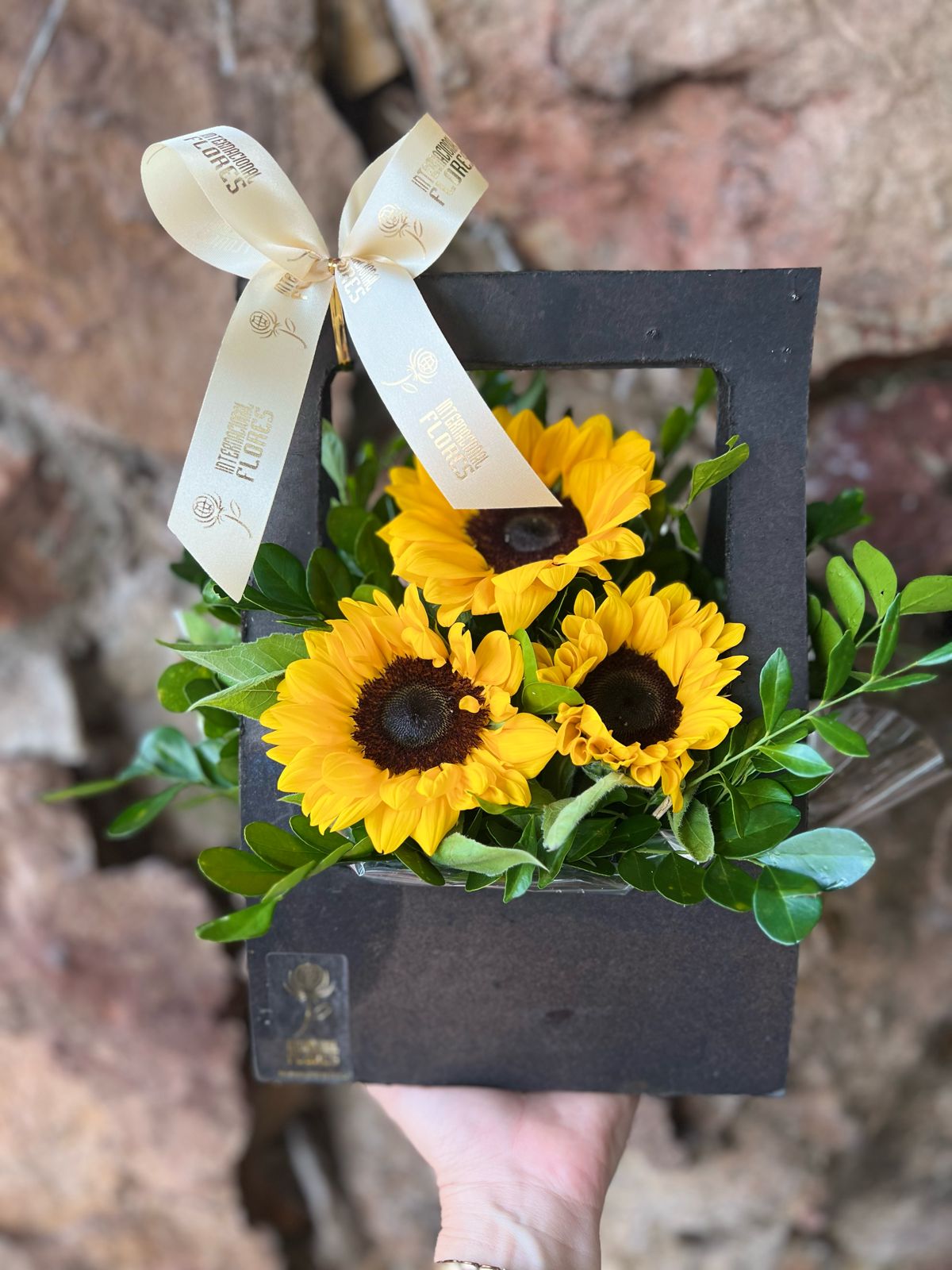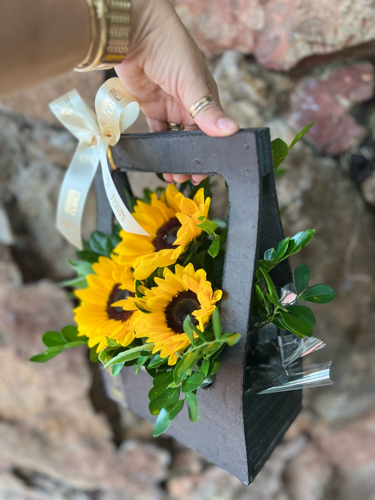 Diferente cestinha em madeira rustica (a cor da madeira pode alterar de acordo com o estoque) confeccionada em base de floral com 3 mini girassol e acabamento em folhagens diversas.
