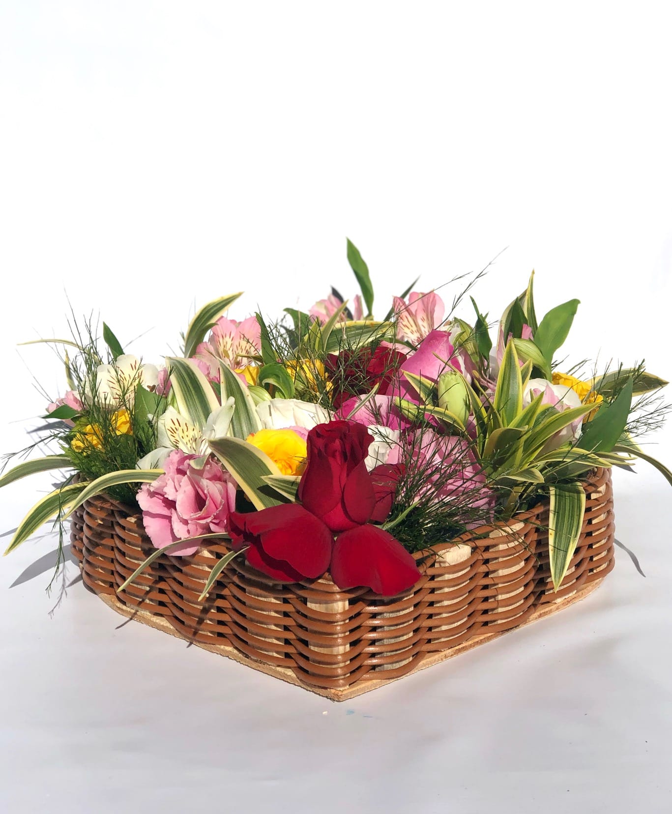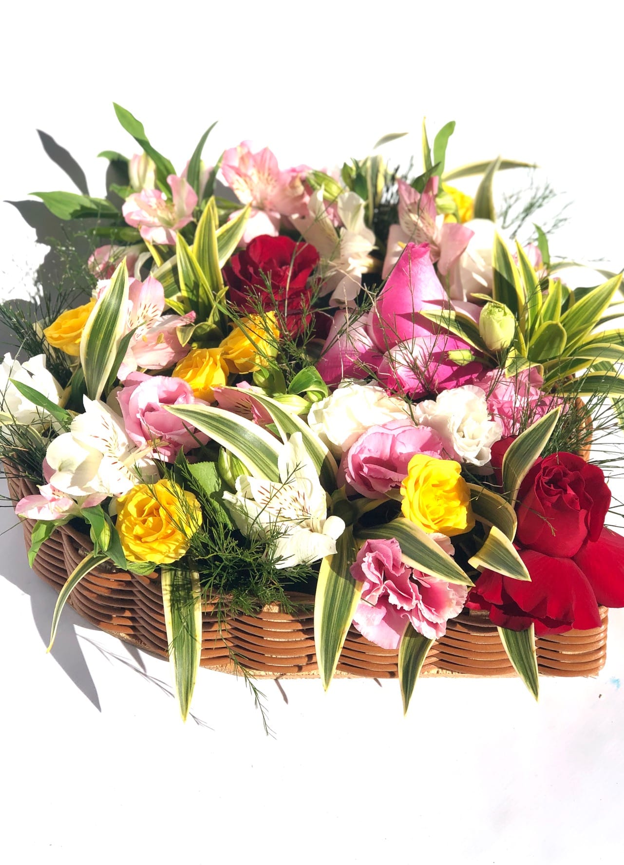 Um extraordinário arranjo em flores nobres nas cores amarelo, branco, vermelho e rosa com aproximadamente 12 a 14 galhos de flores e acabamento em folhagens diversas, em um coração de madeira artesanal.
