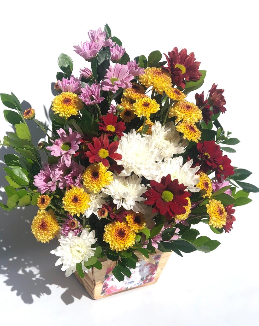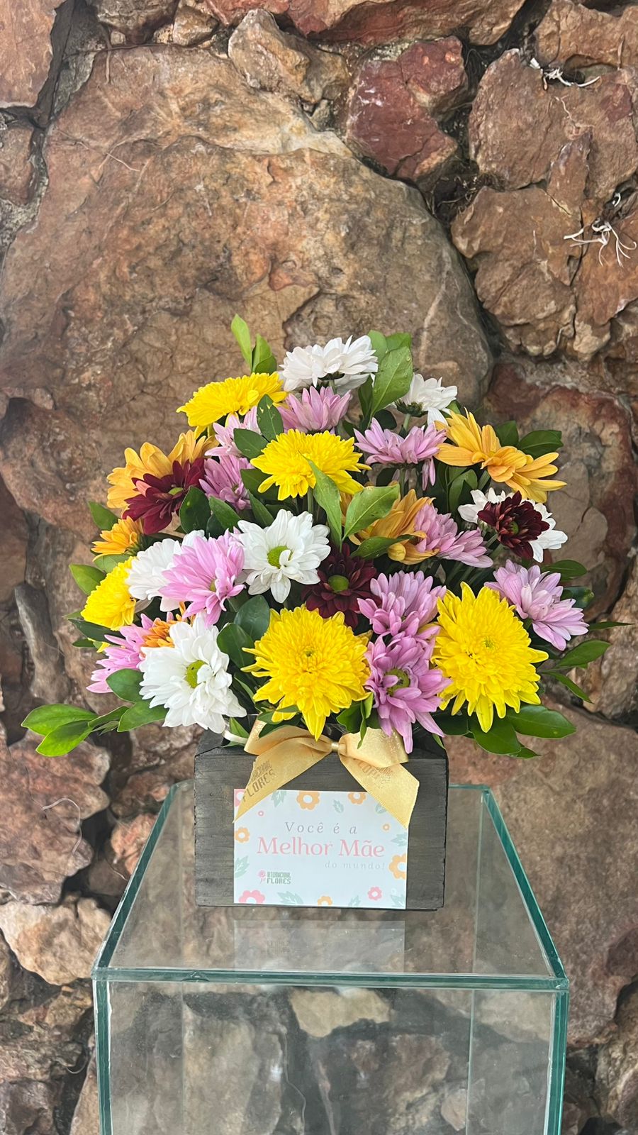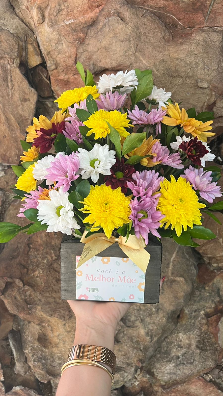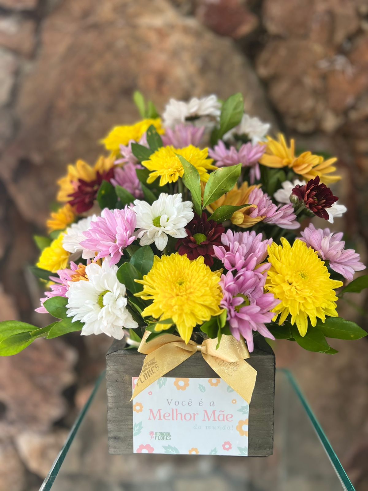 Alegre arranjo em flores do campo coloridas em cachepô de madeira rústica, com adesivo “Você é a Melhor Mãe do Mundo!”
