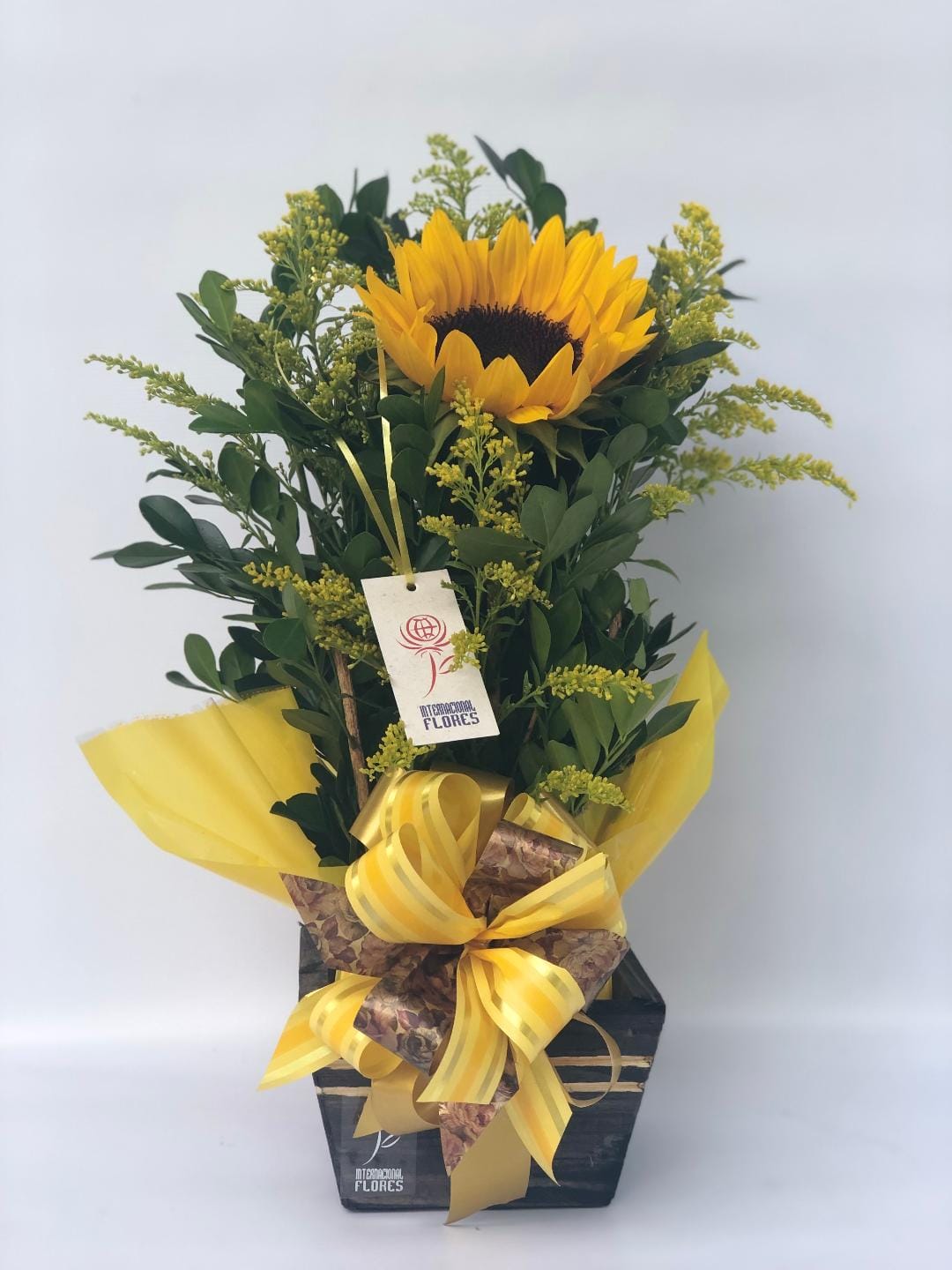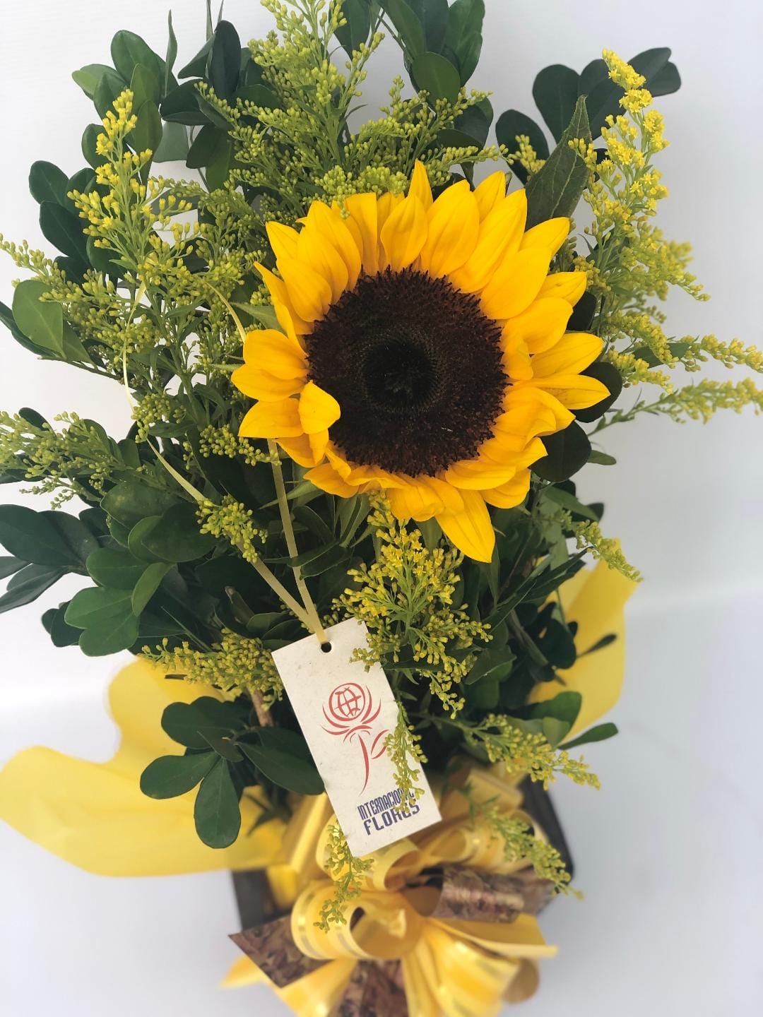 Arranjo confeccionado com 01 girassol em cachepô de madeira com complementos de folhagem e tango (ou aster branco) com laço de fita e etiqueta.