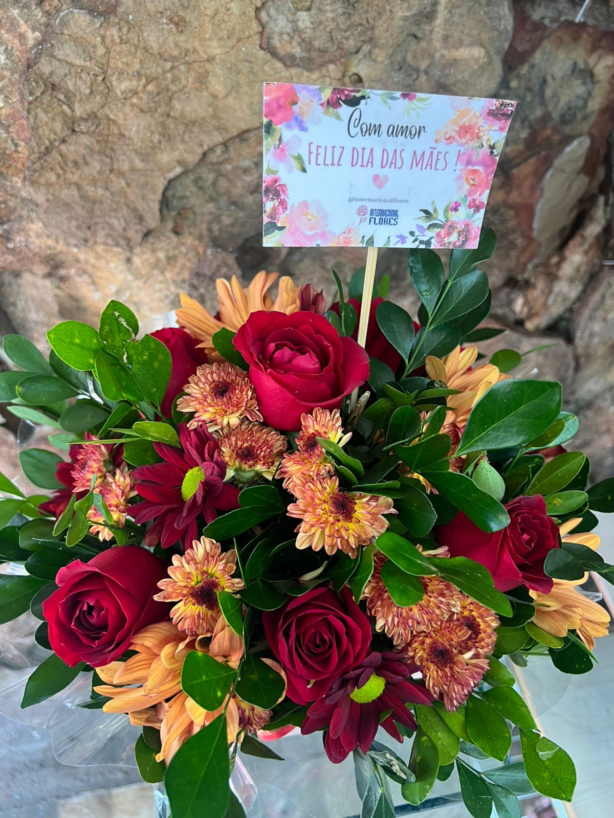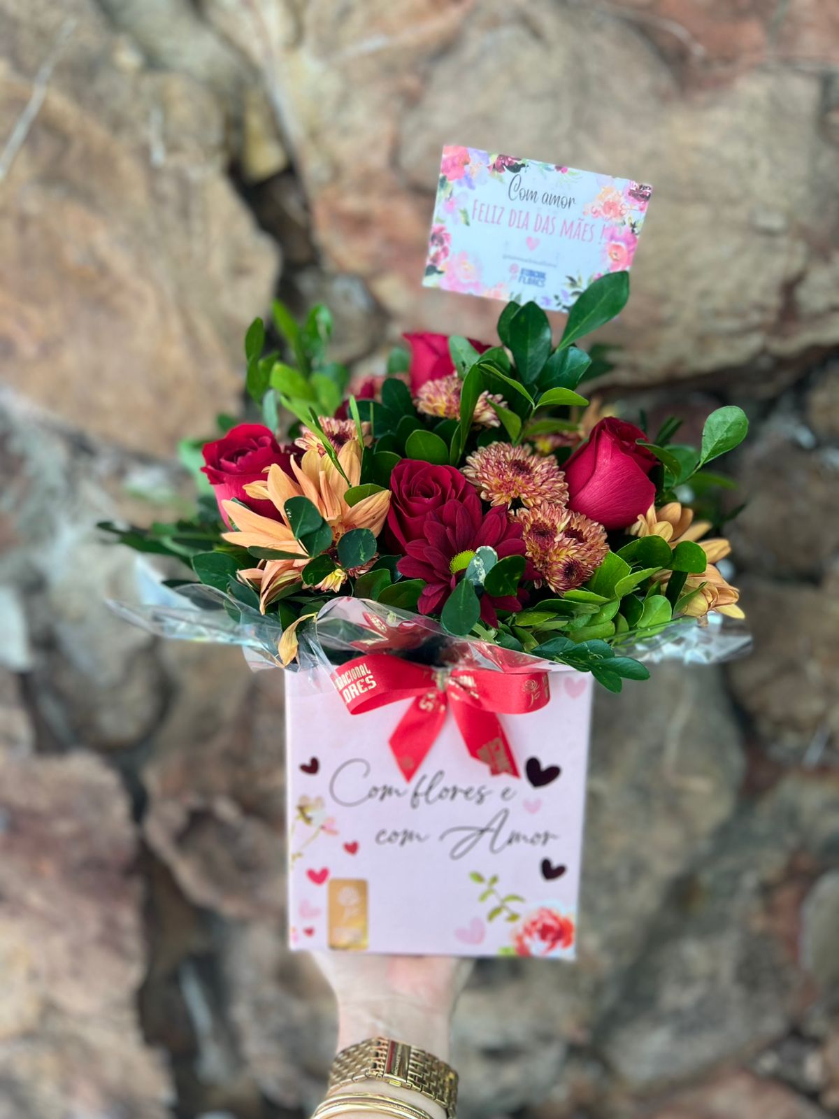 Arranjo redondo confeccionado em base de floral contendo 6 rosas nacionais vermelhas e flores campestres (as cores e modelos das campestres podem ser alteradas conforme estoque) complemento com folhagens dentro da caixa box decorada 14×14 cm, acompanha plaquinha “Com Amor, Feliz Dia Das Mães”