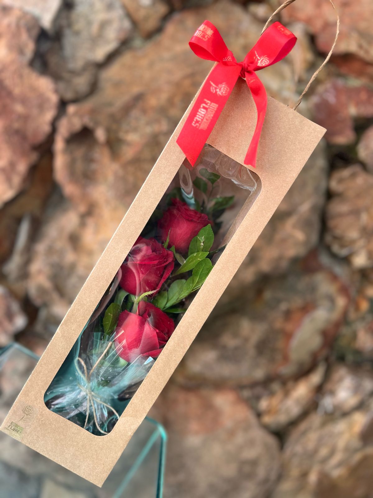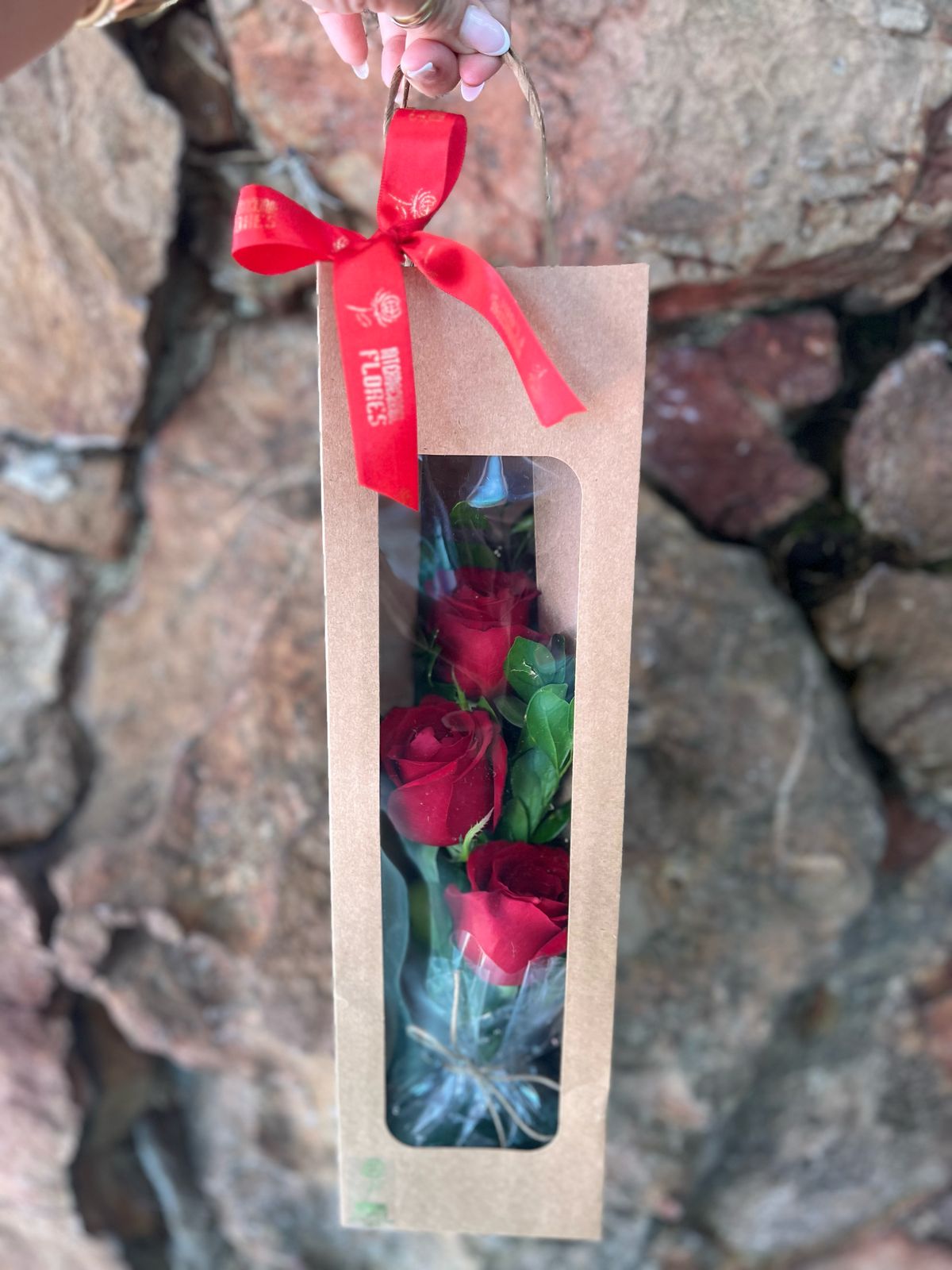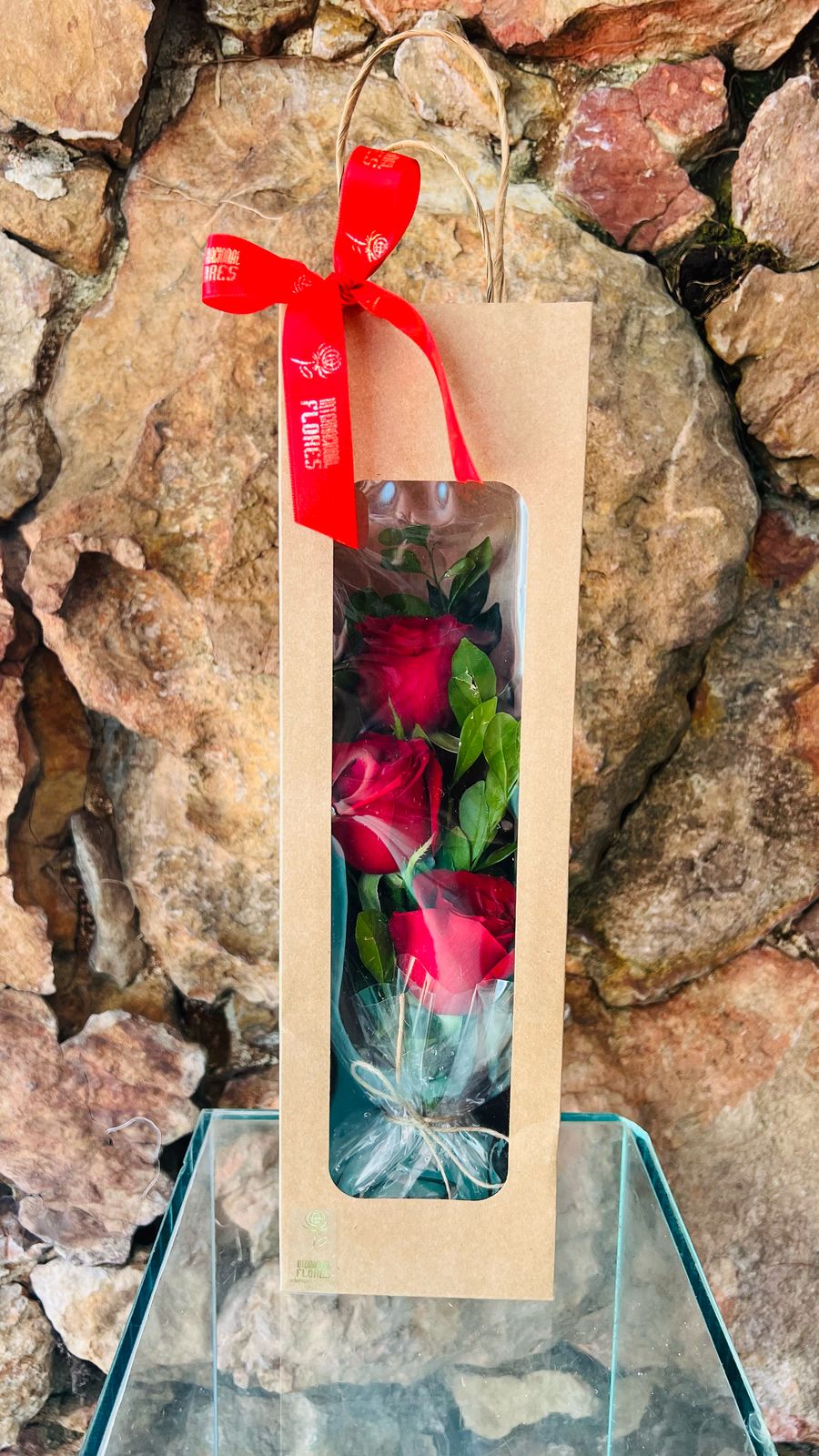 Um diferente arranjinho com 3 rosas vermelhas (também pode ser solicitado de outra cor) dentro da sacola de kraft com visor transparente.