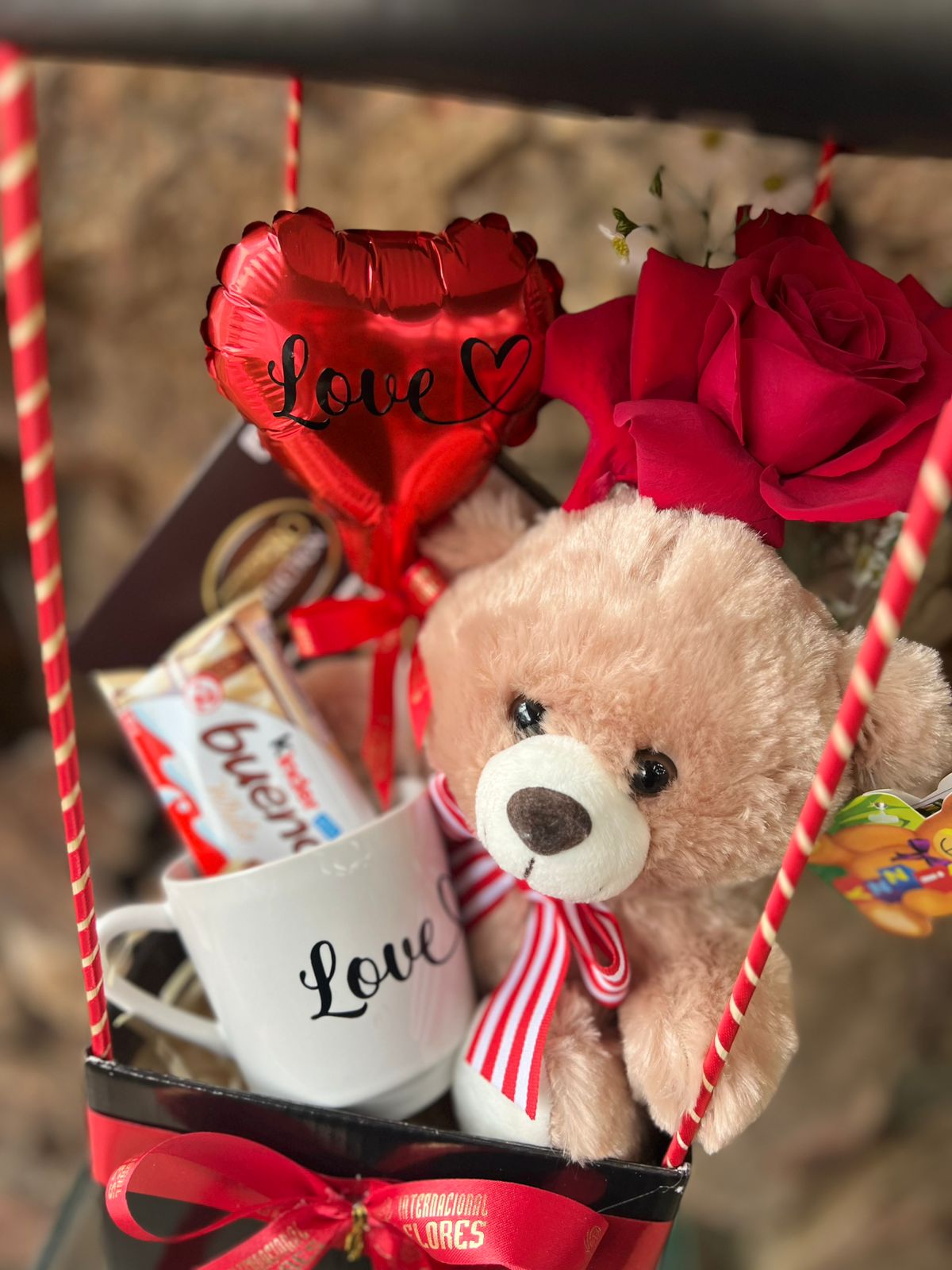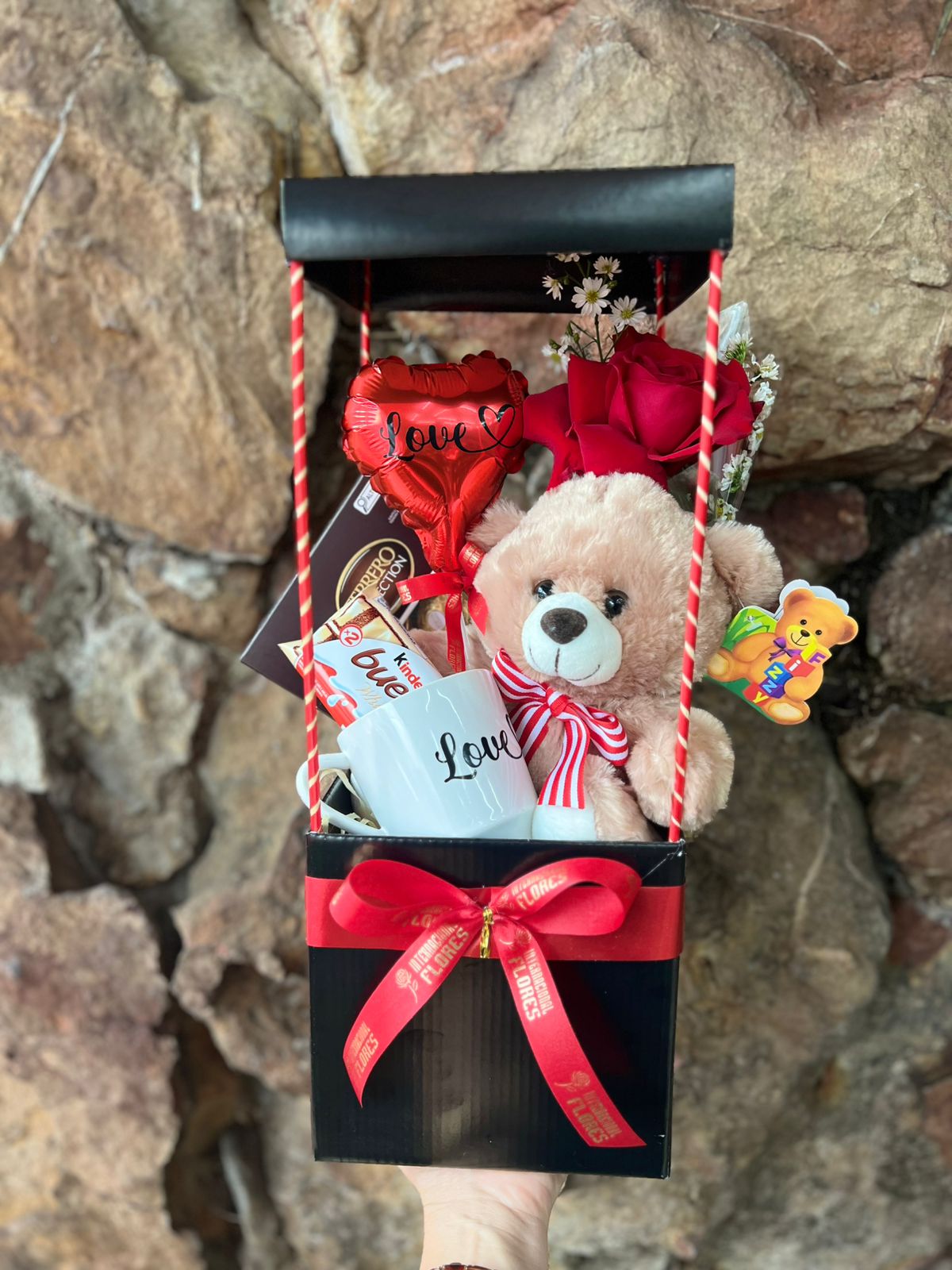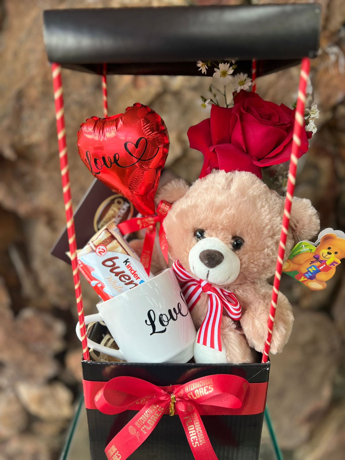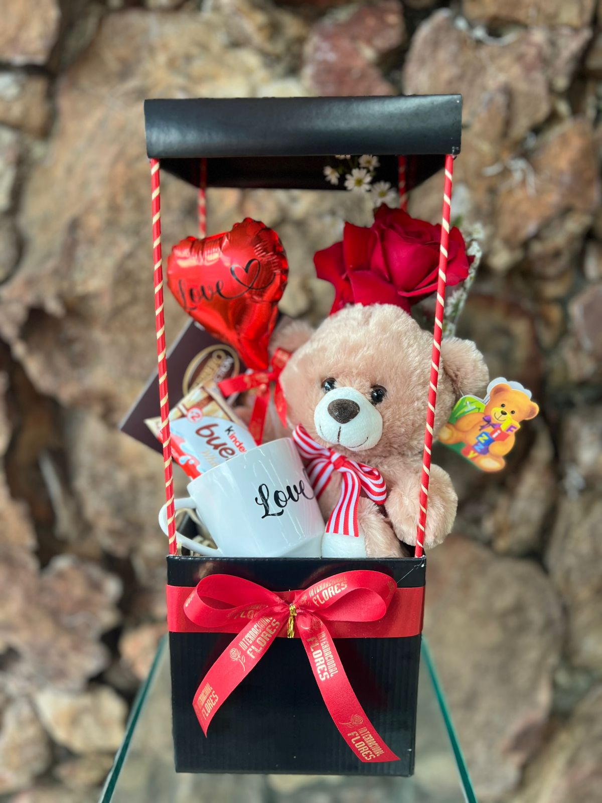 Box quadrada formato casinha acompanha Chocolate Ferrero Rocher Collection T7, Chocolate Kinder Bueno, Caneca porcelana com adesivo “Love”, ursinho Pelúcia, Balão 05” adesivo “Love” e uma Rosa Colombiana para presente.