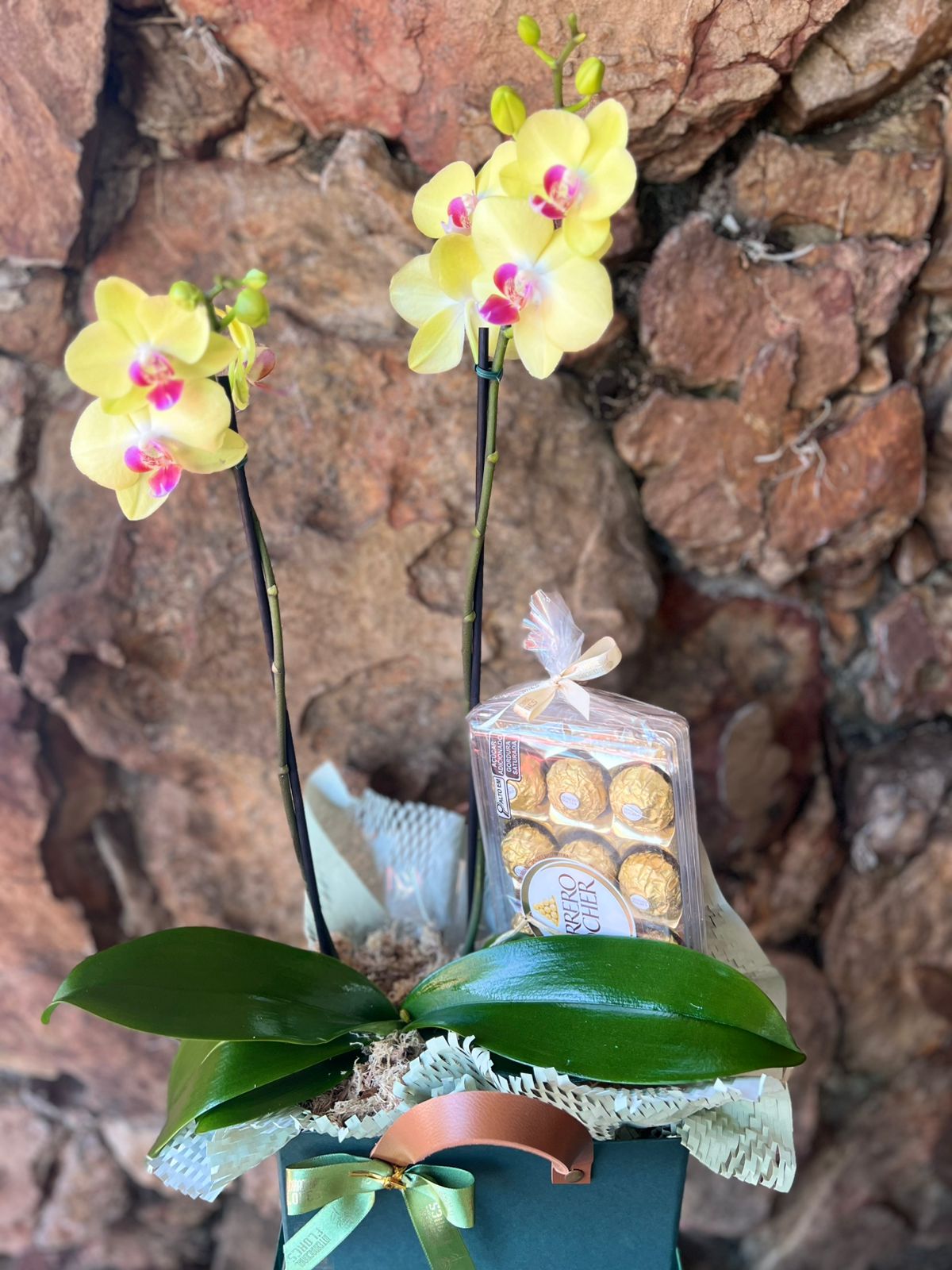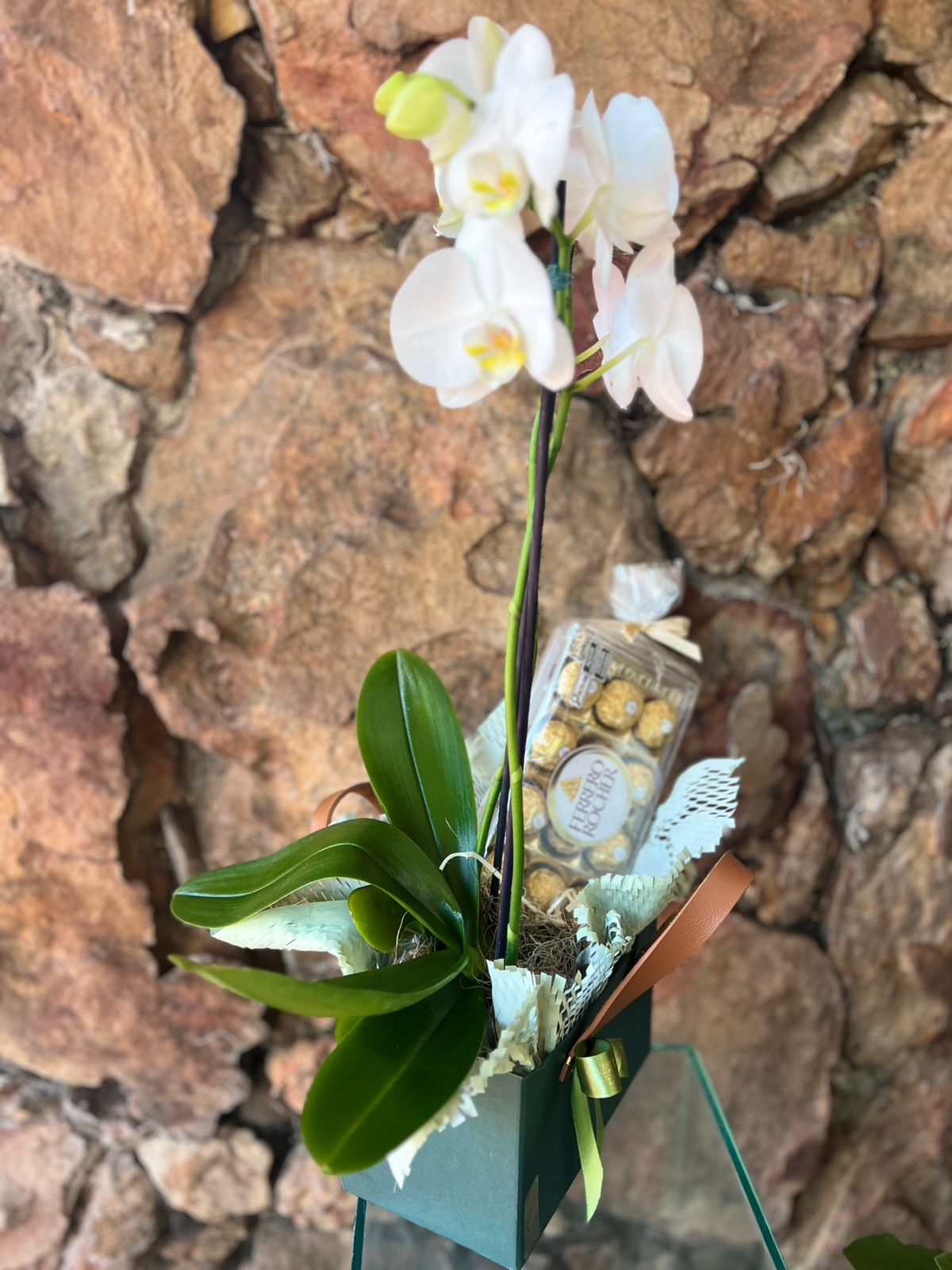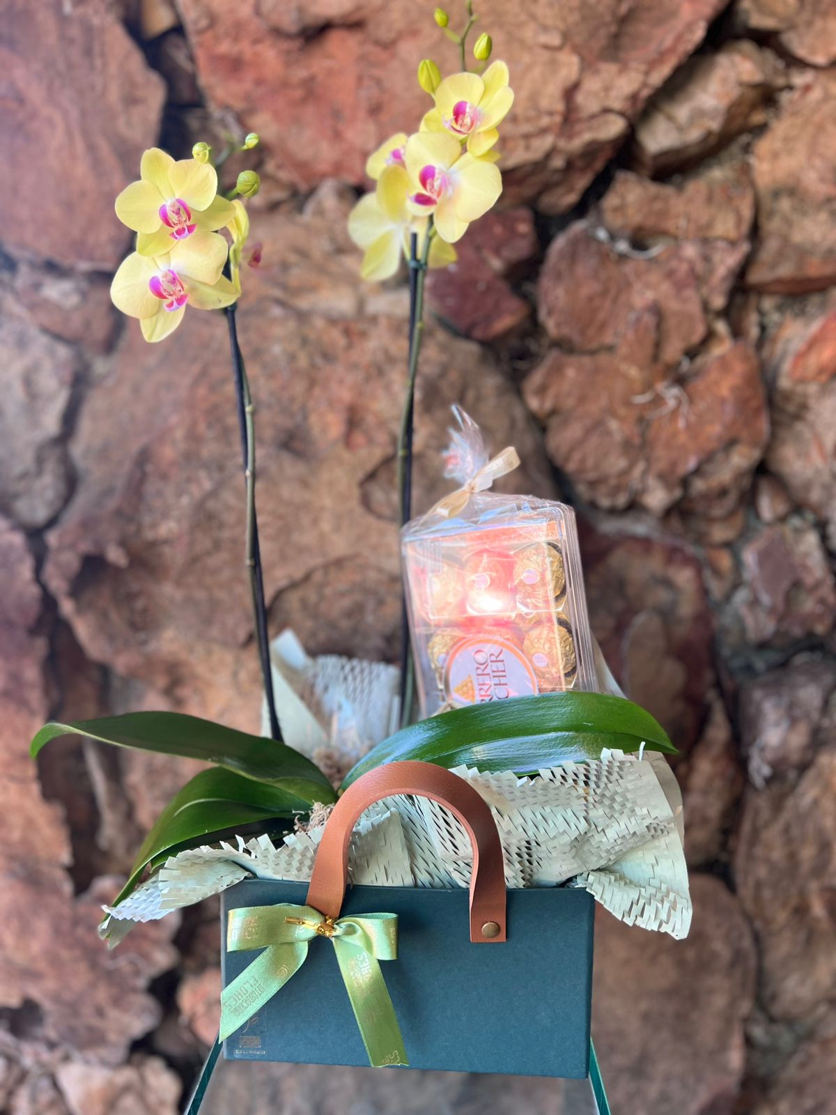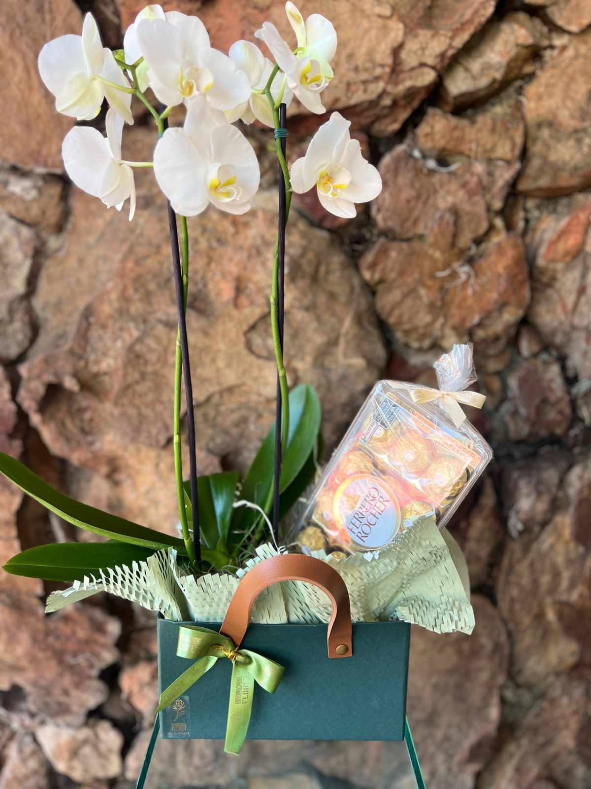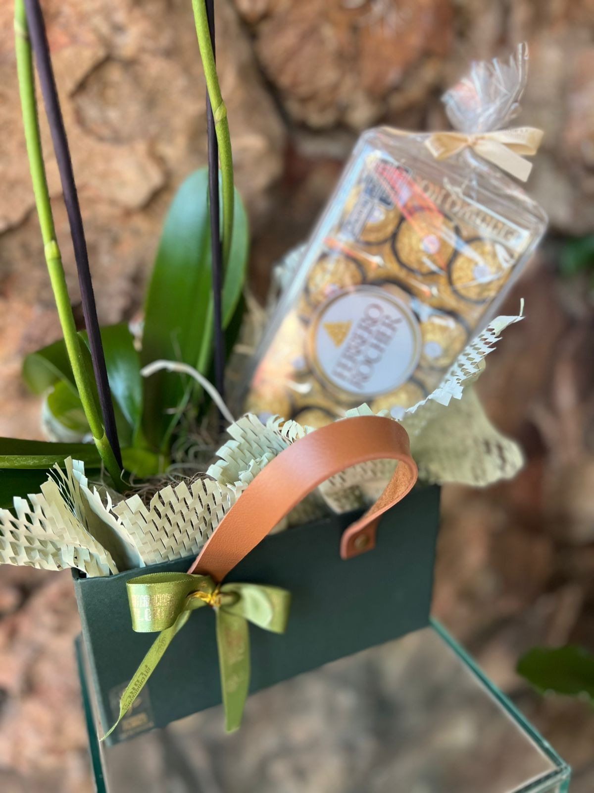 Uma diferente orquídea Phaleanopsis 2 hastes pote 12 (branca ou amarela) na box sacola com alça de couro medindo 22x12x12cm na verde musgo com caixa de chocolate Ferrero Rocher T12