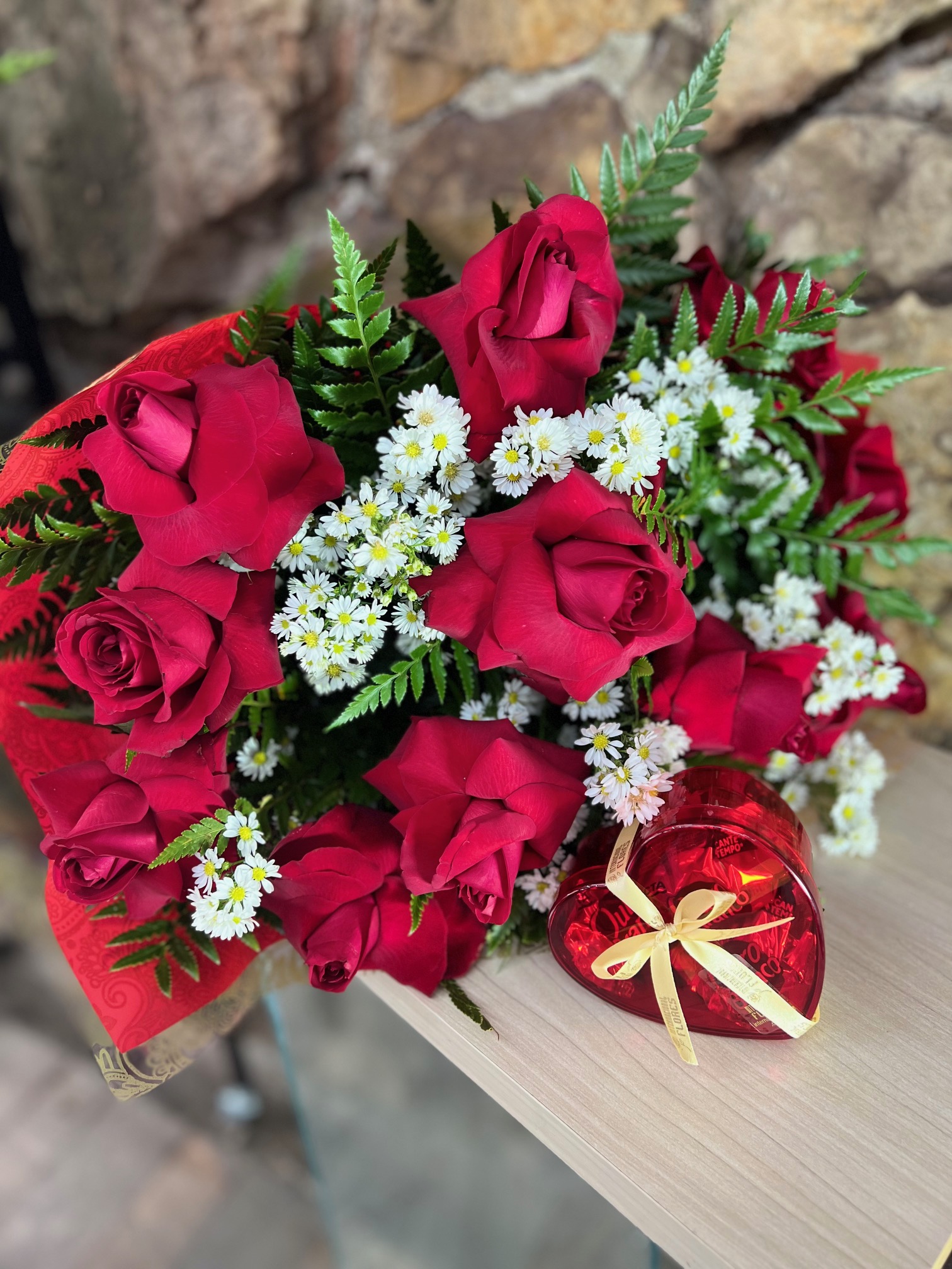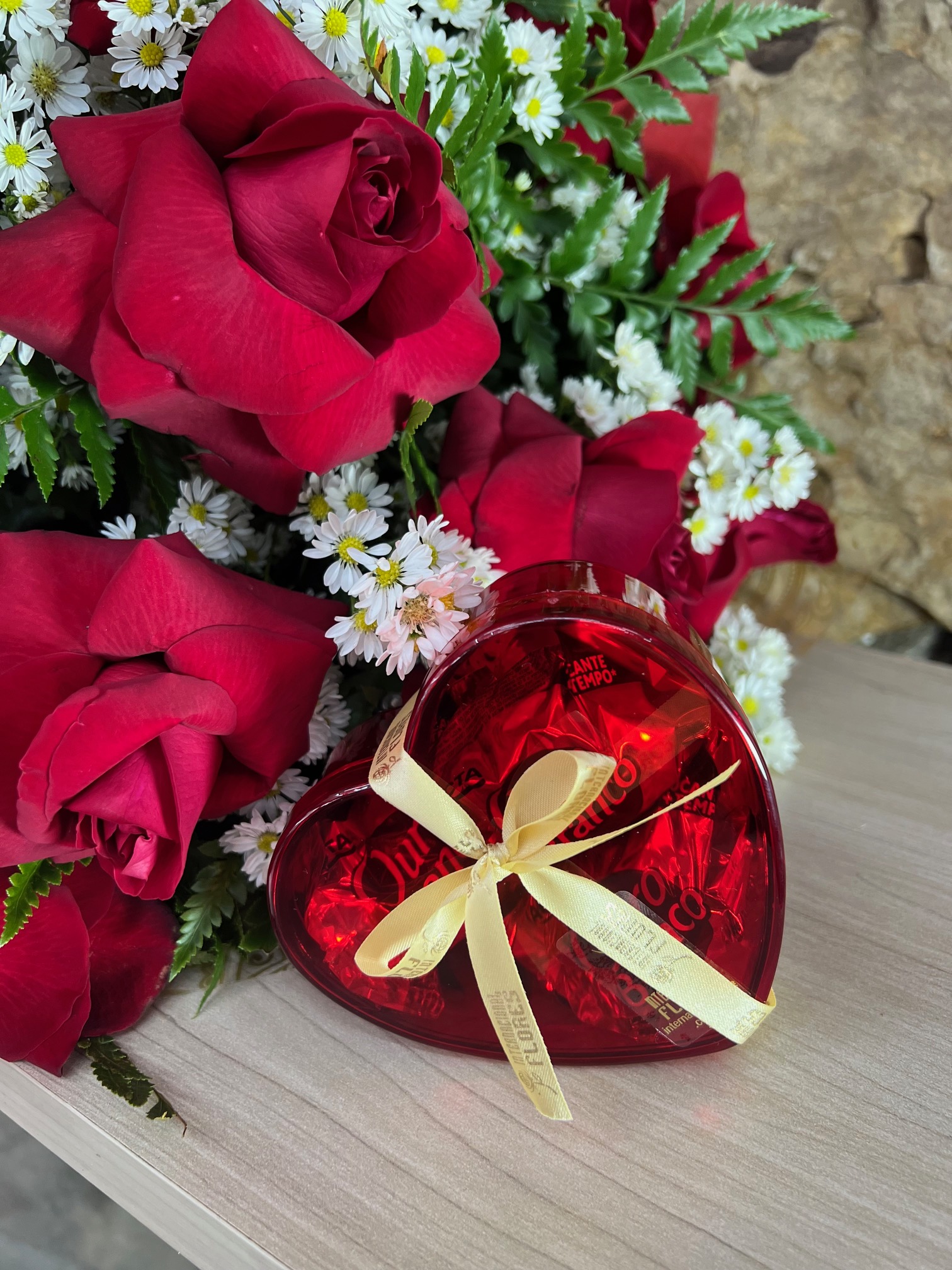Excelente buquê contendo 12 rosas colombianas vermelhas, complemento em áster e folhagens, envolto com papel especial e laço de fita, acompanha 1 caixa de acrílico de coração contendo 03 bombons (ouro branco OU sonho de valsa).