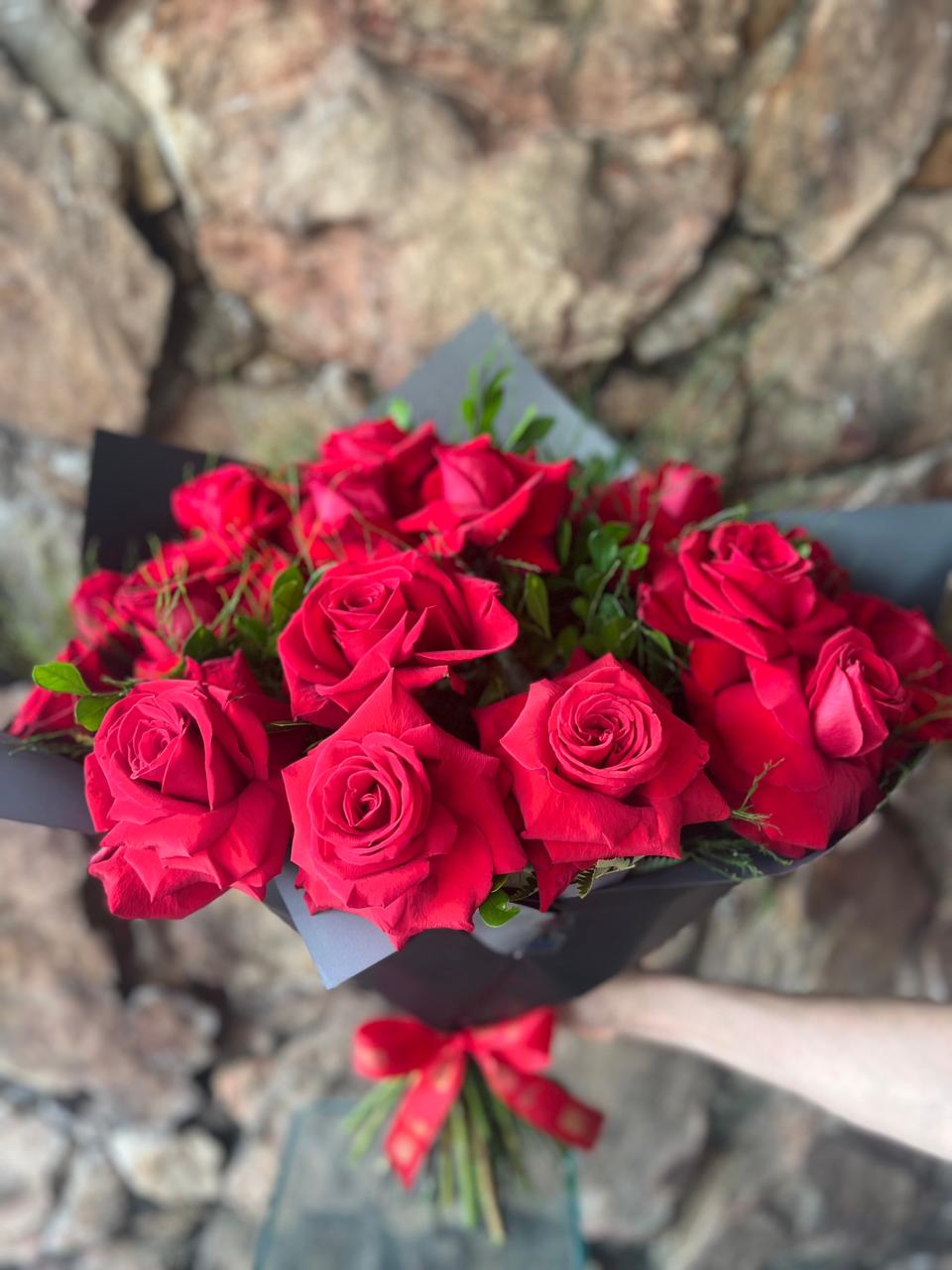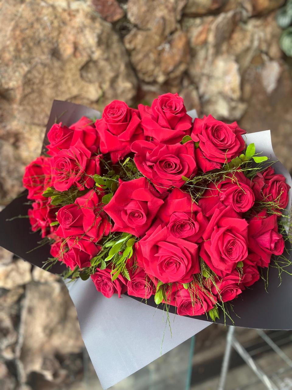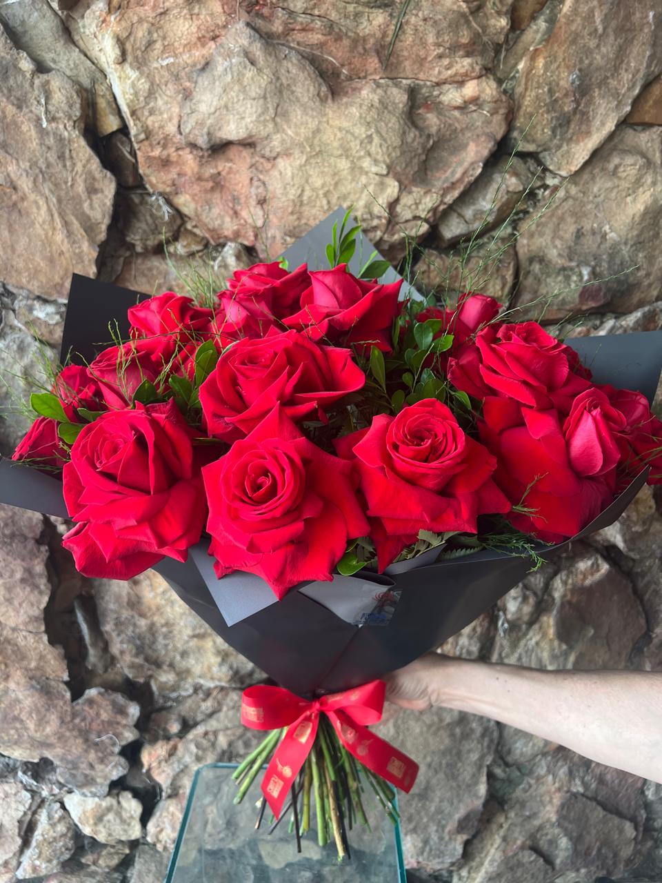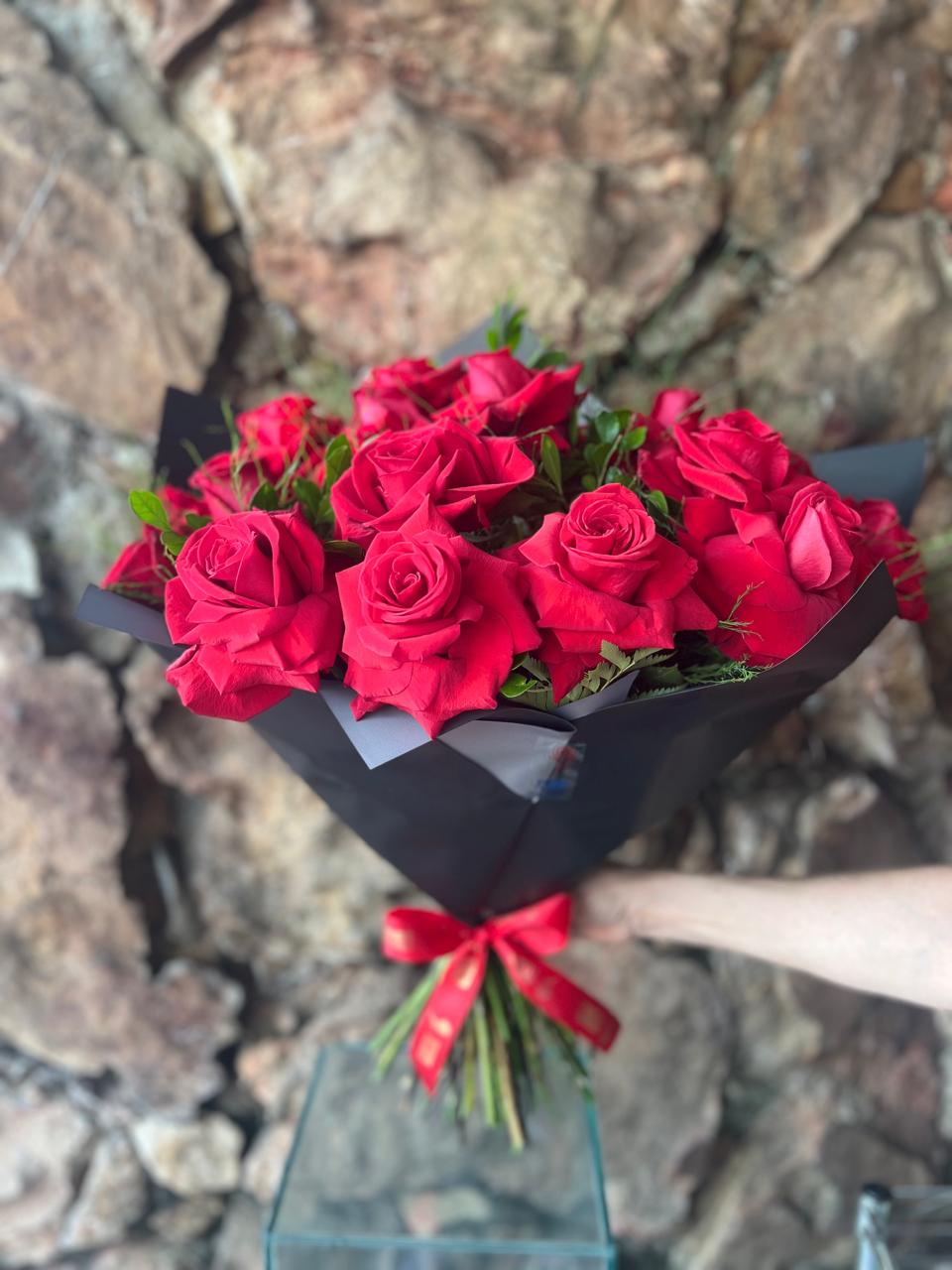 Buquê com 24 rosas colombianas vermelhas,  acabamento de folhagens, embalado para presente com papal especial black (preto).