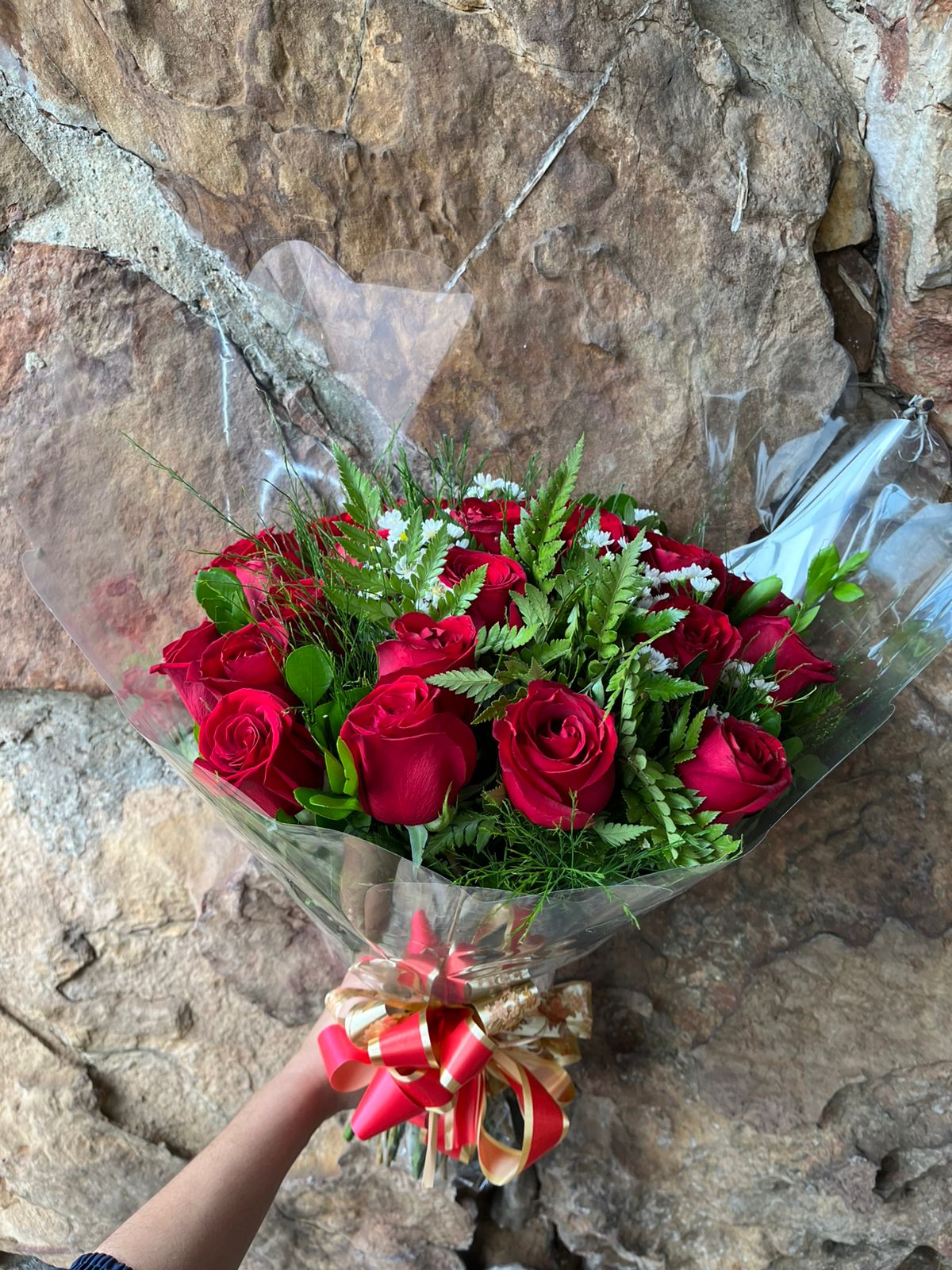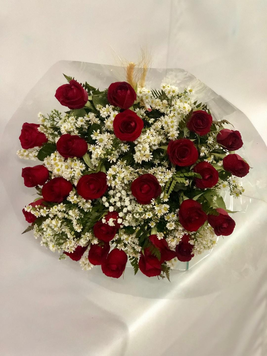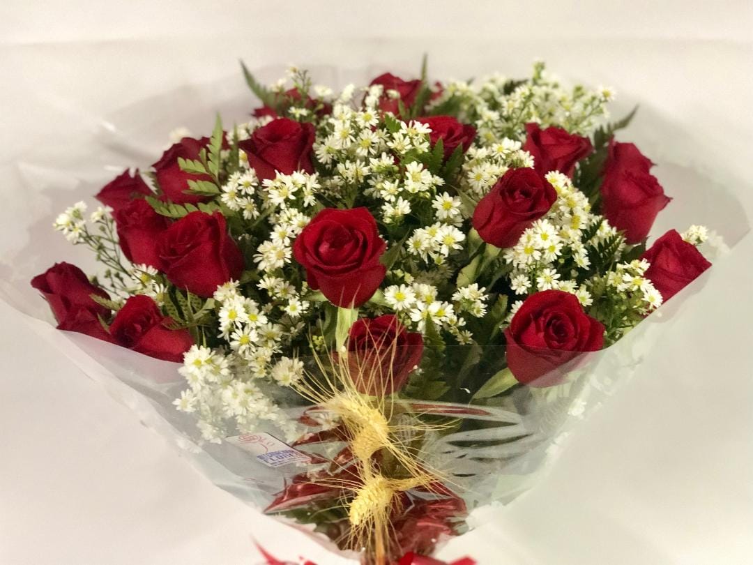 Lindo buquê com 24 rosas vermelhas nacional longa com folhagens e áster branco para compor, embalado com papel celofane transparente, trico e laço de fita especial.