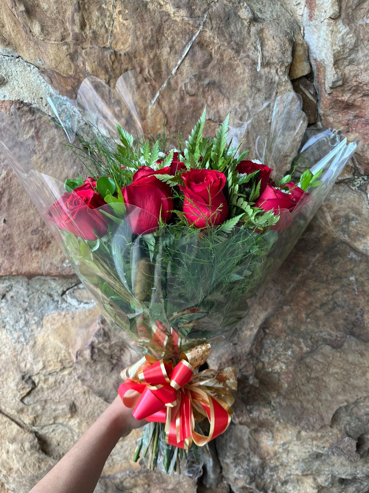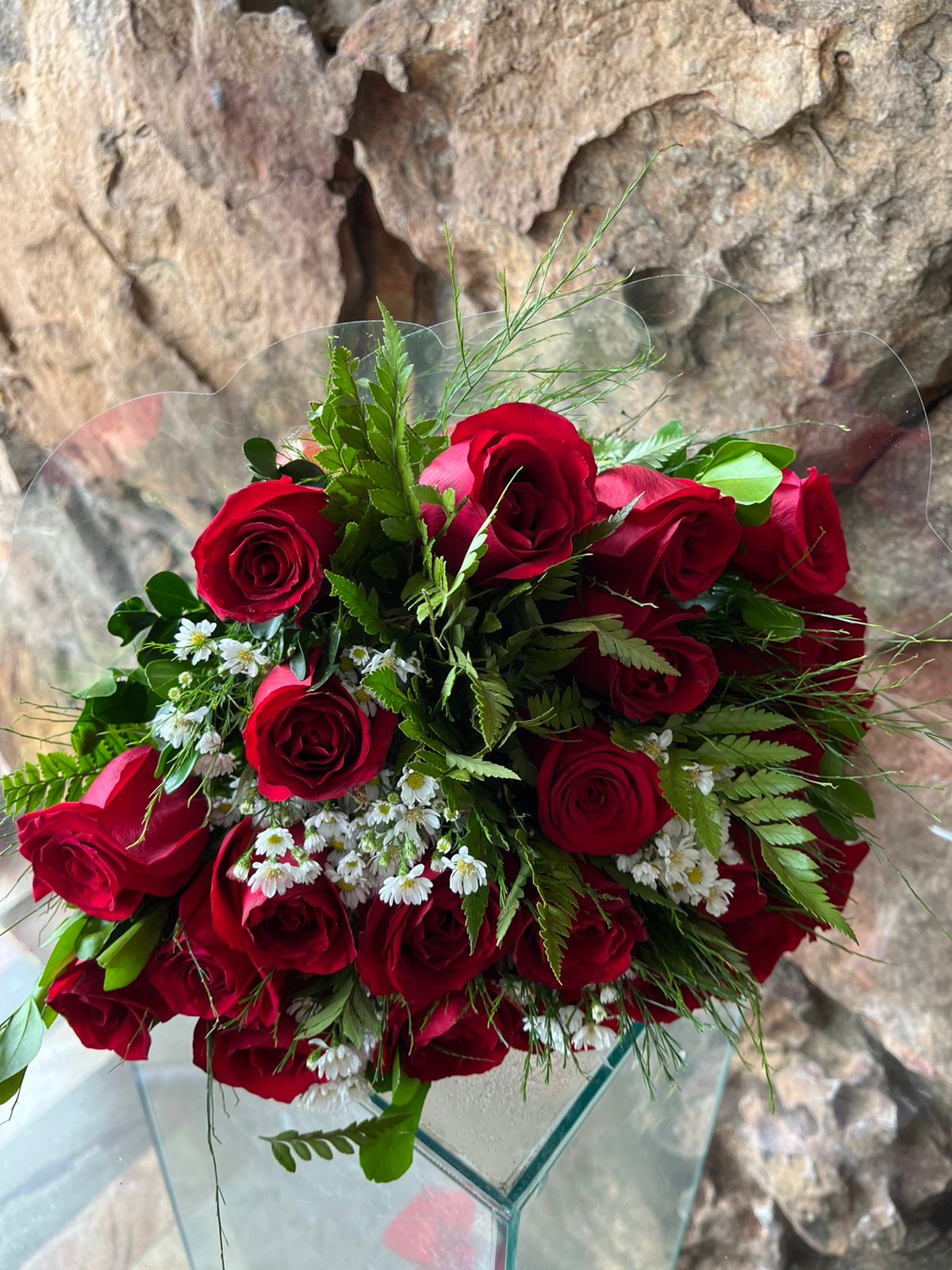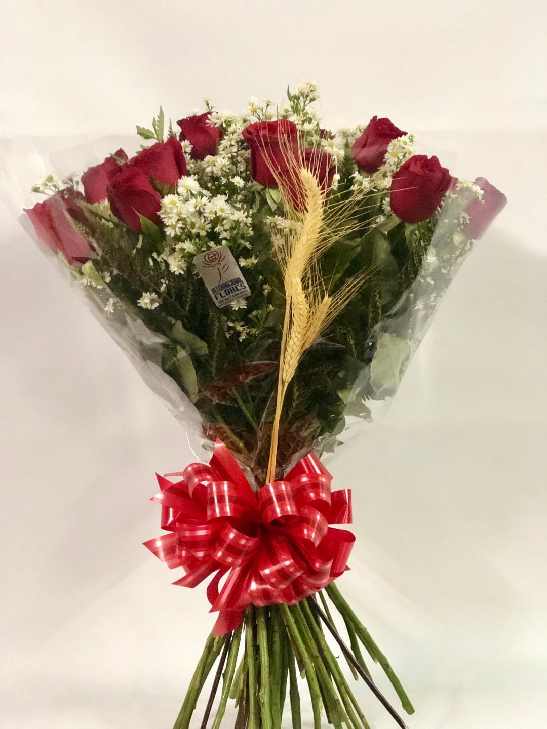 Lindo buquê com 24 rosas vermelhas nacional longa com folhagens e áster branco para compor, embalado com papel celofane transparente, trico e laço de fita especial.