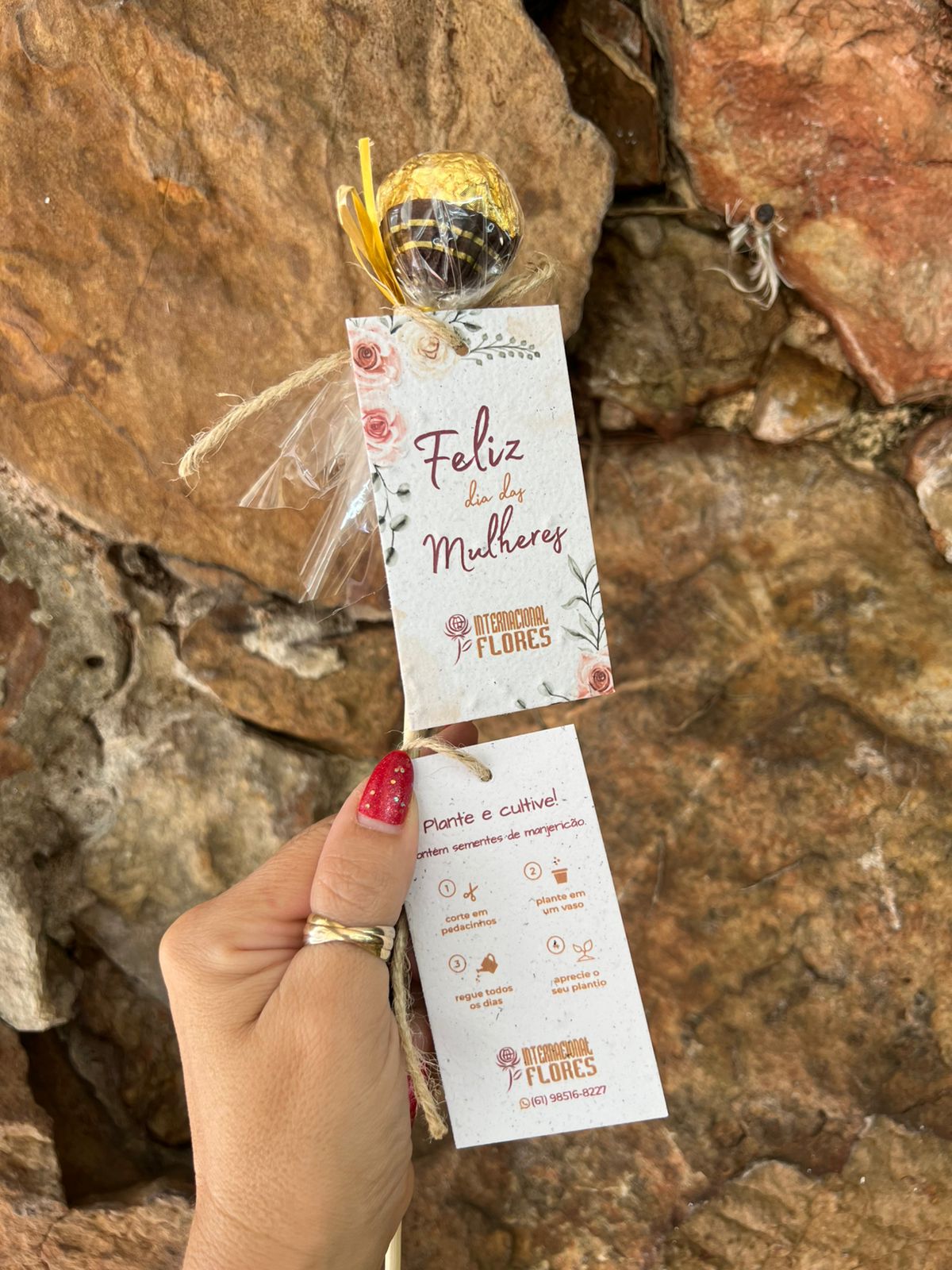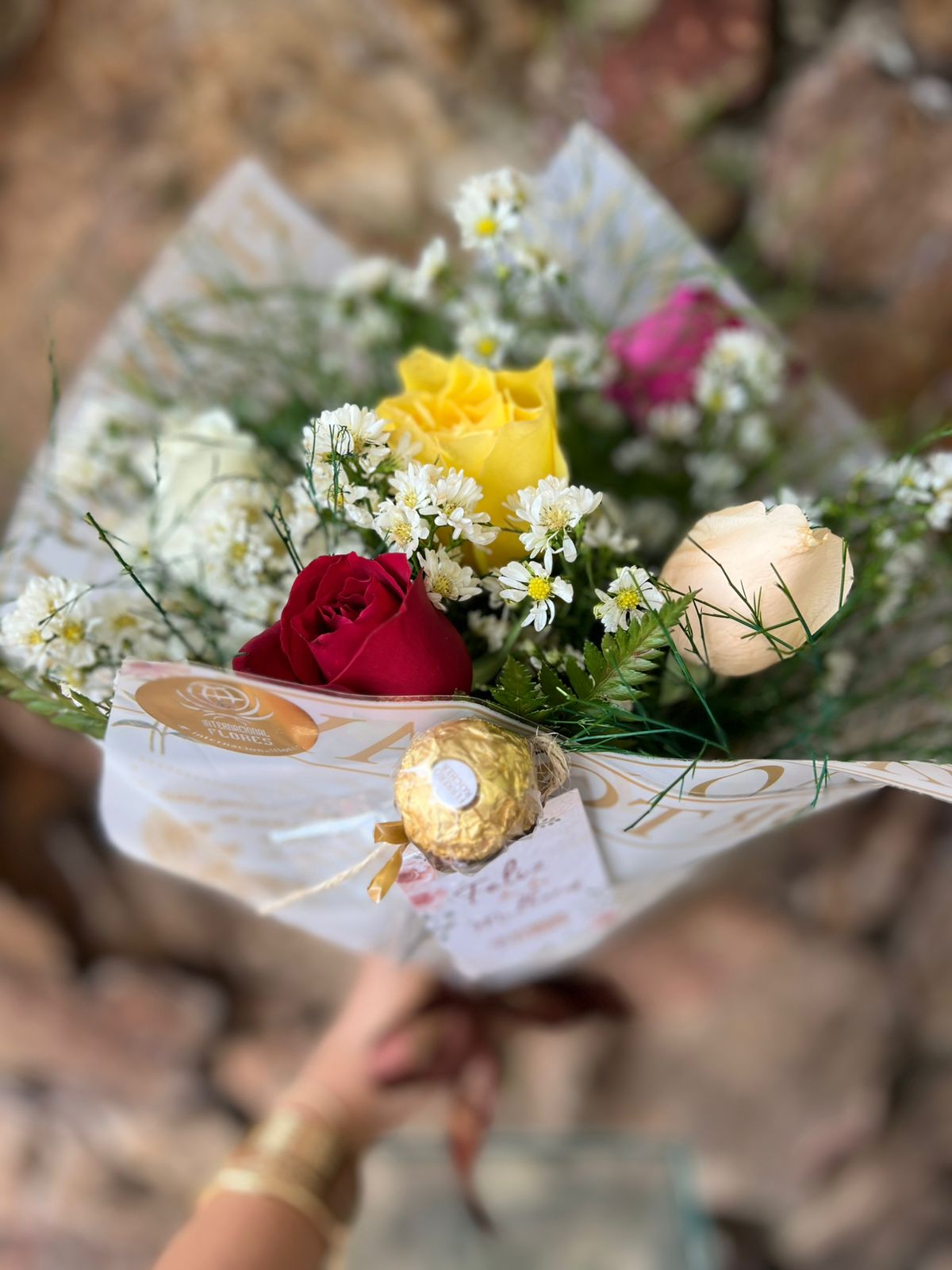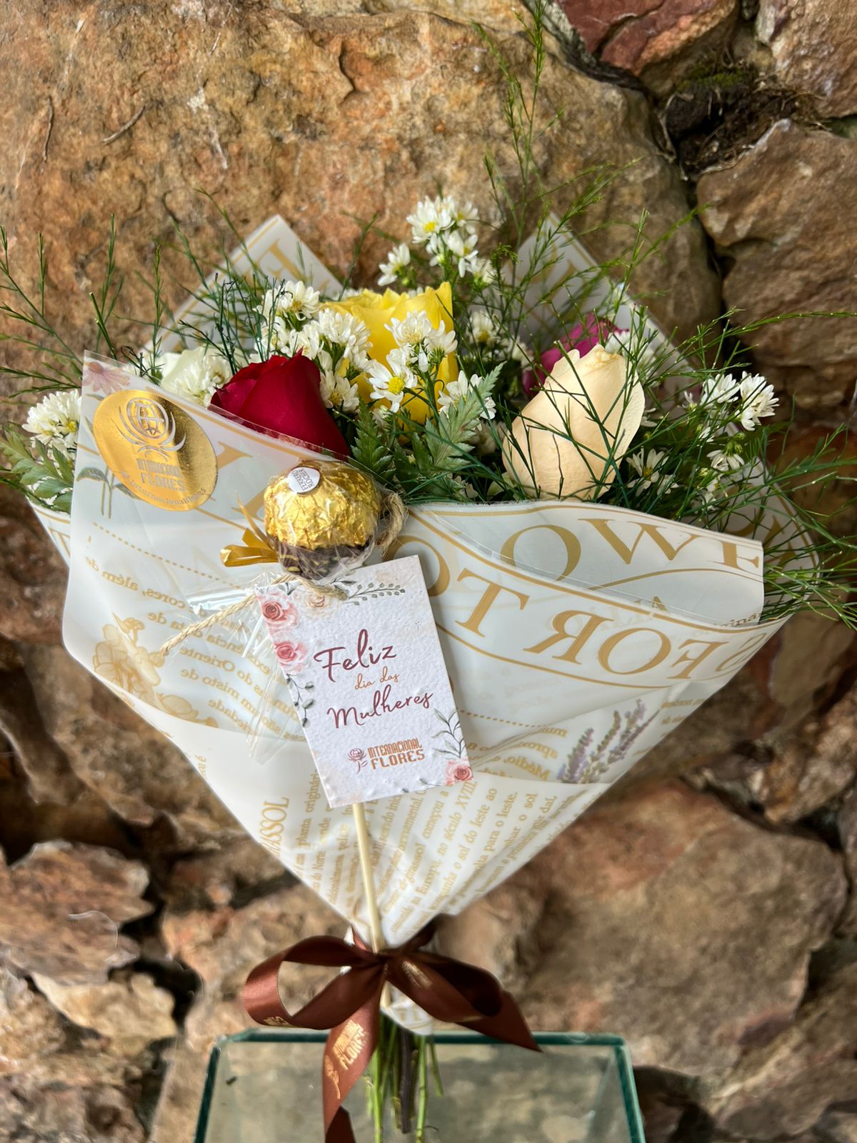 Buquê contendo 5 rosas nacionais coloridas (as tonalidades e cores podem variar conforme estoque), complemento em áster branco e folhagens, envolto em papel especial “Flowers” (com descritivos de várias flores) e laço de fita de cetim. Acompanha 01palito de bombom Ferrero Rocher com Tag ecológica para plantio de “manjericão”.