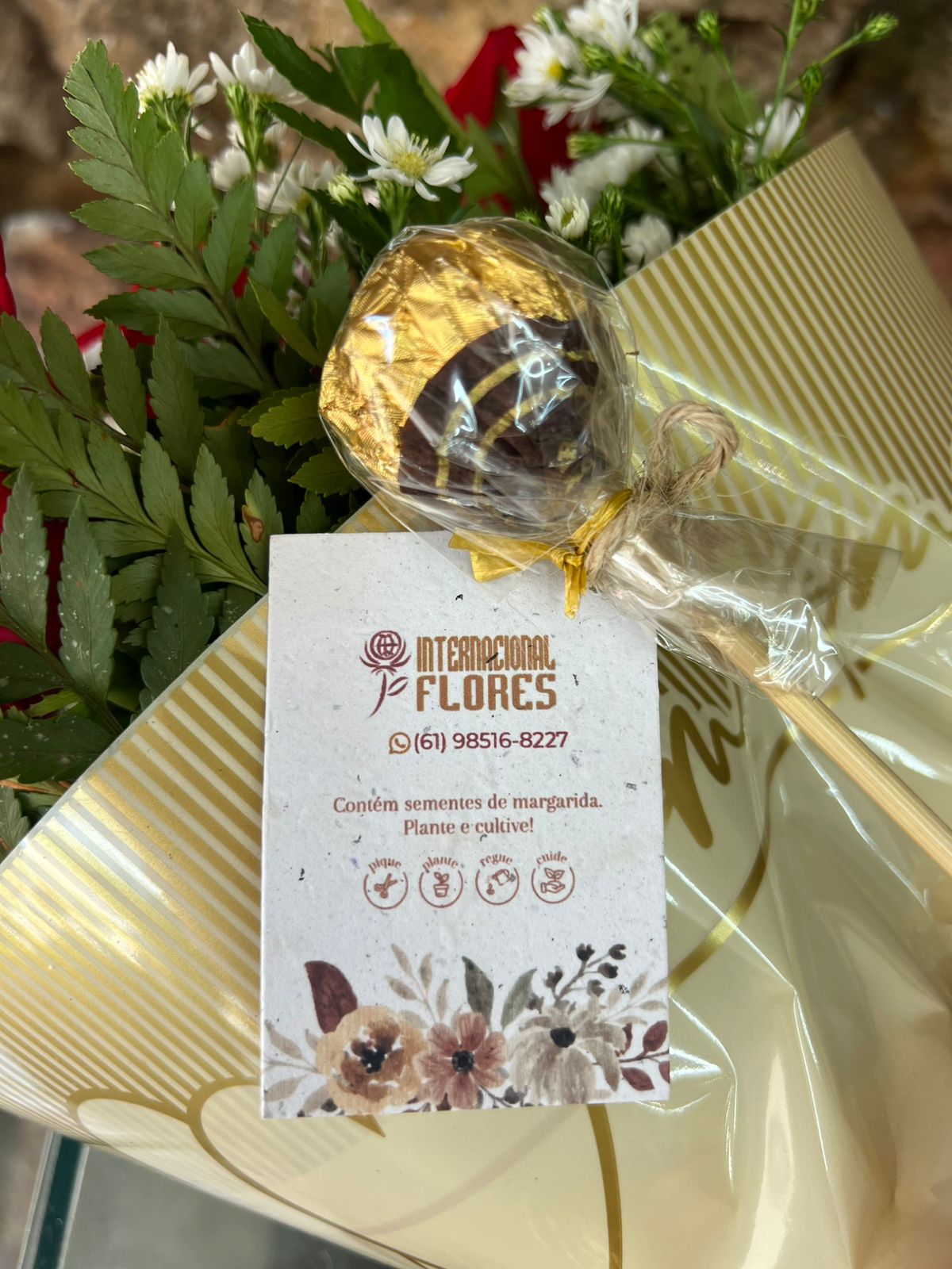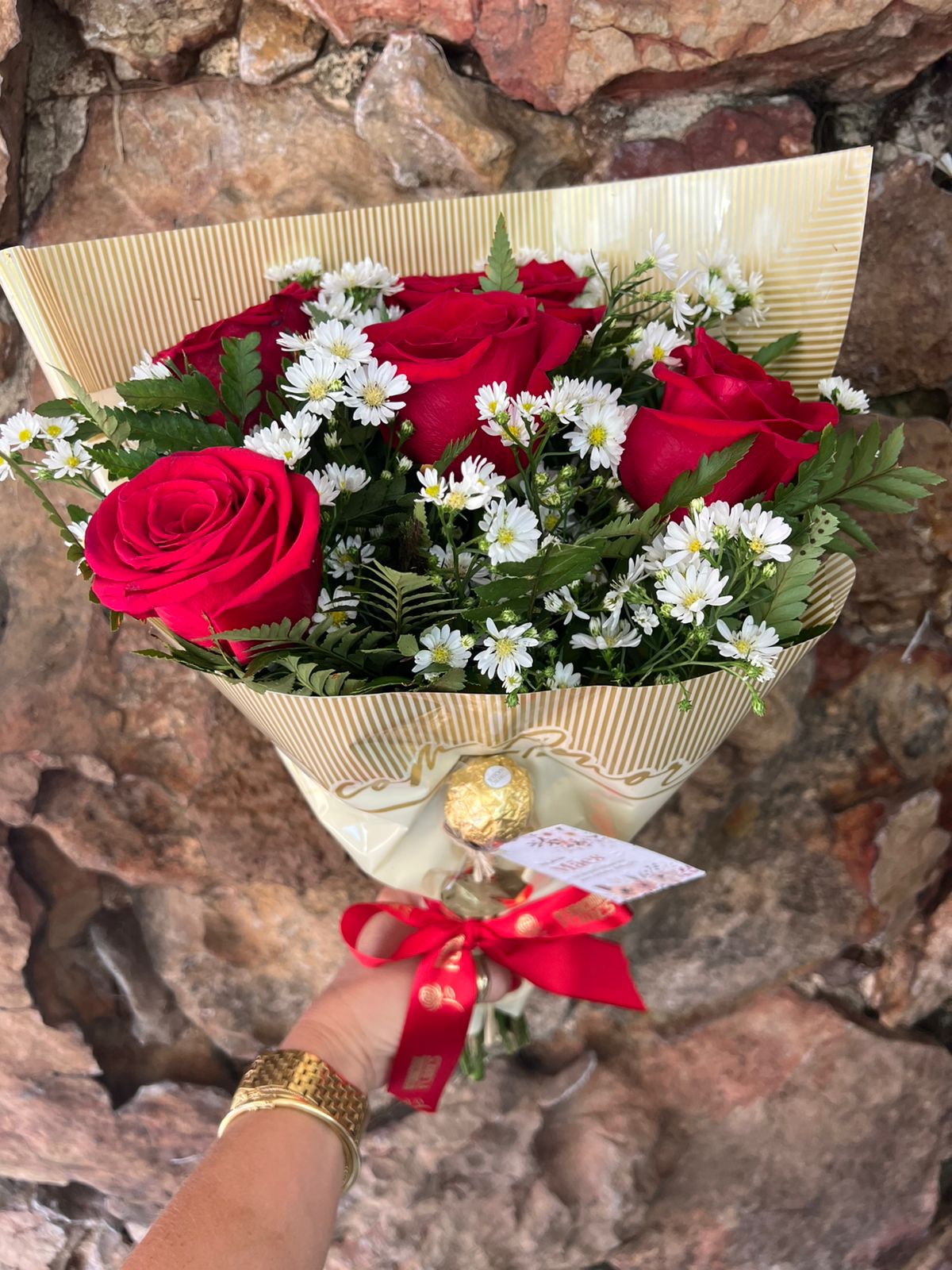 Buquê contendo 5 rosas nacionais vermelhas complemento em áster branco e folhagens, envolto em papel especial “Com Amor” e laço de fita de cetim. Acompanha 01palito de bombom Ferrero Rocher com Tag ecológica para plantio de “margaridas”.