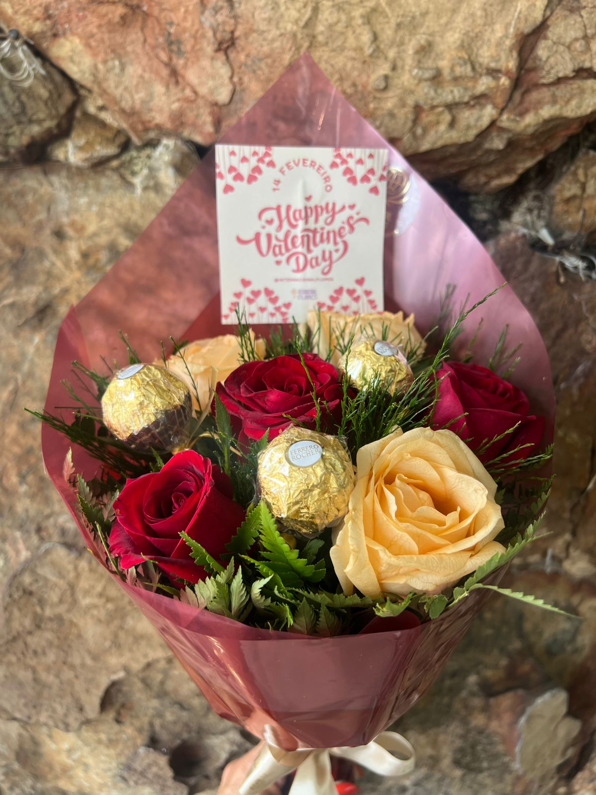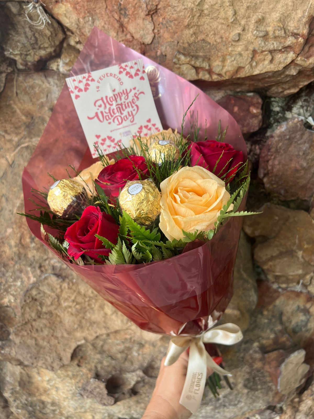 Buquê com 6 rosas nacional sendo 3 rosas vermelhas e 3 rosas chá complemento em folhagens diversas mais 3 palitos de bombom chocolate Ferrero Rocher envolto com papel especial, laço de cetim e etiqueta, acompanha paquinha “Happy Valentine’s Day”