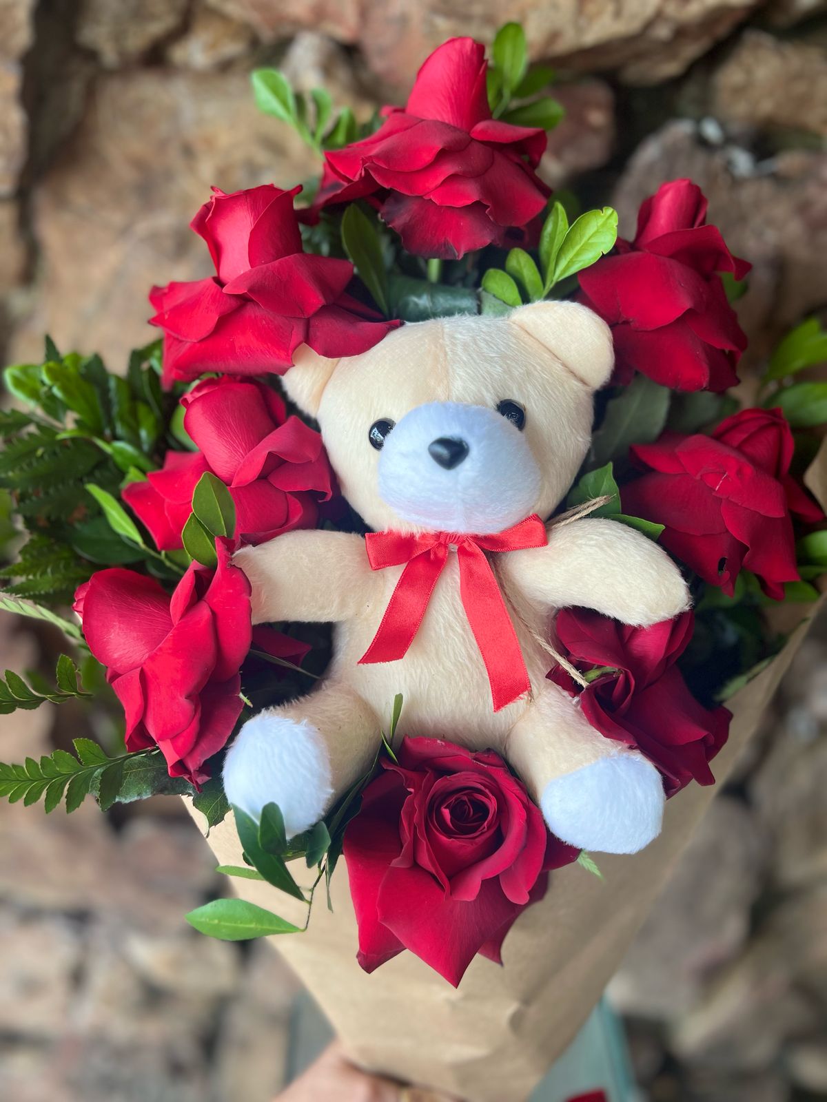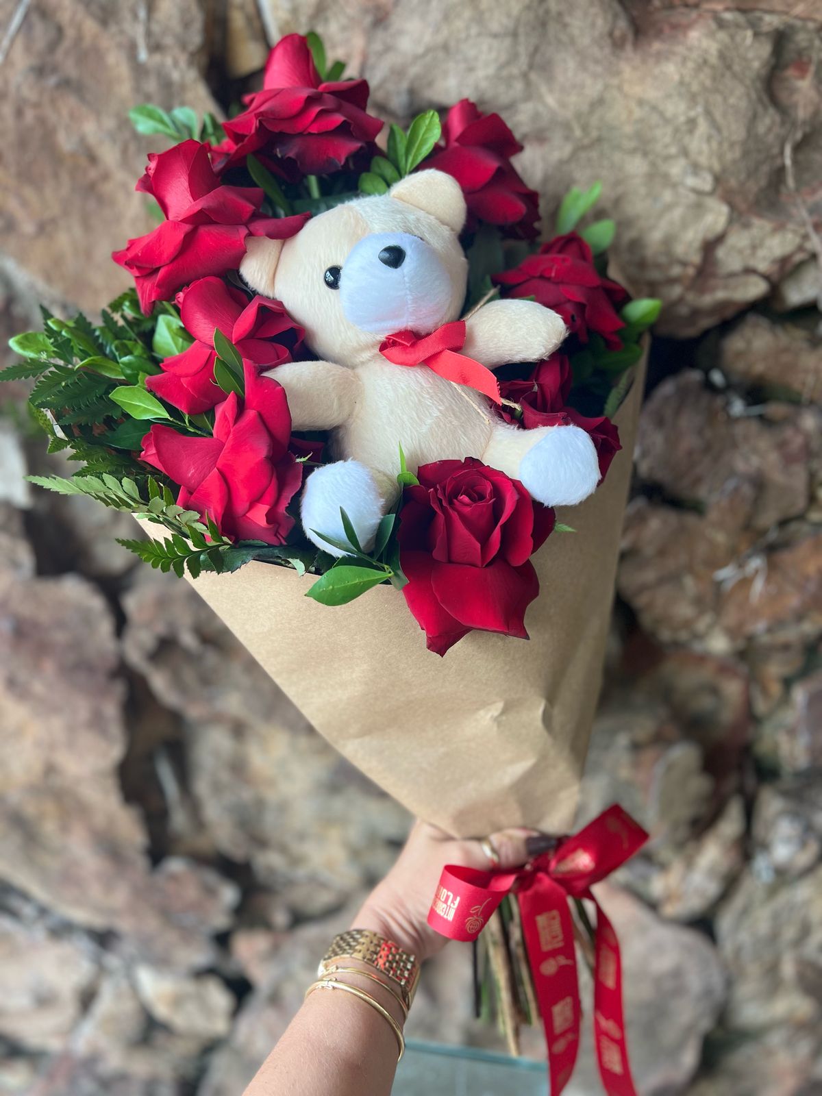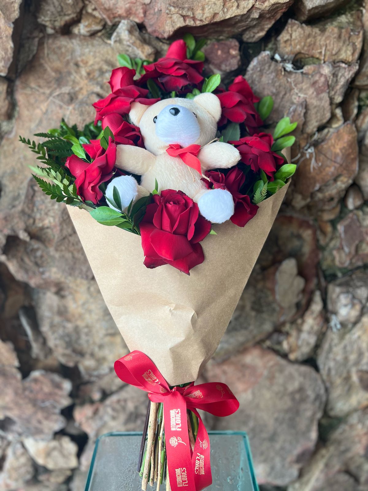 Diferente buquê formato braçada com 8 rosas colombinas e ursinho de pelúcia no meio, envolto com papel kraft
