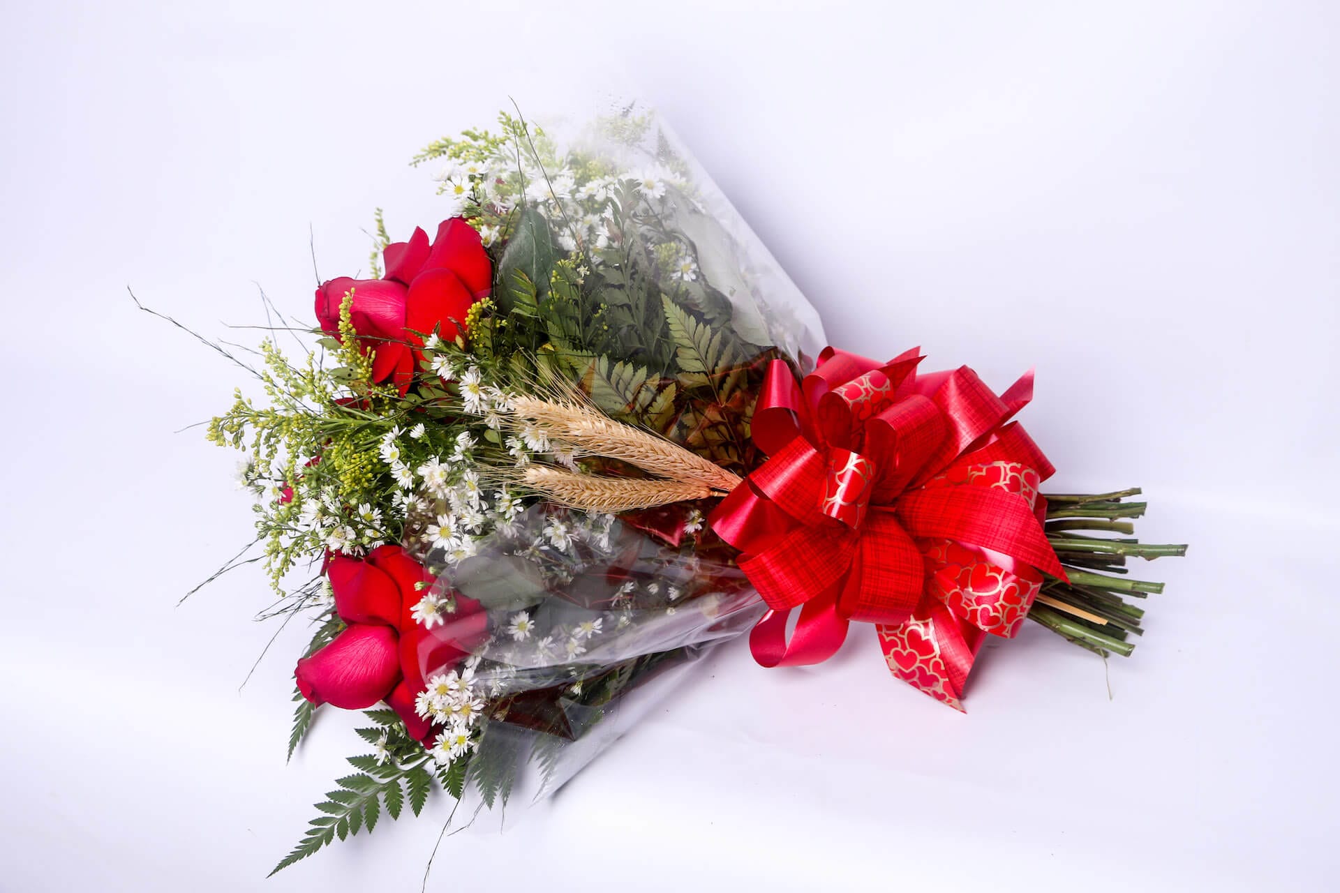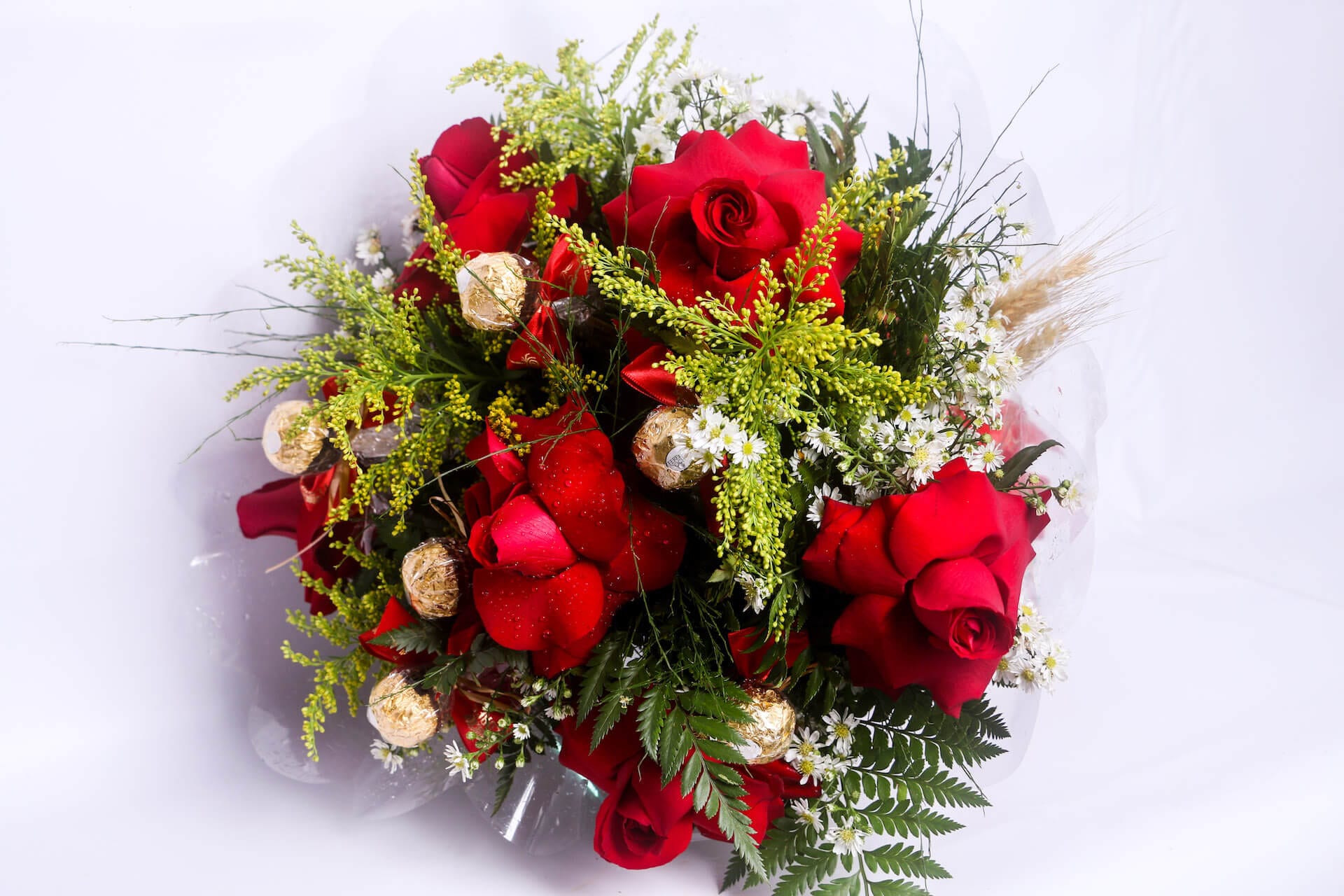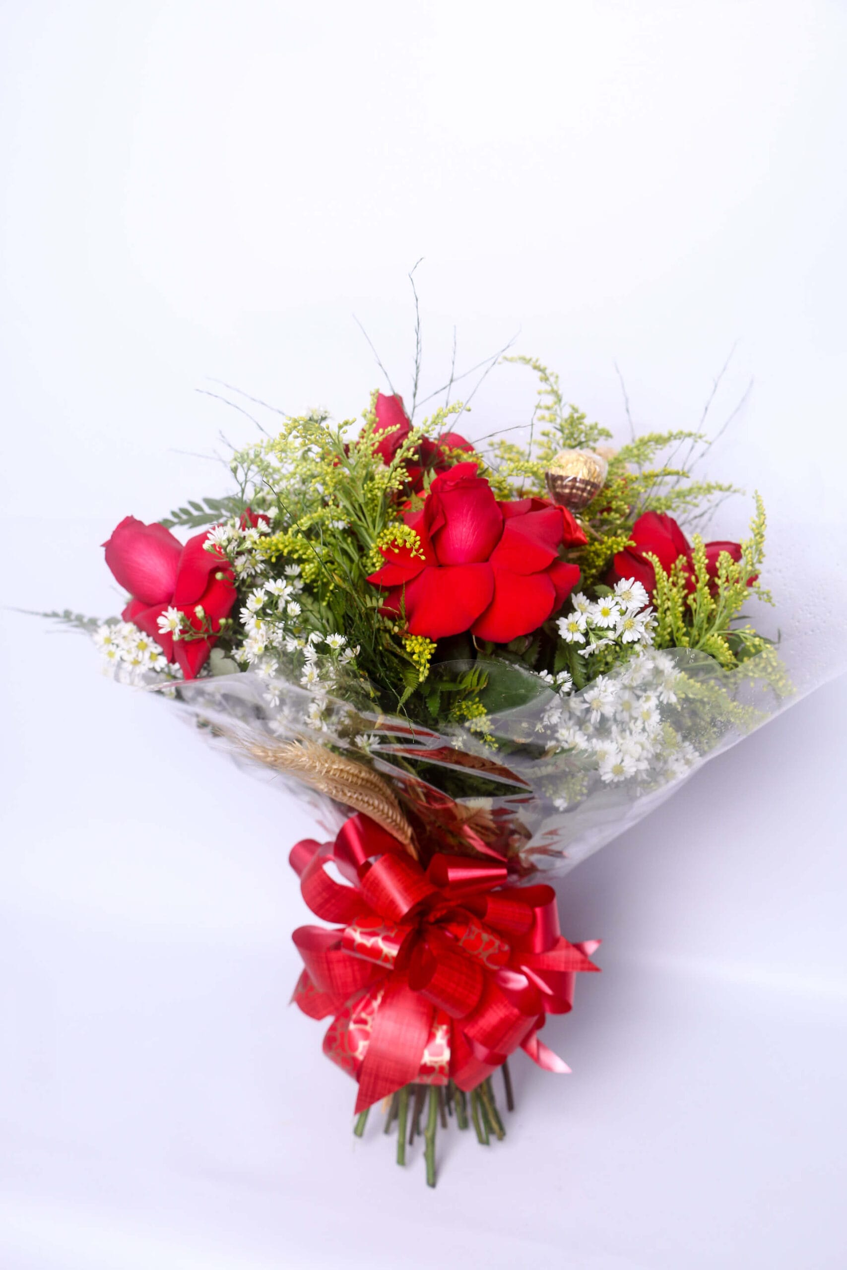 Buque com 06 rosas colombianas vermelhas no crepom OU celofane, com laço de fita, e seis deliciosos bombons Ferrero Rocher, com lacinho.