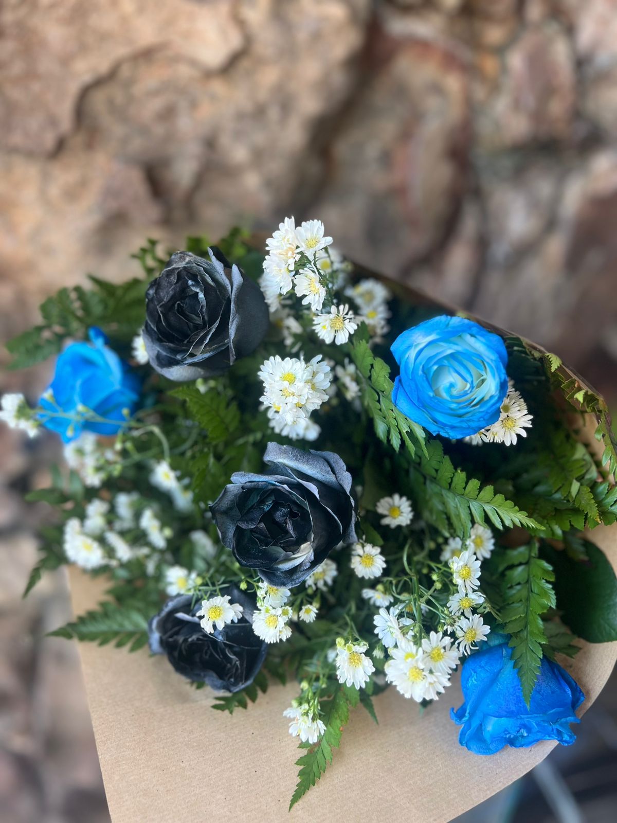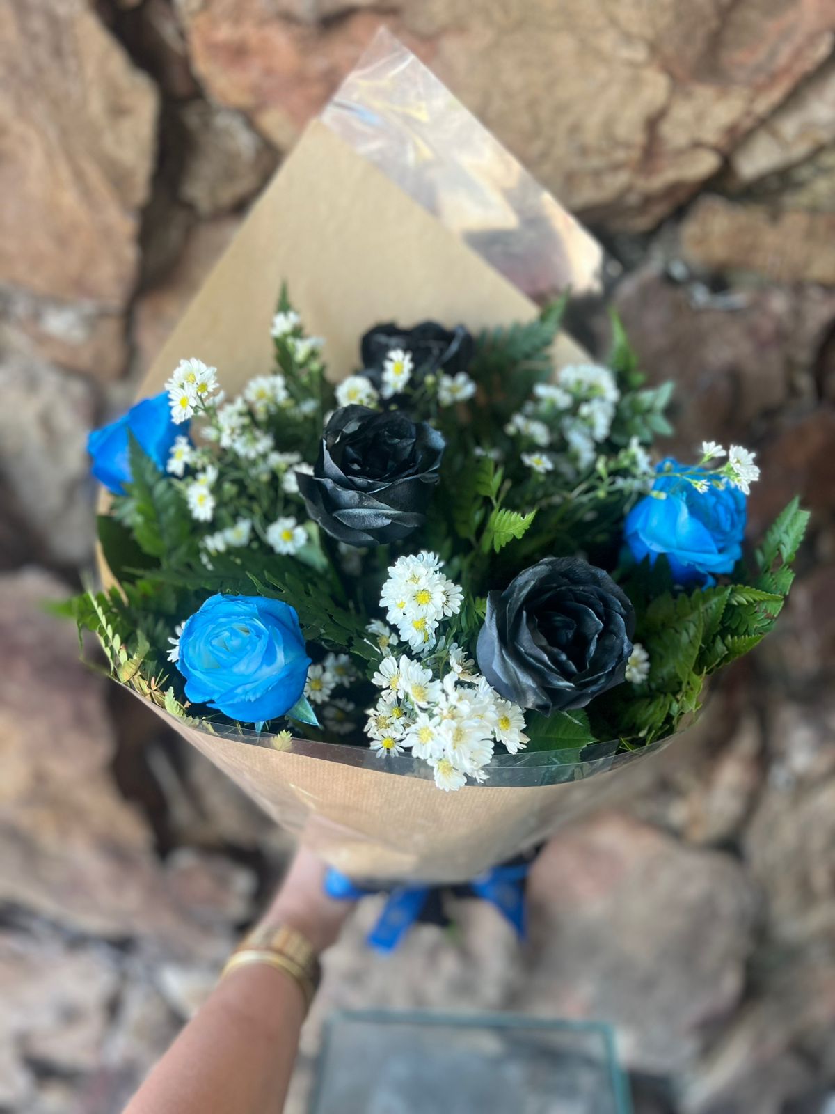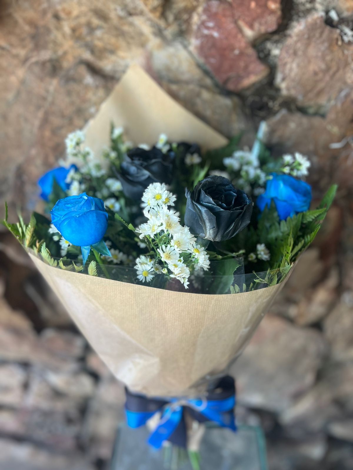 Buquê confeccionado com 6 rosas pintadas com spray especial sendo 3 rosas pretas e 3 rosas azul complementos em folhagens e áster branco envolto com papel kraft e celofane com laço de fita especial