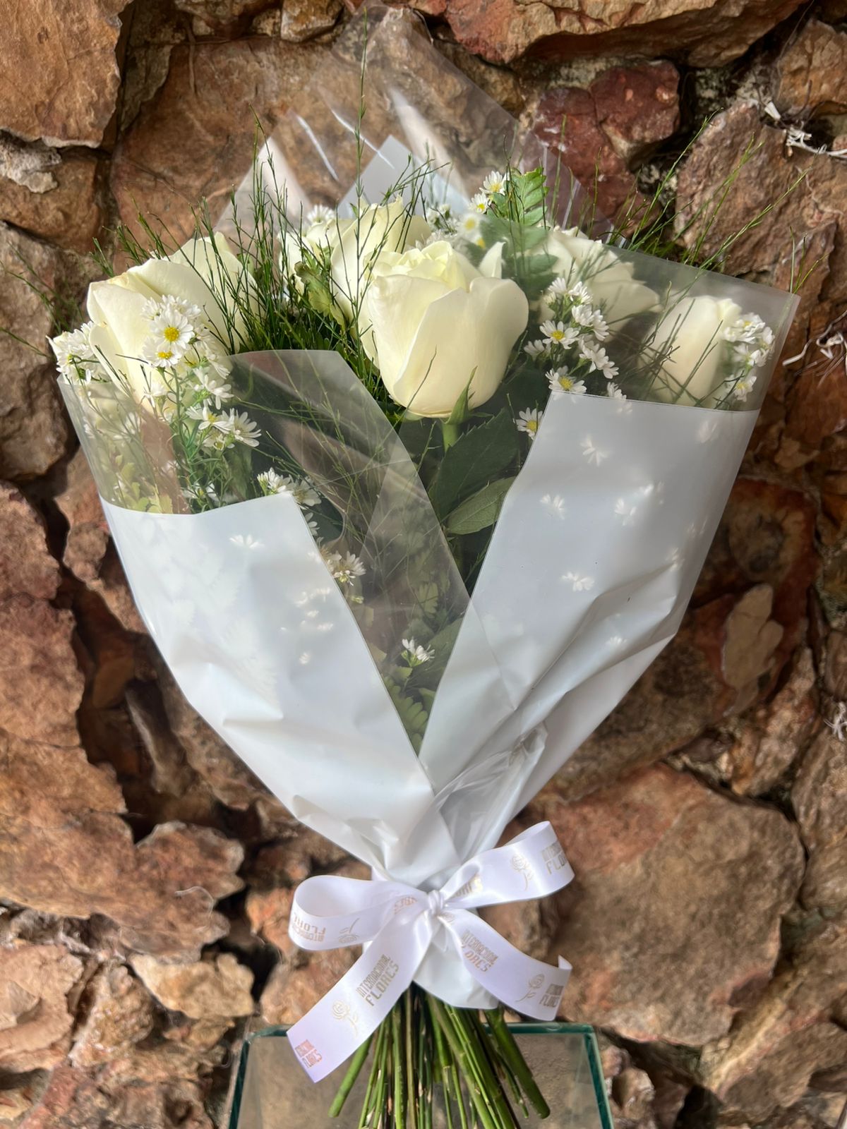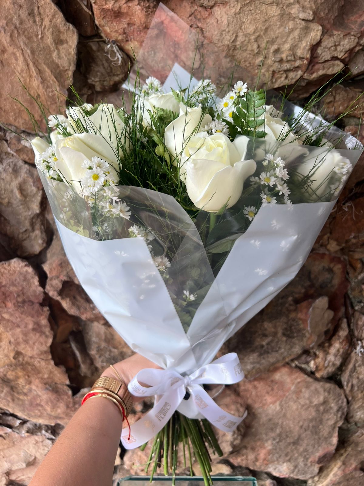 Um leve buquê com 12 rosas nacionais brancas com acabamento em folhagem e áster, envolvido com papel celofane transparente OU papel especial e laço de fita na cor disponível que componha o arranjo.