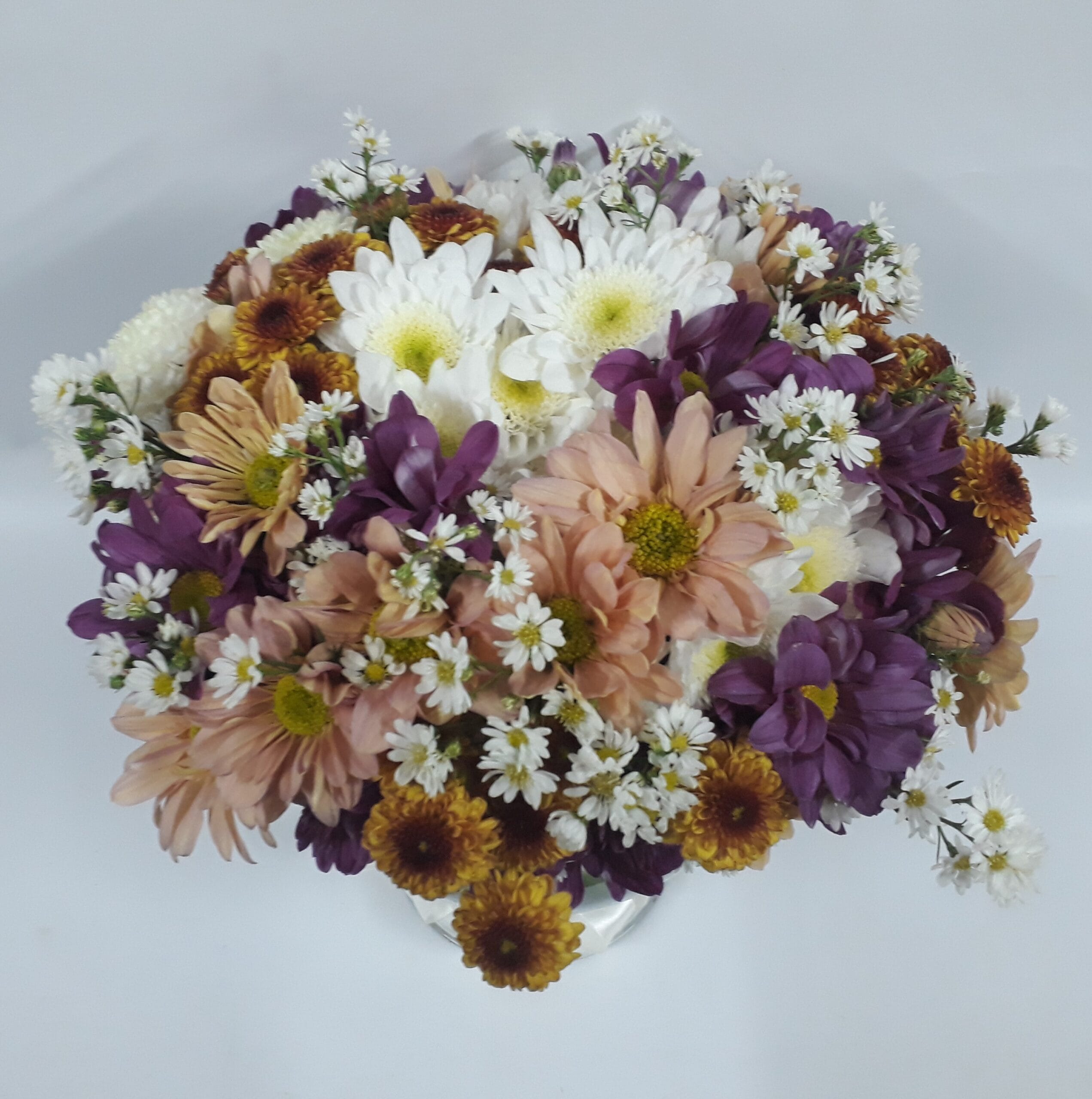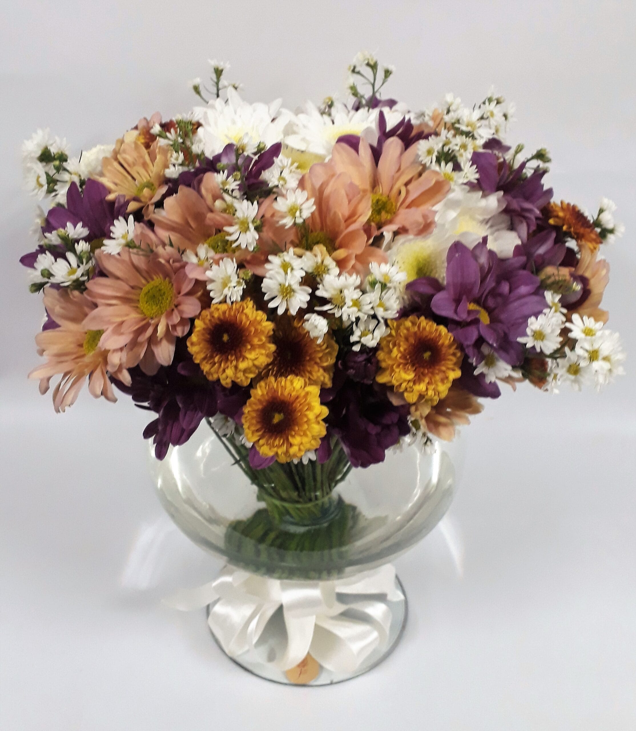 Buquê especial em flores do campo mistas e áster, dentro de vaso de vidro de aproximadamente 20 cm de altura (VIDRO PODE VARIAR DE ACORDO COM ESTOQUE)