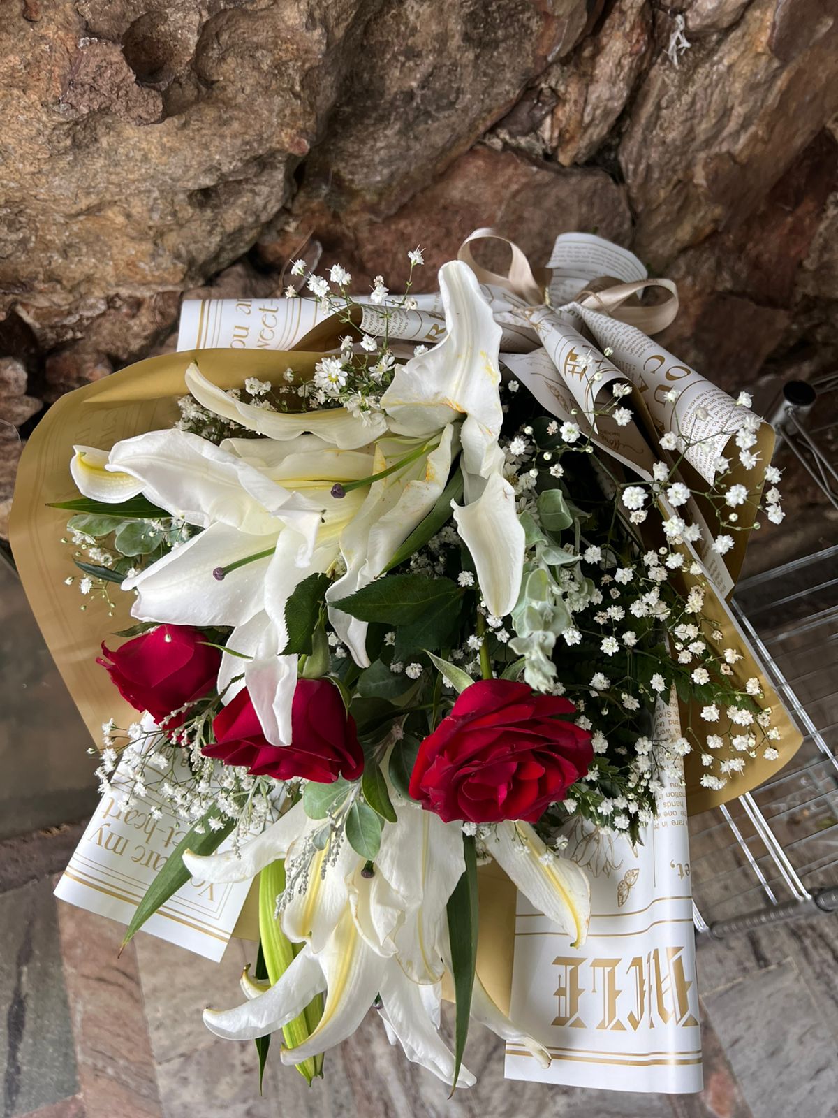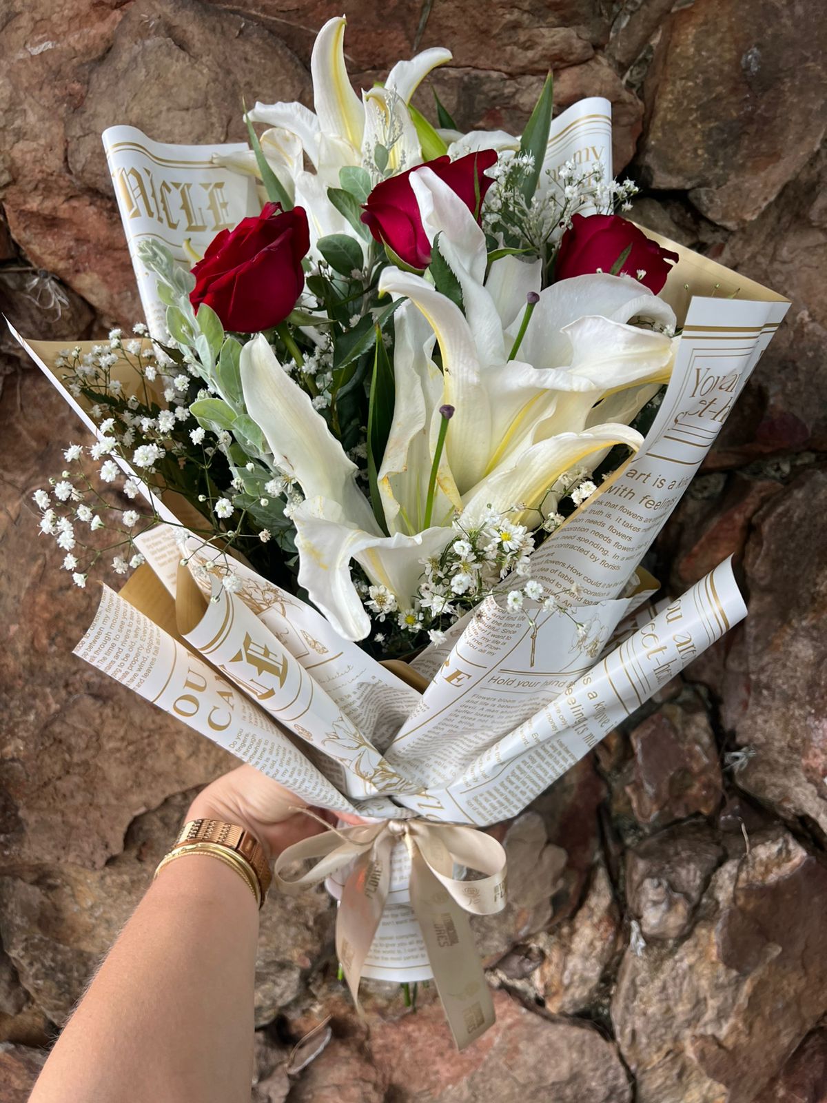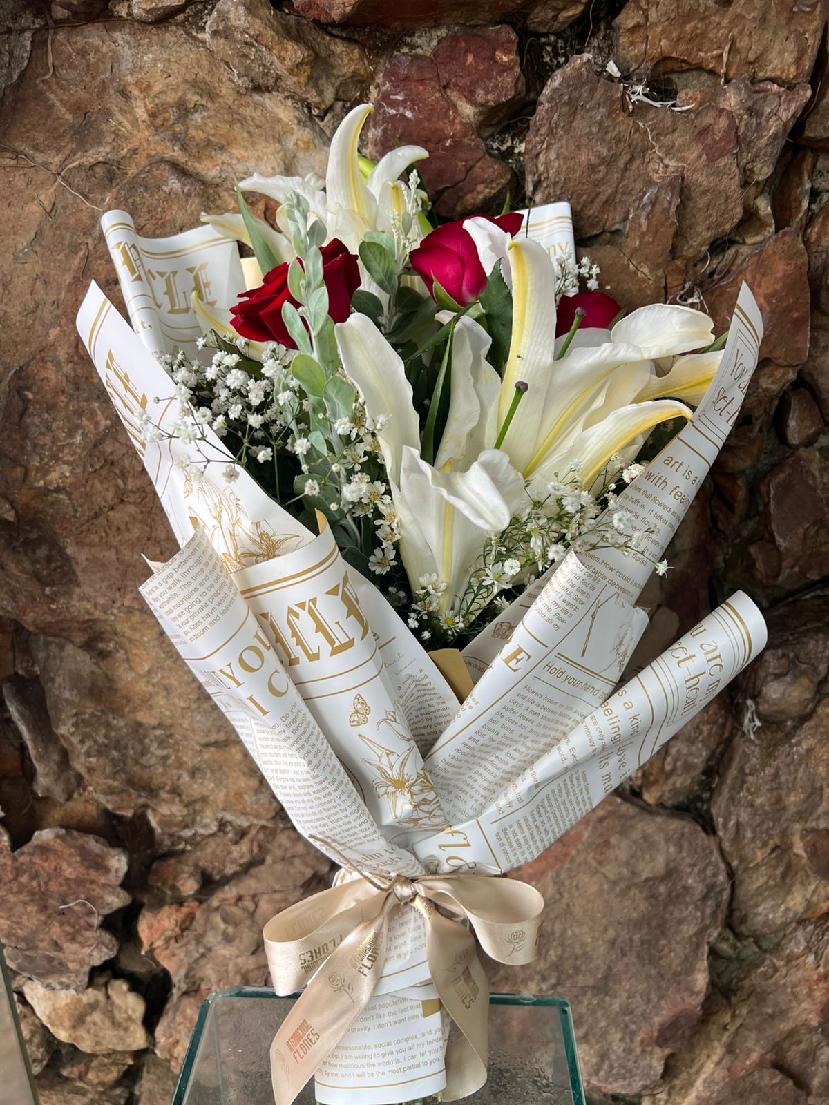 Buquê Lírios e Rosas Nacionais com Embalagem Coreano