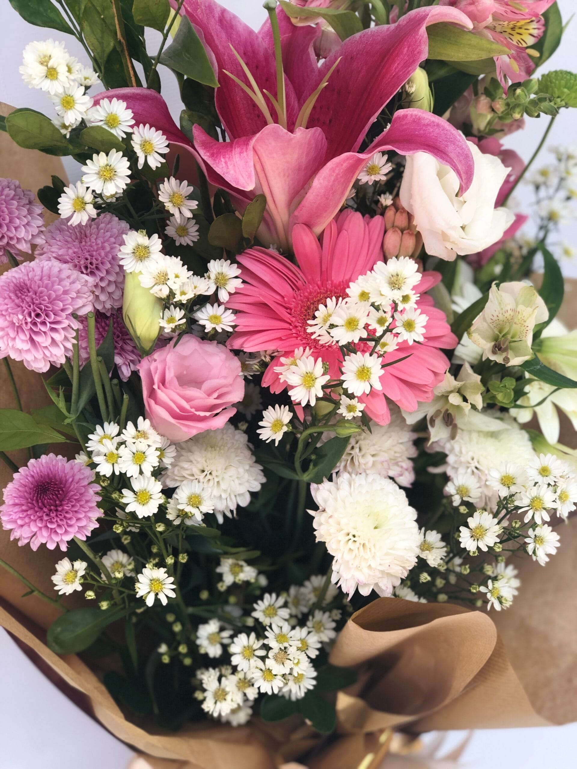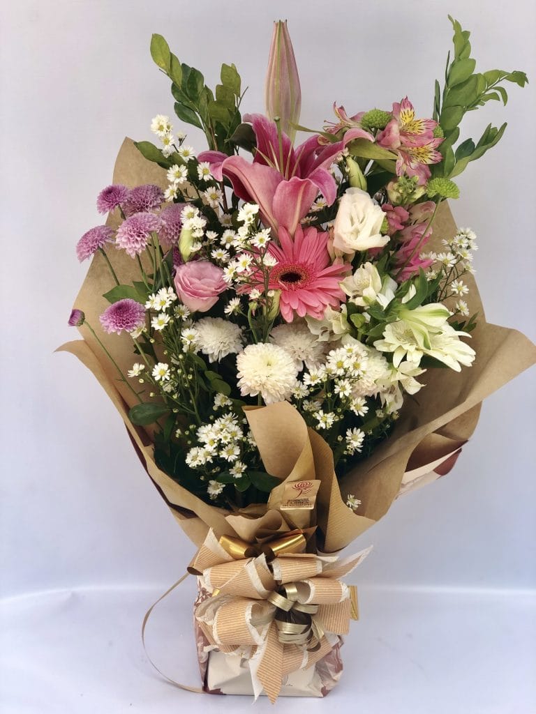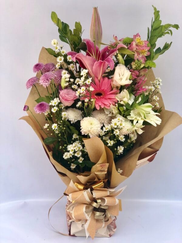 Buquê na base de floral em Flores Nobres. É confeccionado com uma variedade de flores especiais e cores diversas, contendo 12 galhos de flores, os tipos de flores podem depender das disponibilidades na loja, com acabamento em áster e folhagens, finalizado com papel kraft especial em estoque e laço de fita a combinar com as flores.