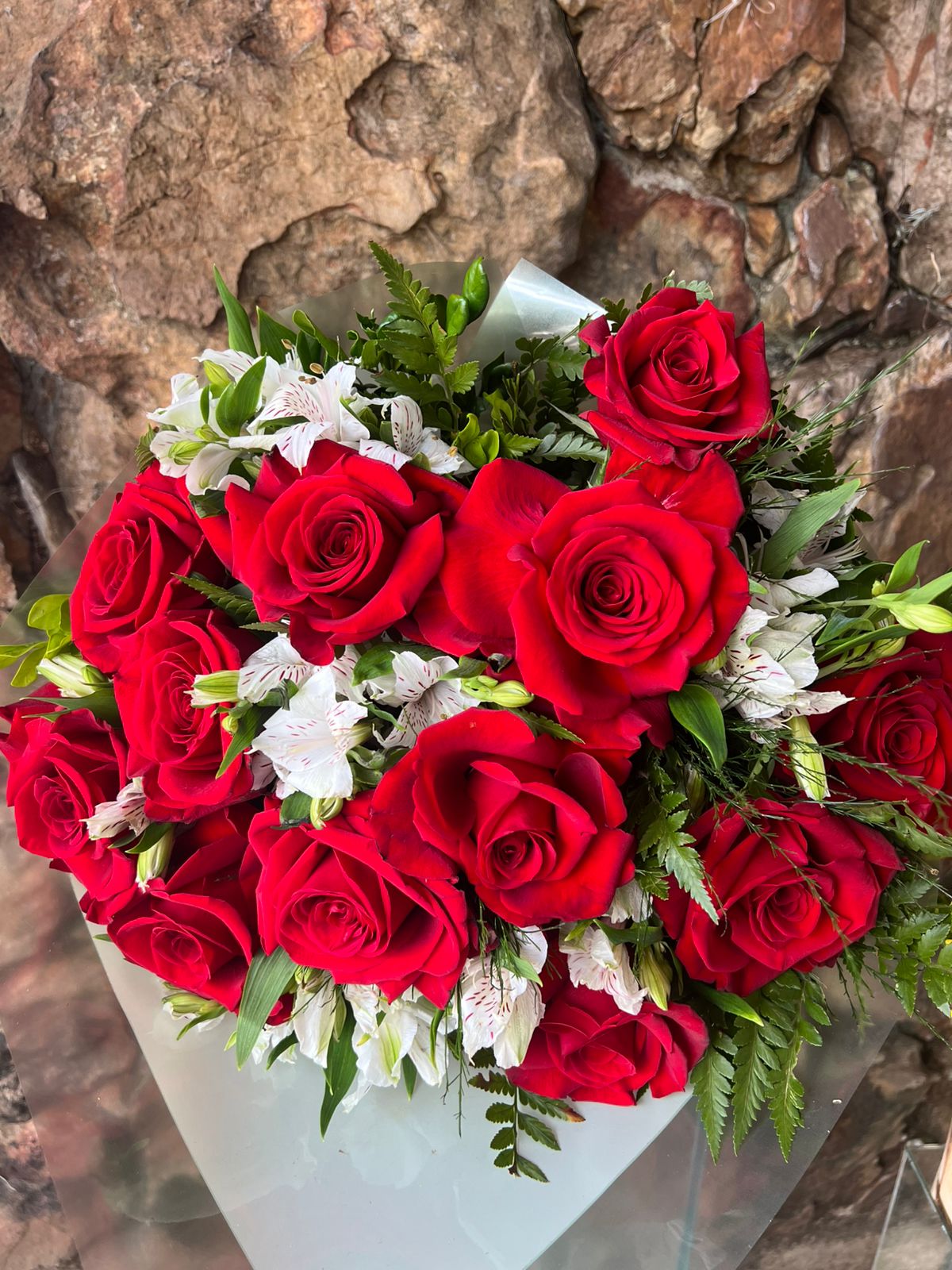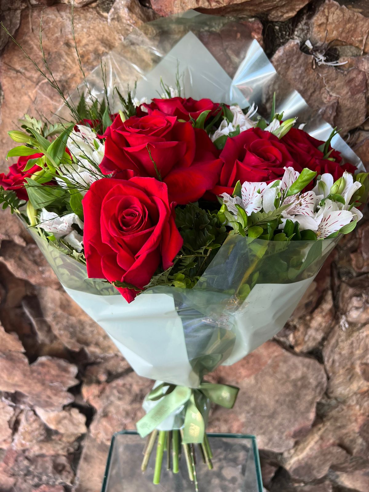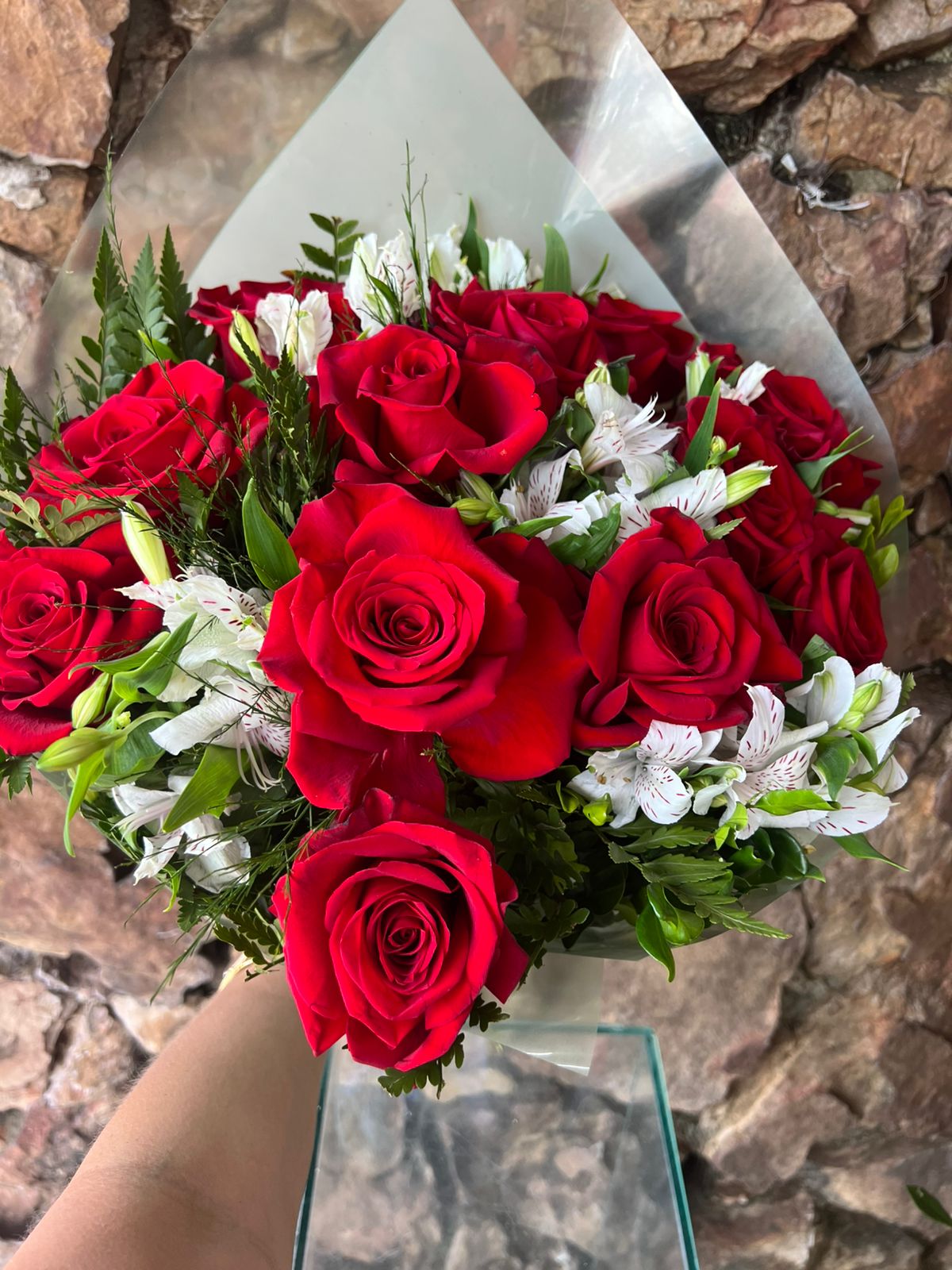 Buquê contendo 12 rosas colombinas vermelhas e 8/10 galhos de astromélias brancas, complemento em folhagens, embalado em papel especial com laço de fita.