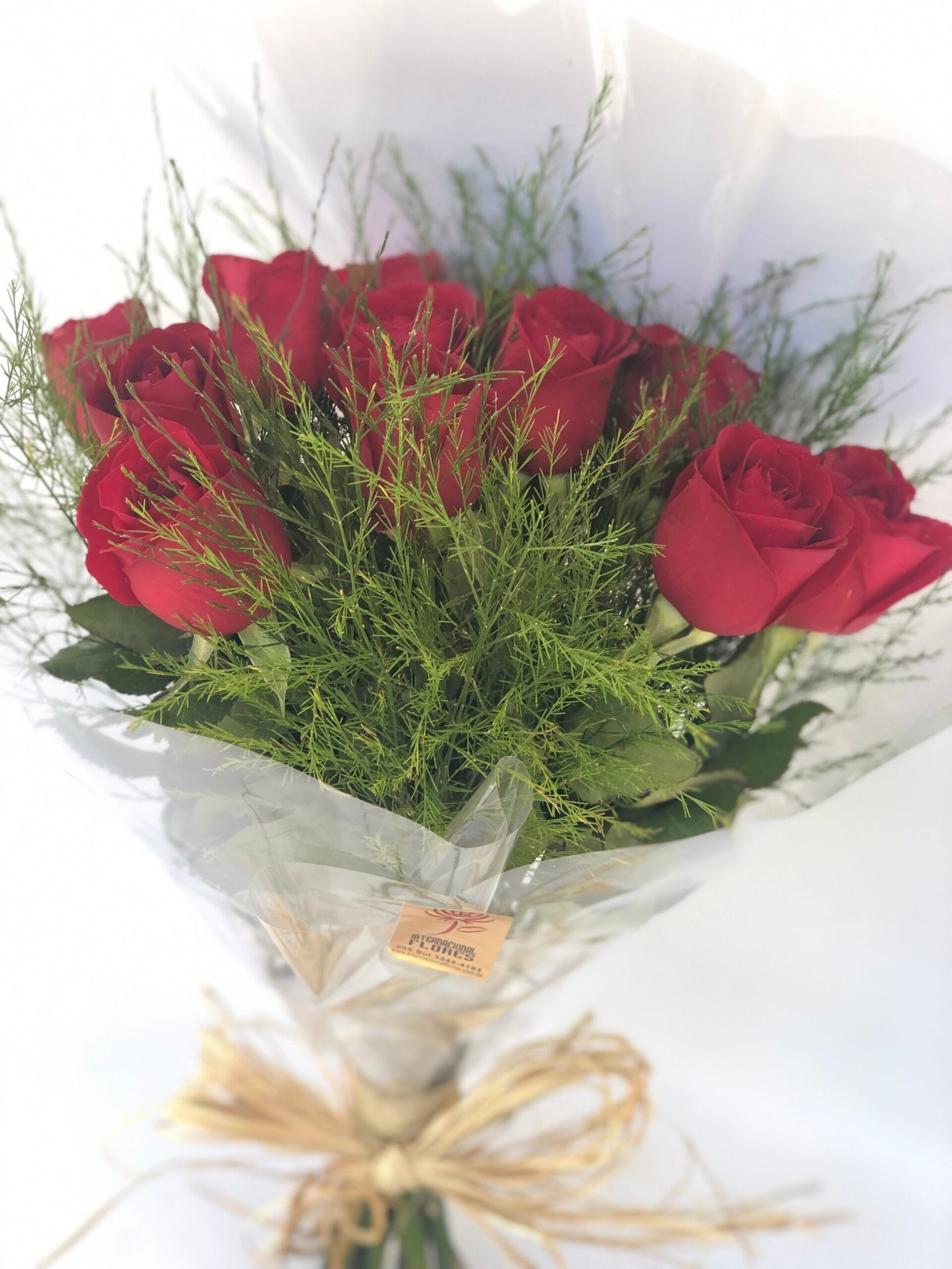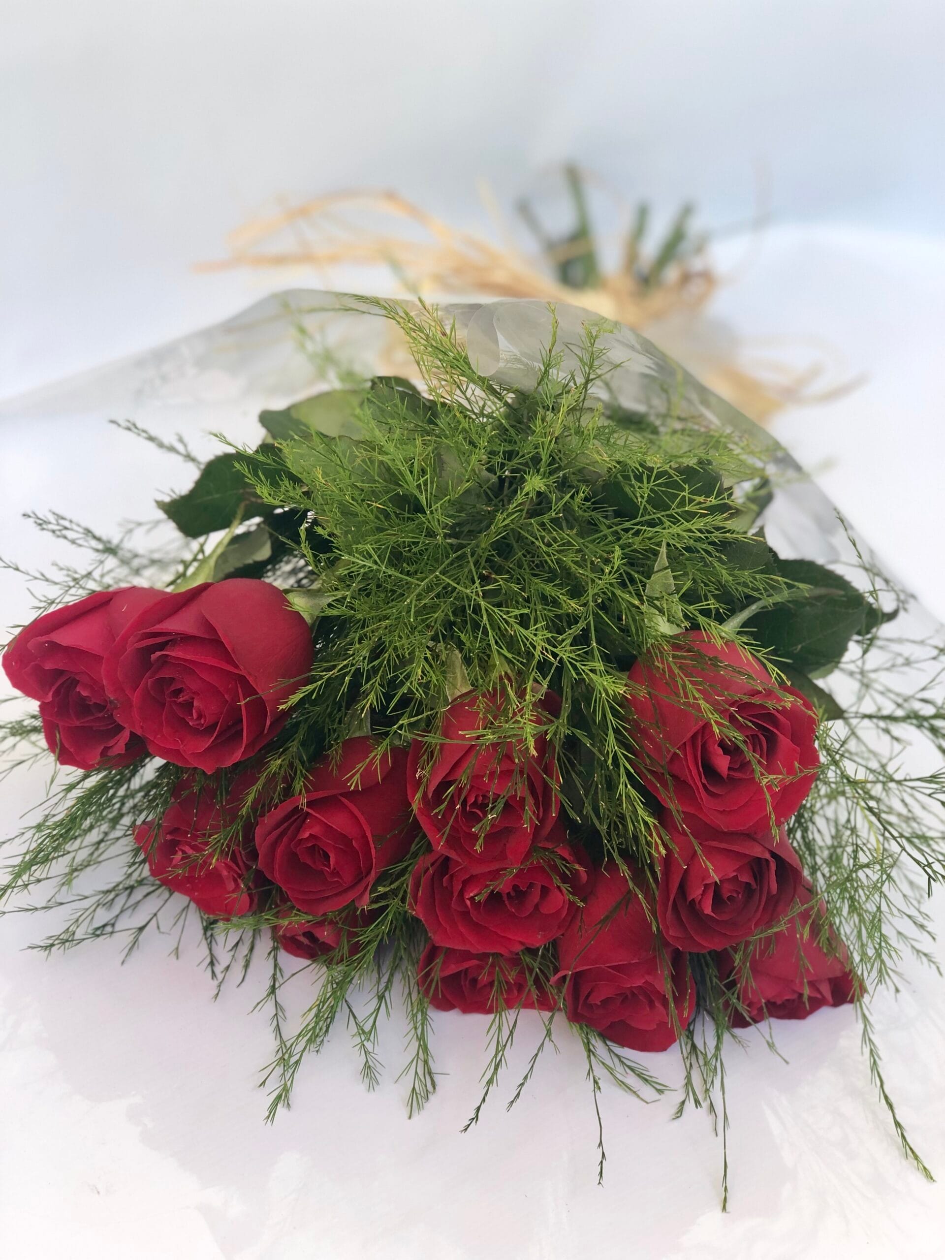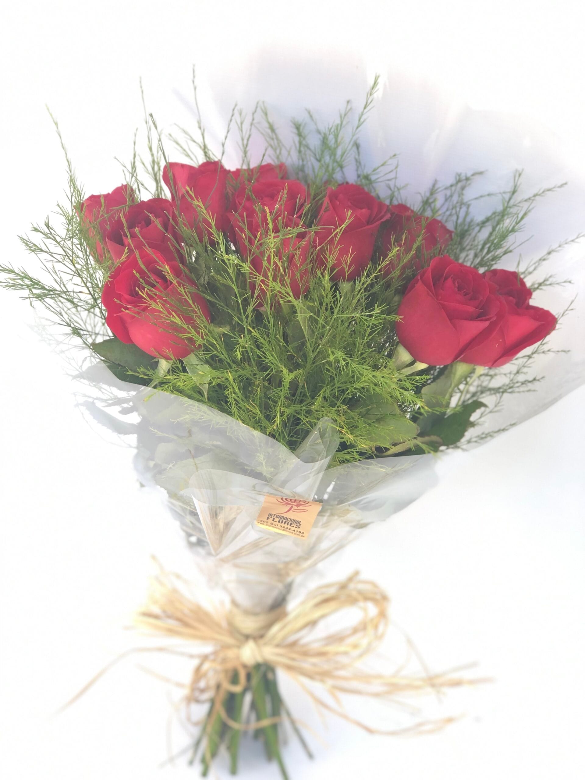 Singelo e delicado Buquê com 12 rosas vermelhas nacional complemento de folhagens embalado com celofane transparente acompanha laço de ráfia OU fita de cetim e etiqueta