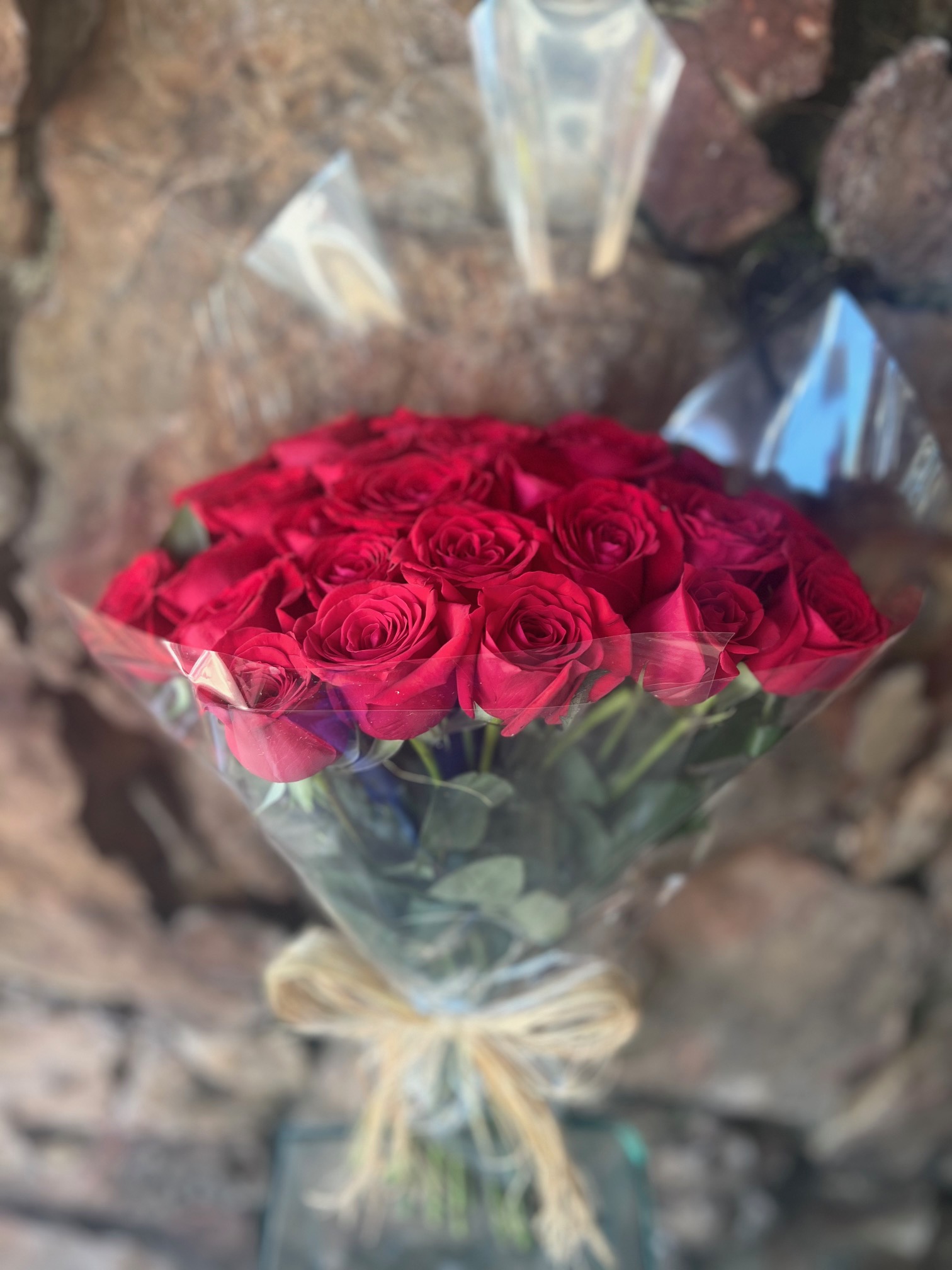 Um singelo buquê confeccionado com 40 rosas vermelhas nacional envolto com celofane transparente e laço de fita