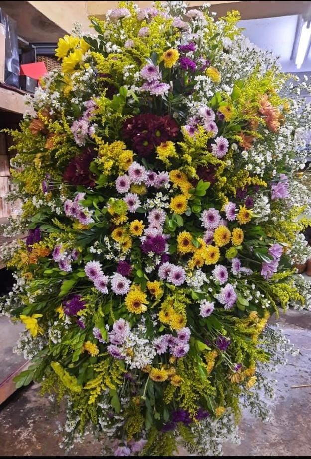 Arranjo fúnebre trabalhado COM UM MIX DE DIVERSAS FLORES DO CAMPO coloridas e áster branco, acabamento em folhagem diversas. OBS: Se alguma das flores e folhagens citadas no descritivo não tiverem na ocasião serão substituídas por outras de mesma qualidade e na mesma quantidade ou se preferir entrar em contato com a empresa para averiguação de substituição. Tamanho da coroa varia de 1,20 m até 1,50 m de altura por 70 cm até 85 cm de largura. O tamanho varia por causa da altura que vem a flor e folhagem de corte.