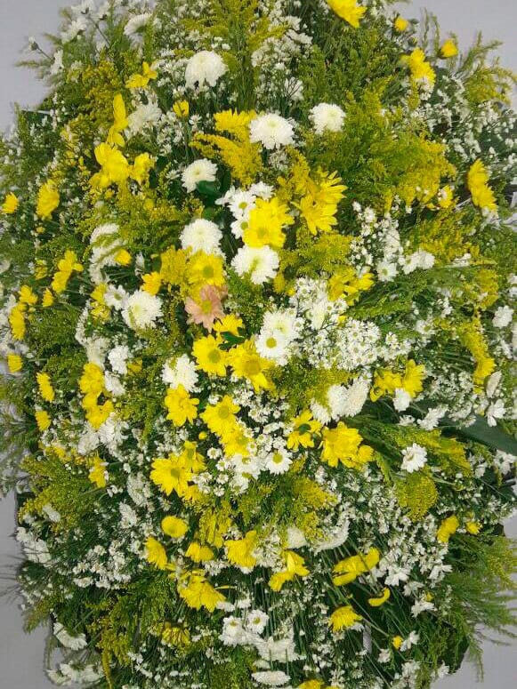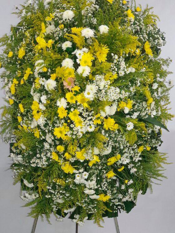 Arranjo fúnebre trabalhado uma variedade de flores campestres brancas e amarelas (flor do campo, tango e áster branco), acabamento em folhagem diversas. OBS: Se alguma das flores e folhagens citadas no descritivo não tiverem na ocasião serão substituídas por outras de mesma qualidade e na mesma quantidade ou se preferir entrar em contato com a empresa para averiguação de substituição. Tamanho da coroa varia de 1,20 m até 1,50 m de altura por 70 cm até 85 cm de largura. O tamanho varia por causa da altura que vem a flor e folhagem de corte.