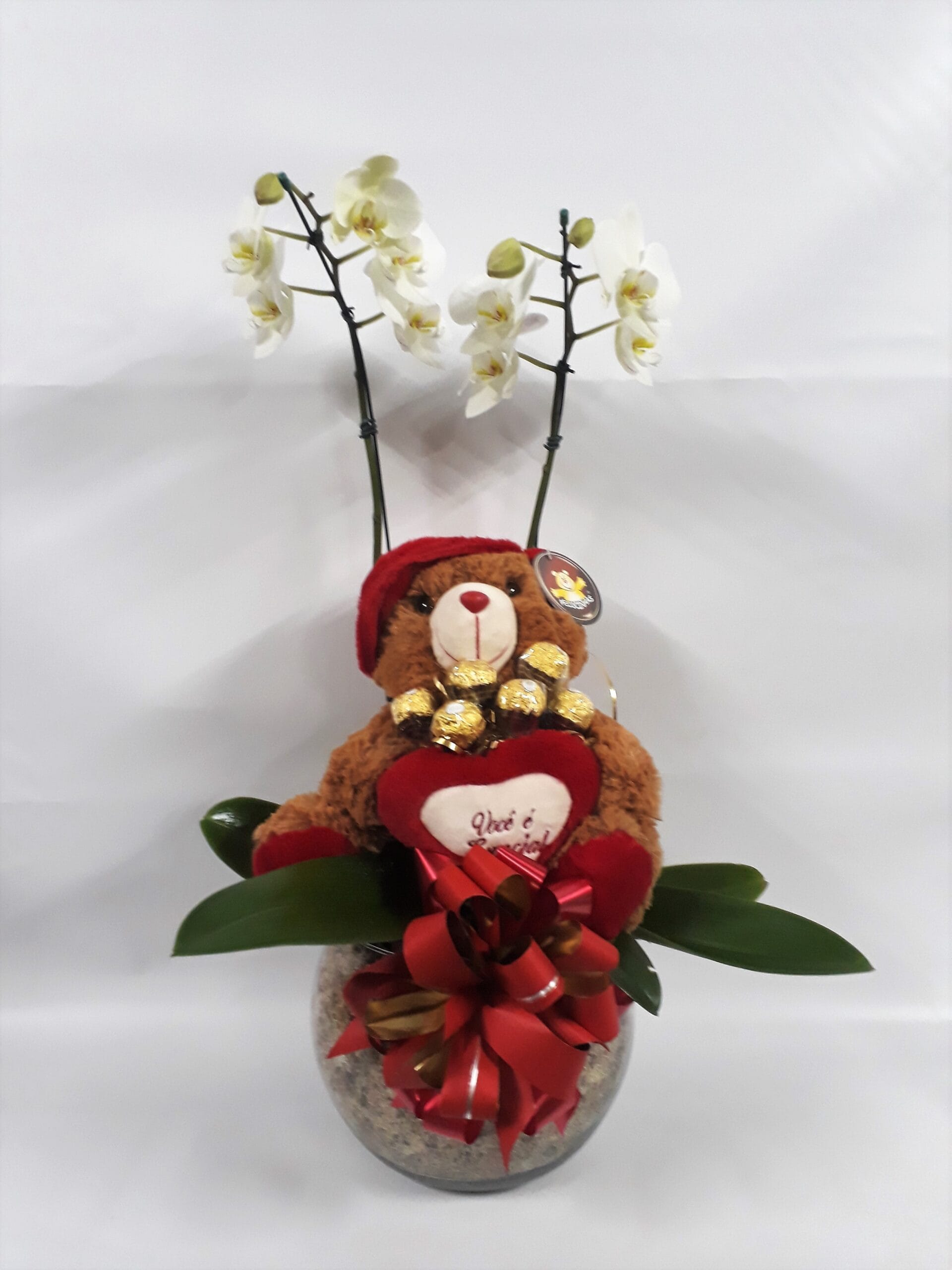 Especial orquídea phalaenopsis Branca (mas o miolo da branca pode mudar, podendo ser amarelo ou lílas) de 2 hastes em vaso de vidro (PODENDO VARIAR O MODELO DO VASO DE VIDRO DE ACORDO COM ESTOQUE) com 01 urso de pelúcia de aproximadamente 30 cm de altura, com 06 palitos de chocolate Ferrero Rocher e acabamento com laço de fita.
