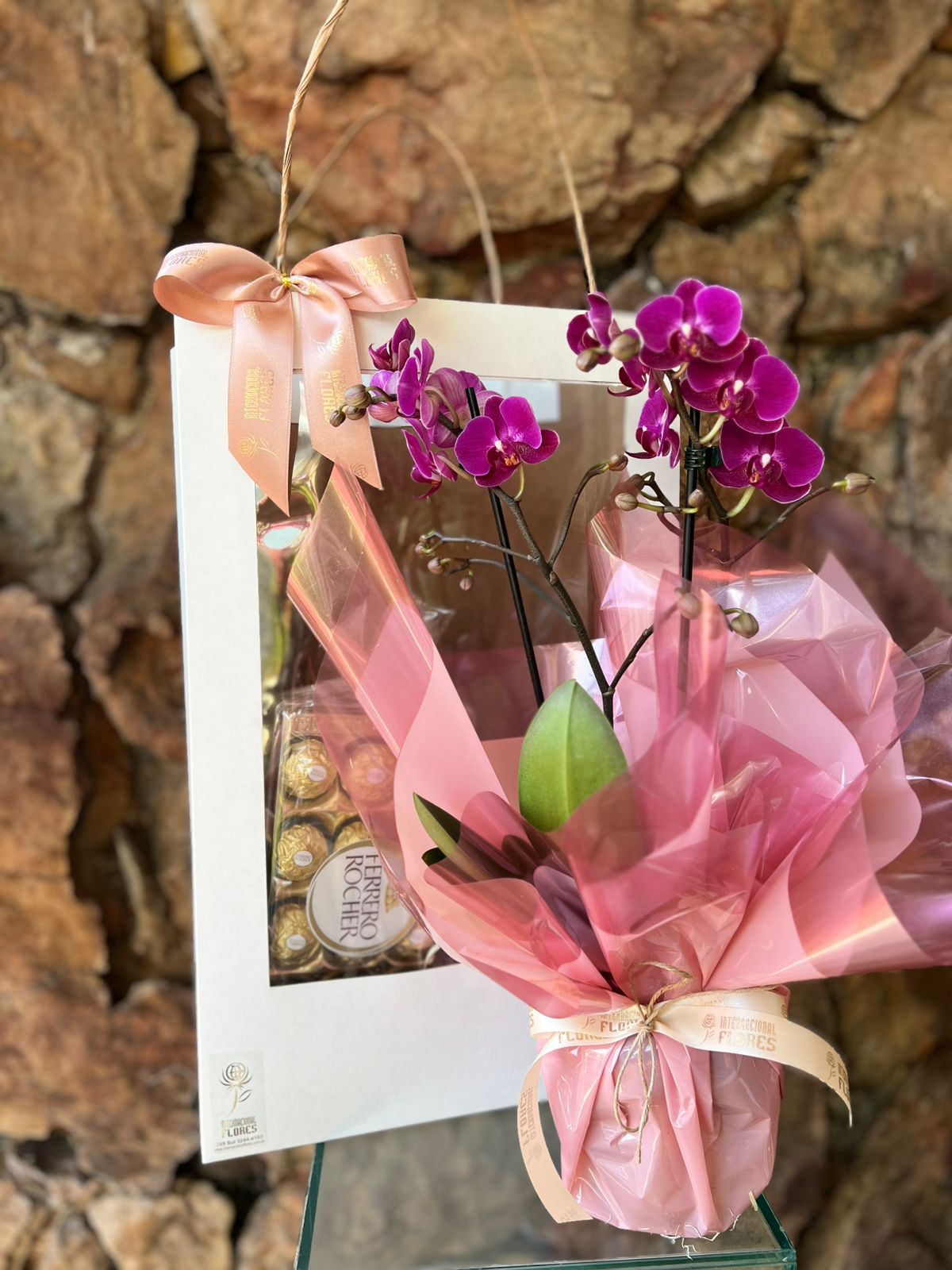 Orquídea Phaleanopsis Mini pote 12 com 2 hastes na sacola G com visor acompanha chocolate Ferrero Rocher T12