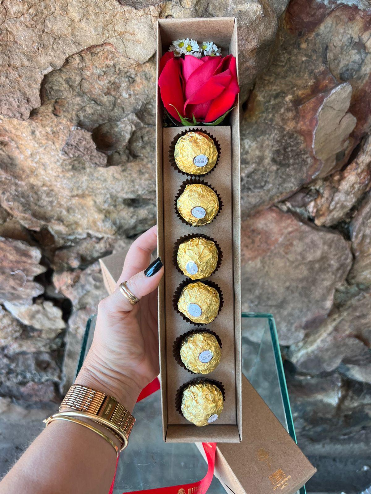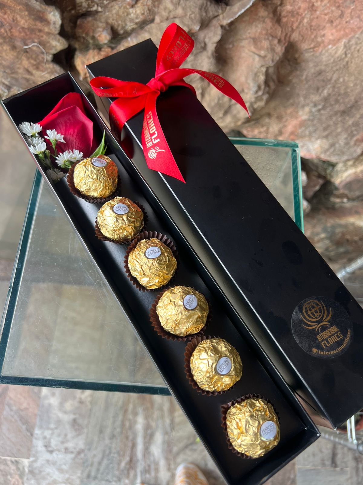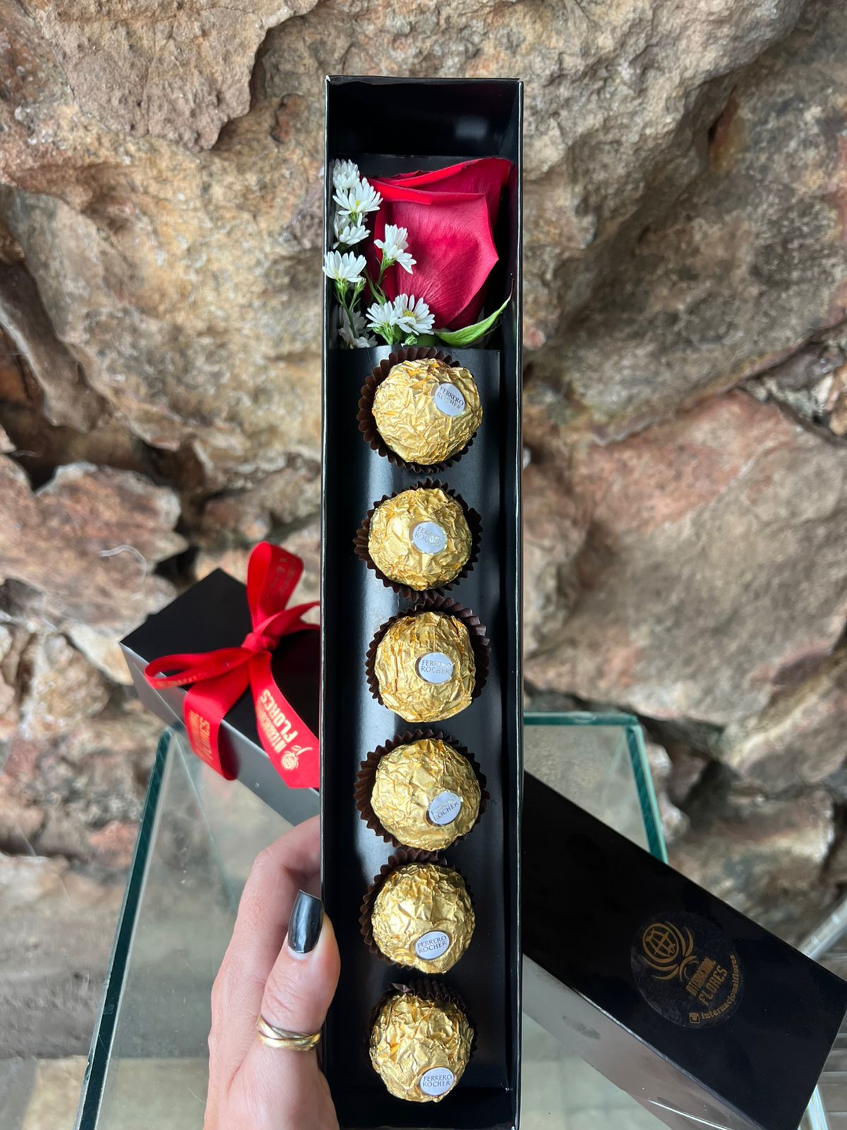 Singela caixa de 33×6,5 cm (podendo ser PRETA ou Kraft ou VERMELHA) contendo 01 rosa especial natural vermelha, áster,  com 06 bombons Ferrero Rocher, embalado com fita de cetim.