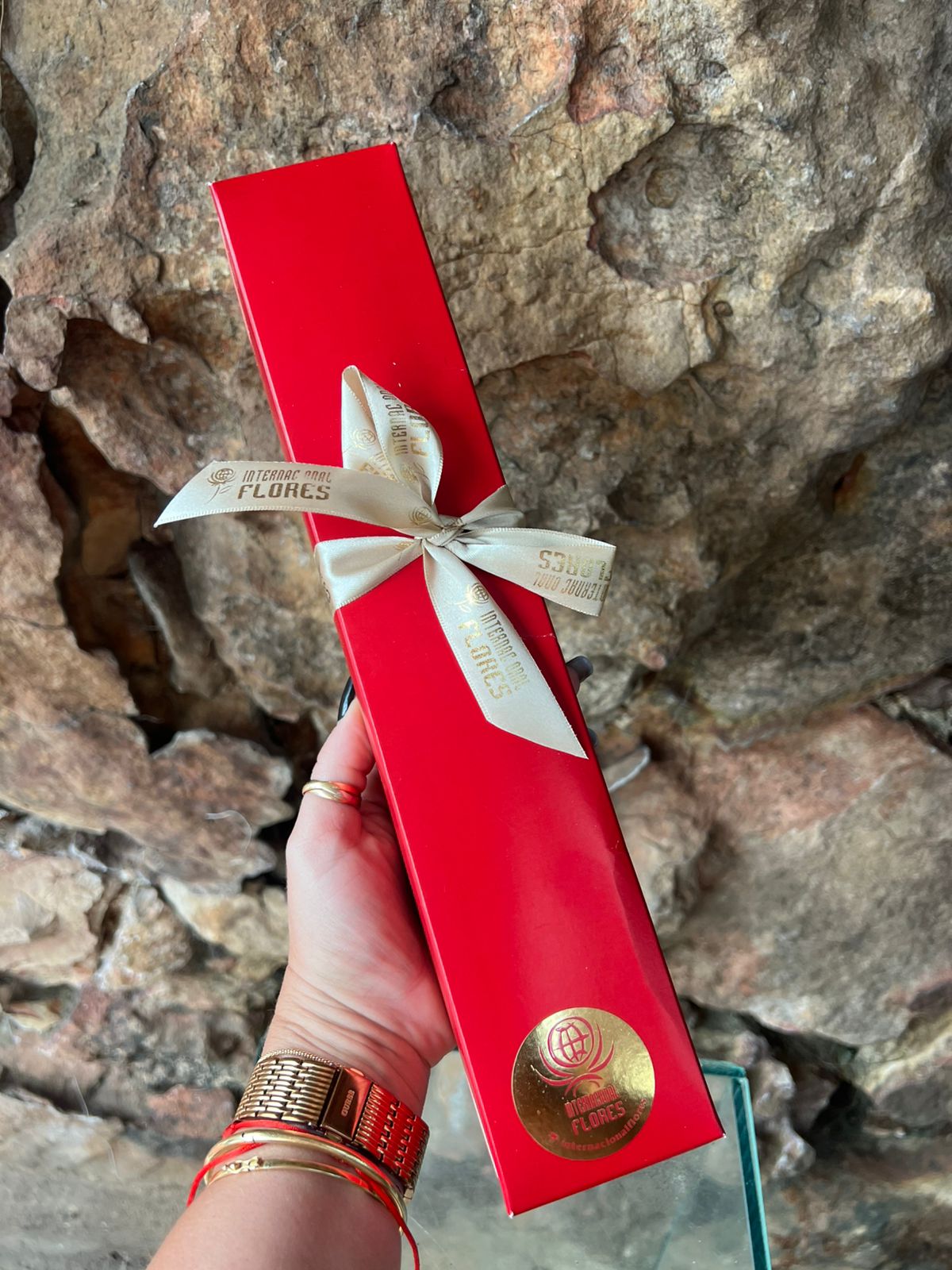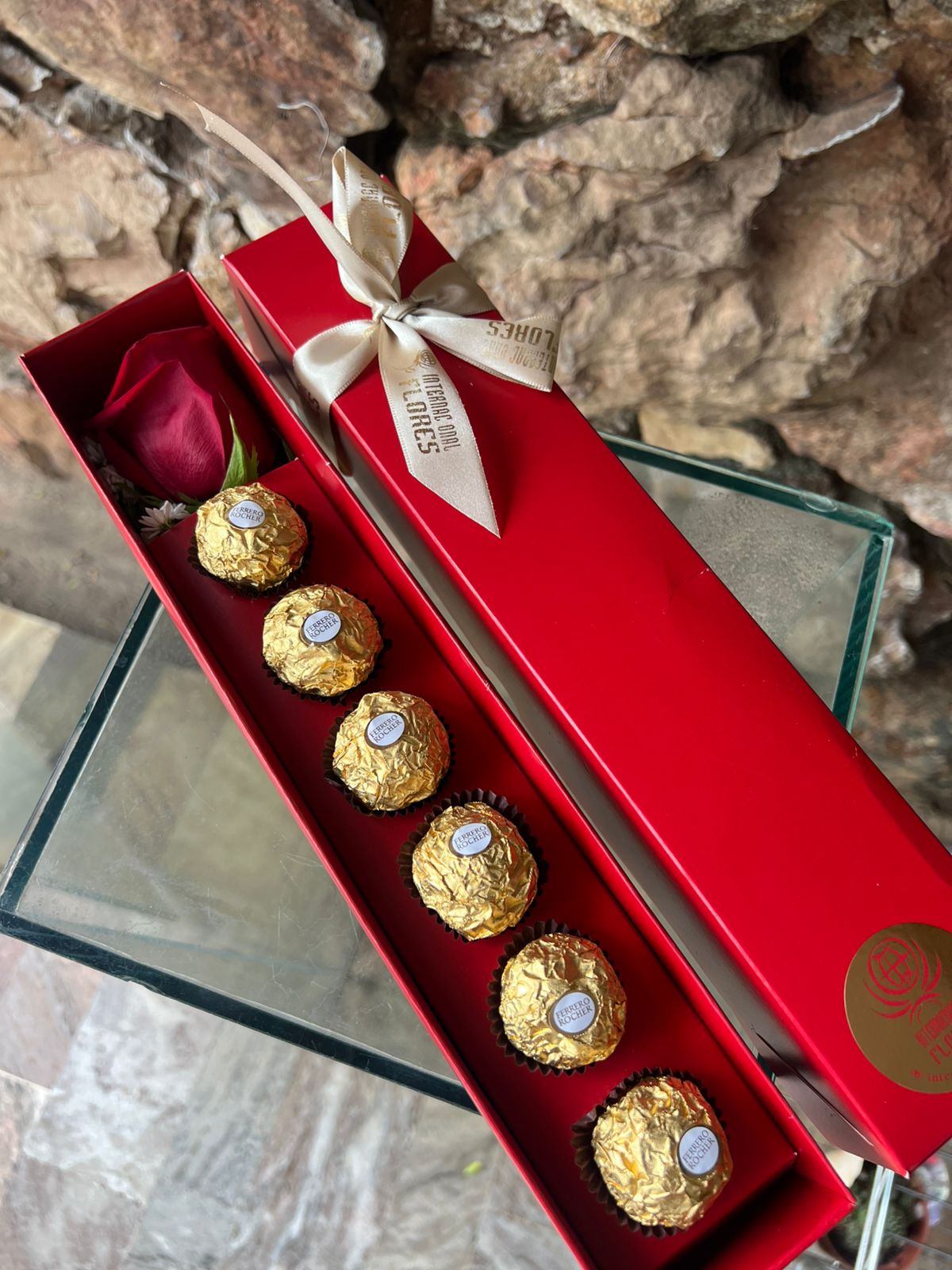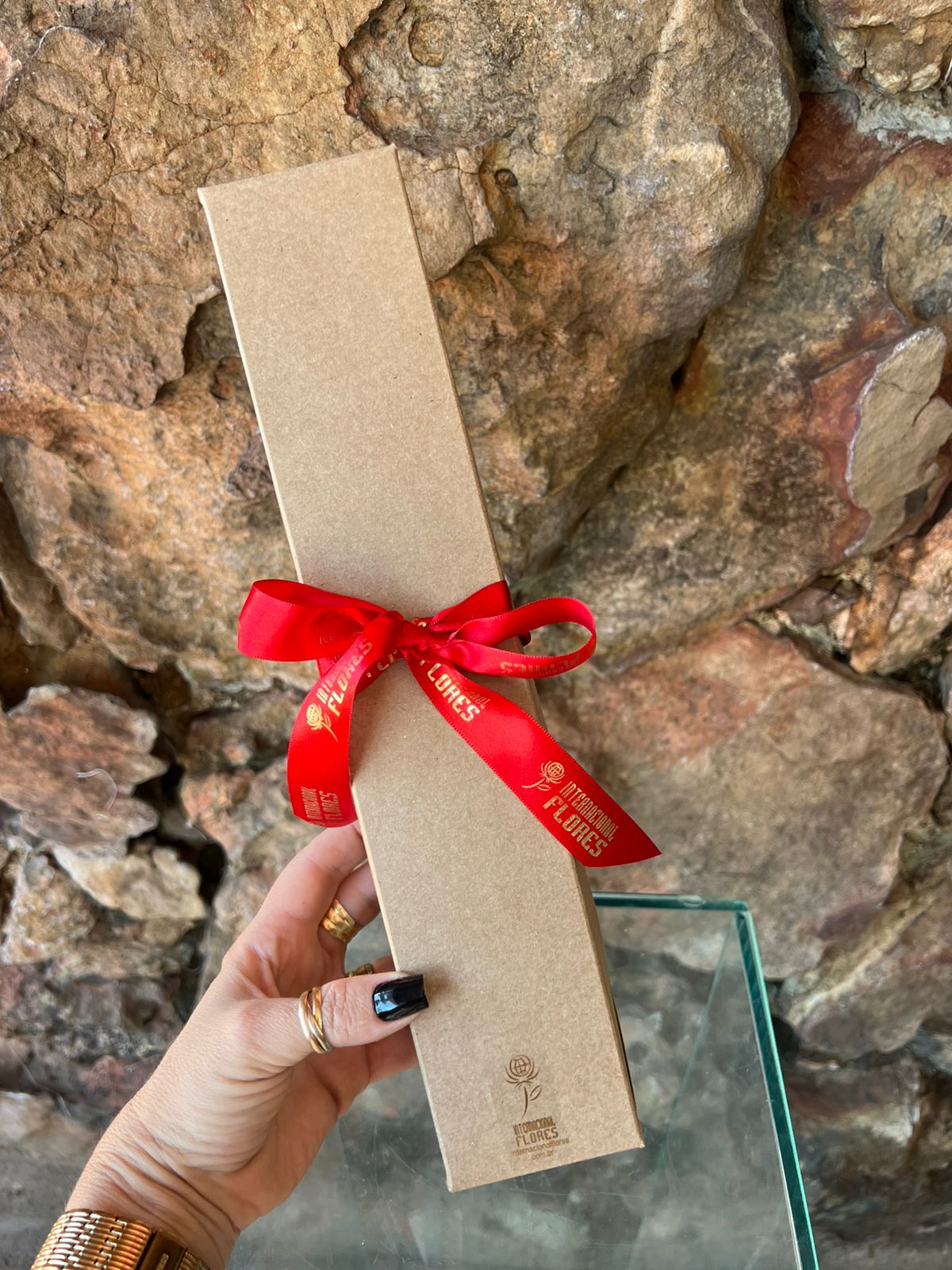 Singela caixa de 33×6,5 cm (podendo ser PRETA ou Kraft ou VERMELHA) contendo 01 rosa especial natural vermelha, áster,  com 06 bombons Ferrero Rocher, embalado com fita de cetim.
