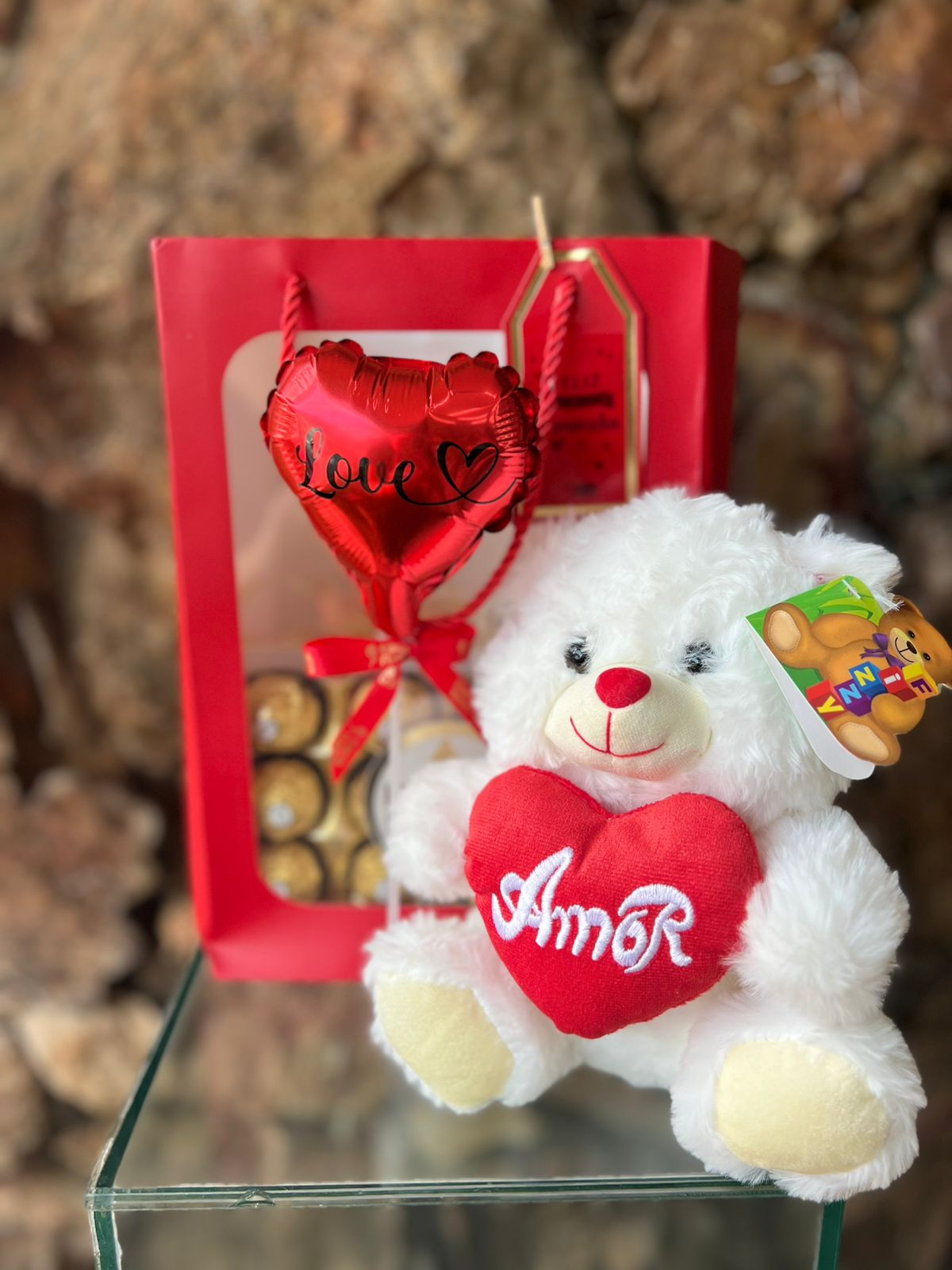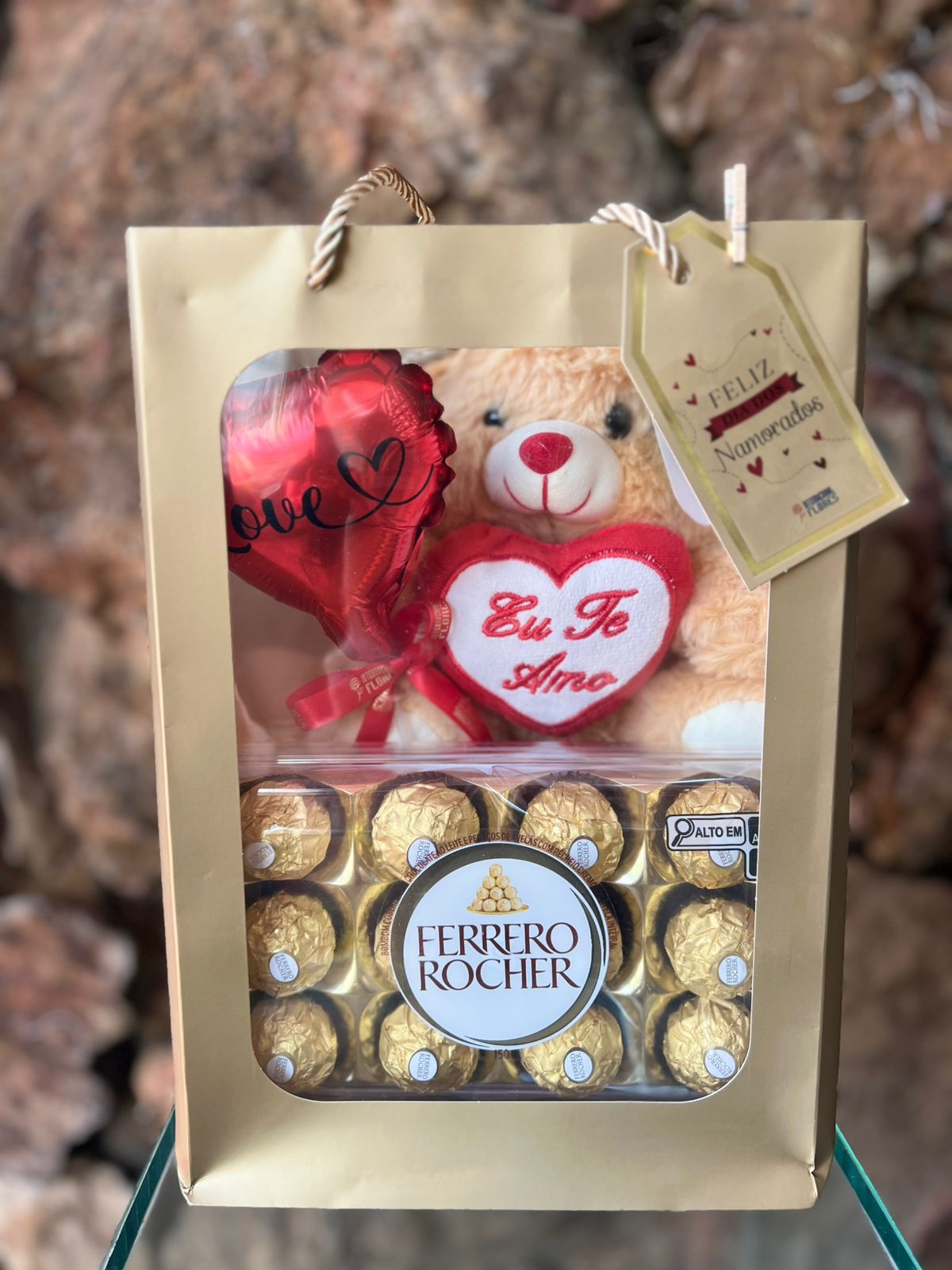 Especial sacola com visor 30x20cm e adesivo “Feliz Dia Dos Namorados”, contendo urso de 20cm de pelúcia Fizzi com coração, caixa de chocolate Ferrero Rocher T12 e balão coração “Love” de 9″