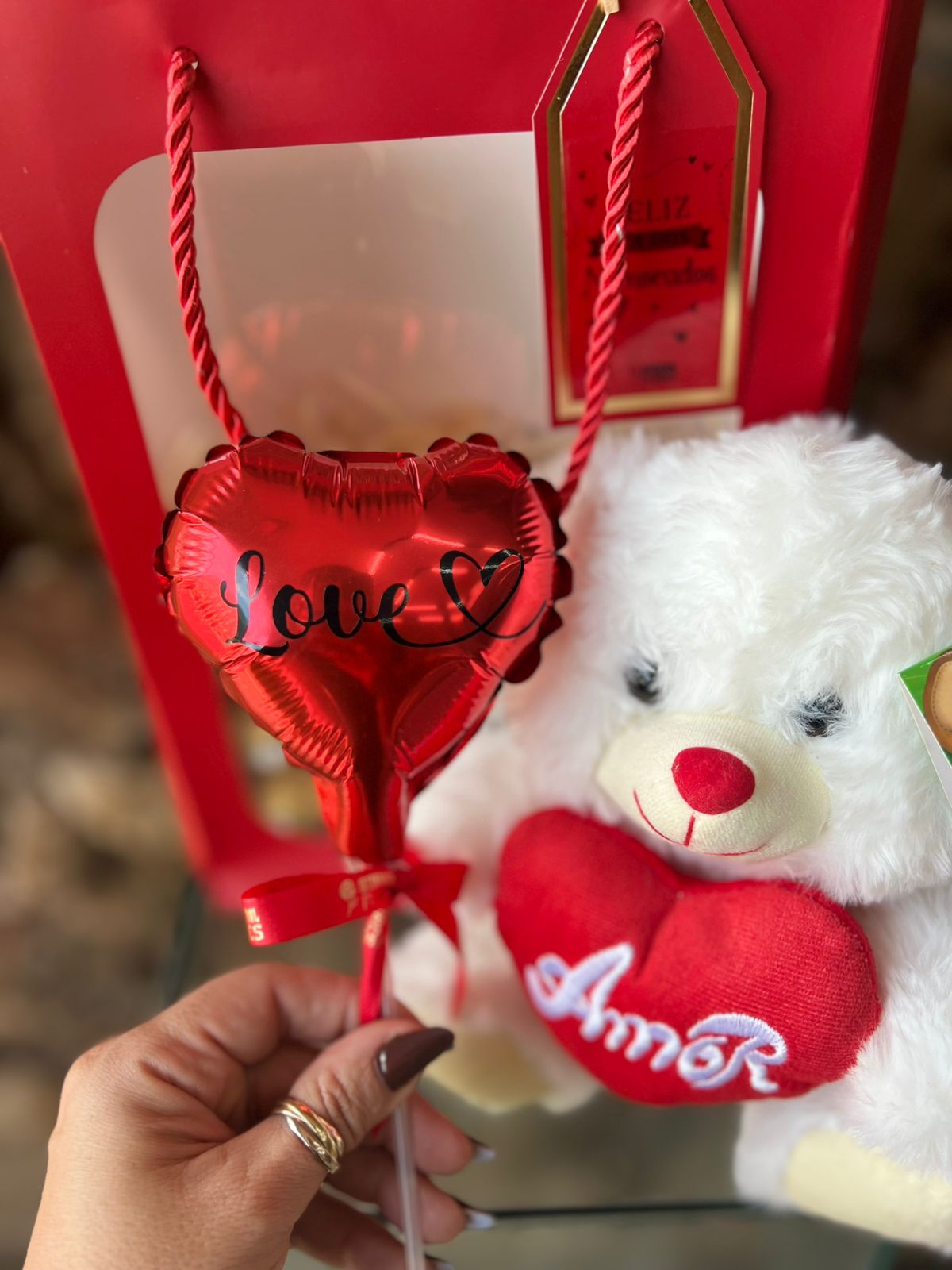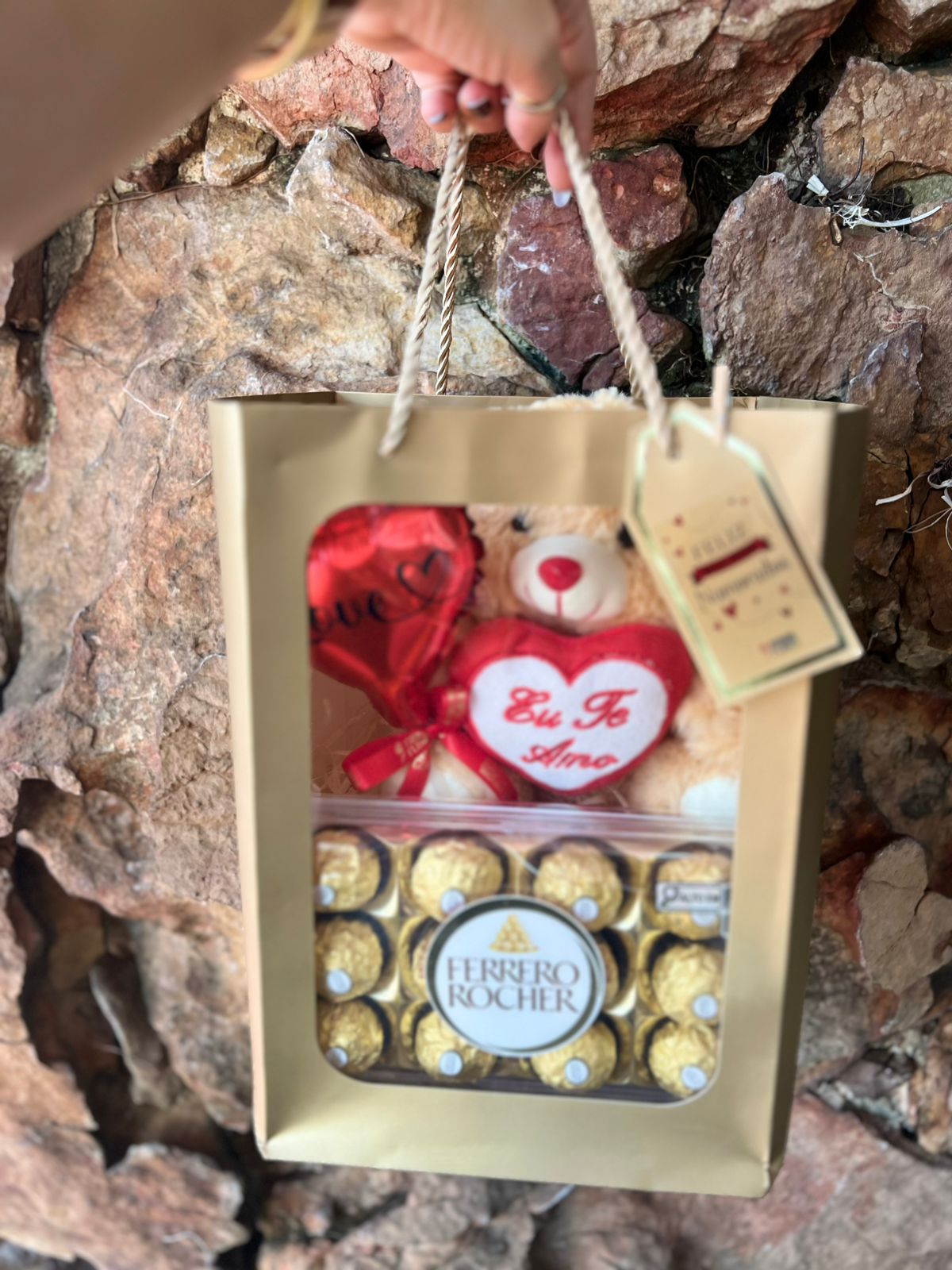 Especial sacola com visor 30x20cm (podendo ir na cor vermelha, dourada ou preta) e adesivo “Feliz Dia Dos Namorados”, contendo urso de 20cm (creme ou caramelo) de pelúcia Fizzi com coração (o coração pode alterar a estampa), caixa de chocolate Ferrero Rocher T12 e balão coração “Love” de 9″