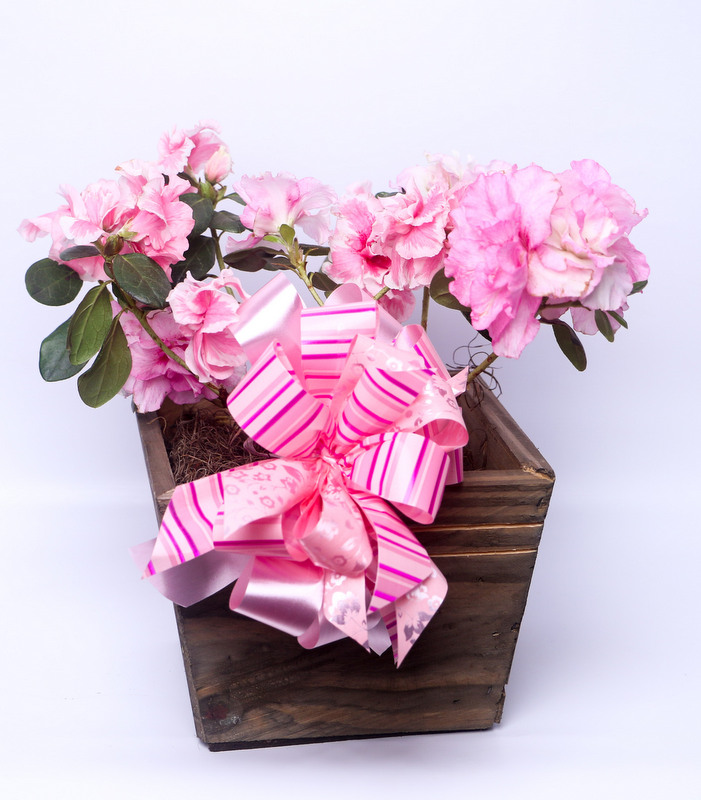 Vaso plantado de azaléia média, embalada com papel deocrado de acordo com a cor da flor e laço de fita especial.