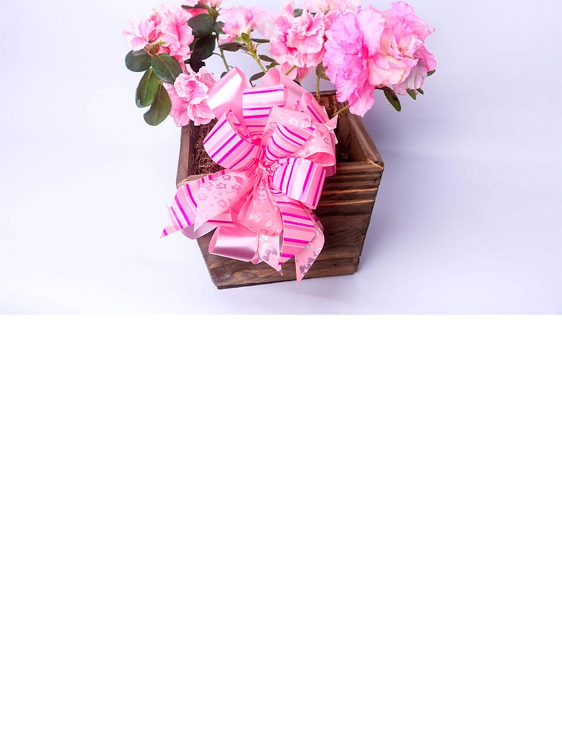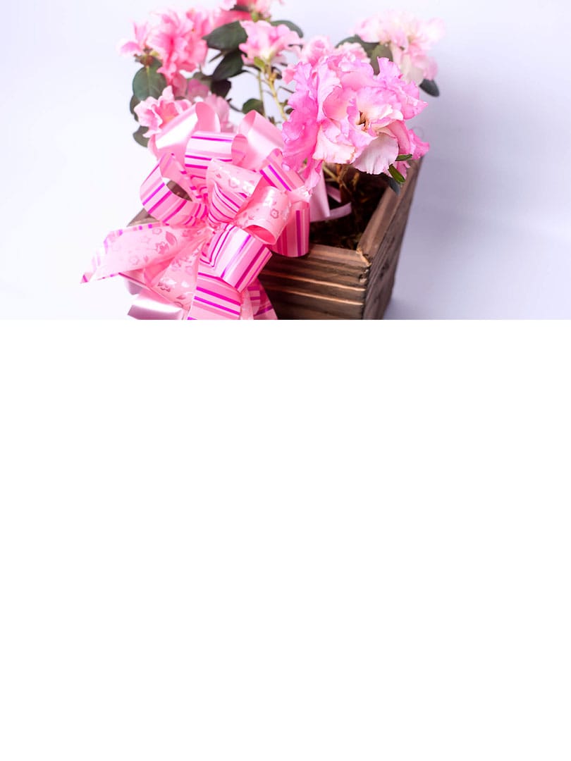 Vaso plantado de azaleia média, embalada com papel decorado de acordo com a cor da flor e laço de fita especial.