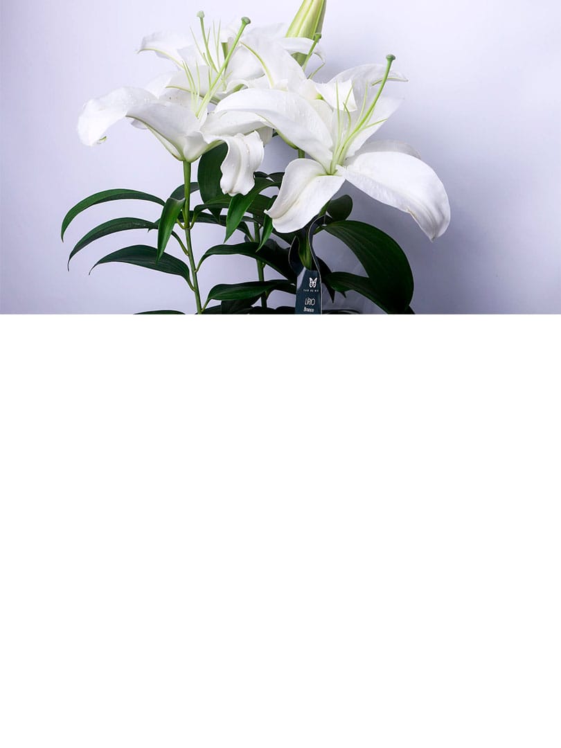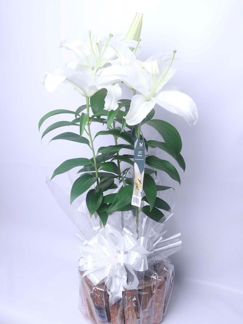 Vaso plantado de lírio branco que exala um leve cheiro, vai dentro de cachepô de madeira rústica e decorado com laço de fita especial.