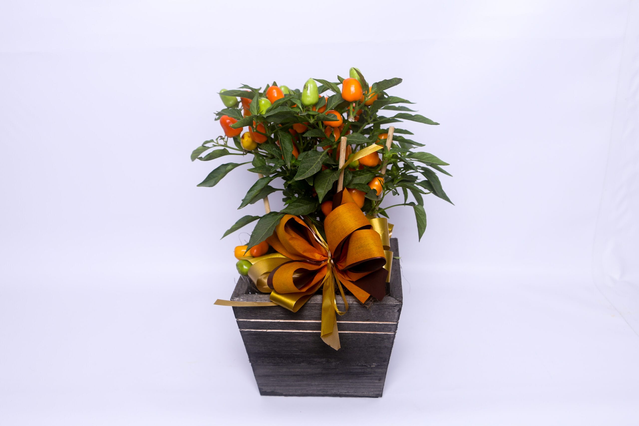 Ótimo para dar bons fluídos e apimentar. Vaso plantado de pimenta medindo aproximadamente 25 a 35 cm de altura, decorada com papel metalizado ou celofane com laço de fita.