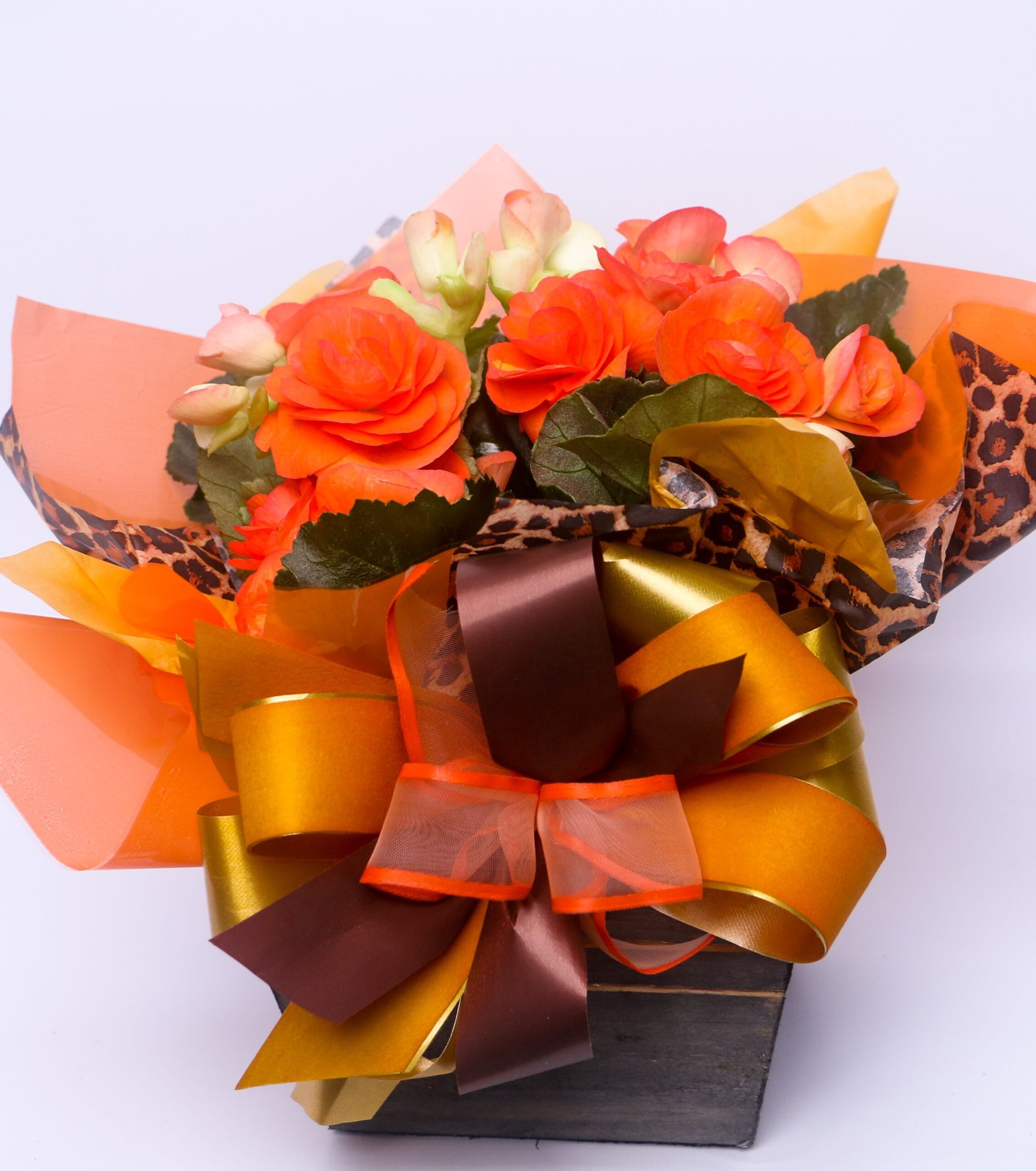 Vaso plantado de mini begônia que mede aproximadamente de 20 a 30 cm de altura e de 12 a 17 cm de largura.