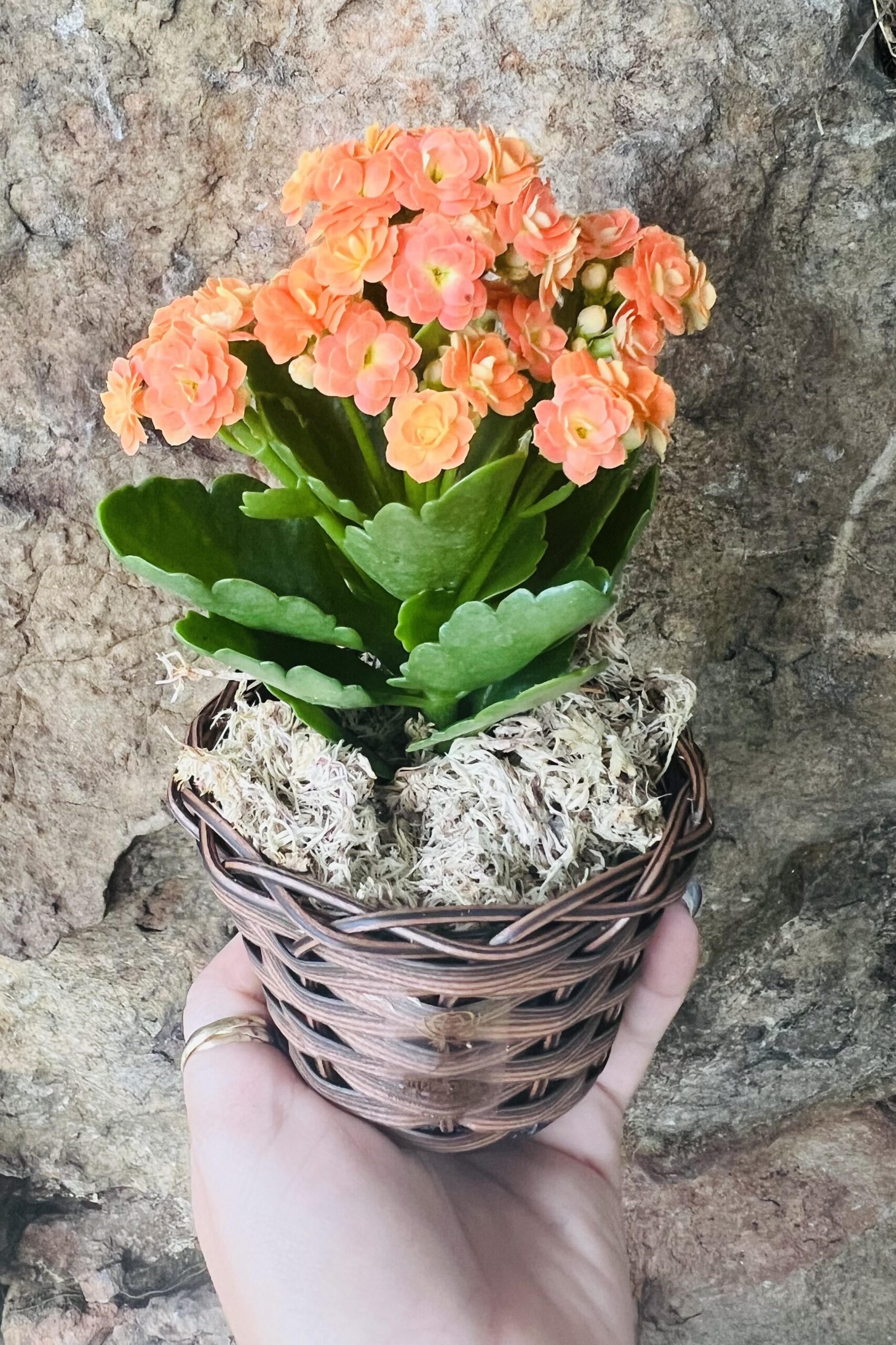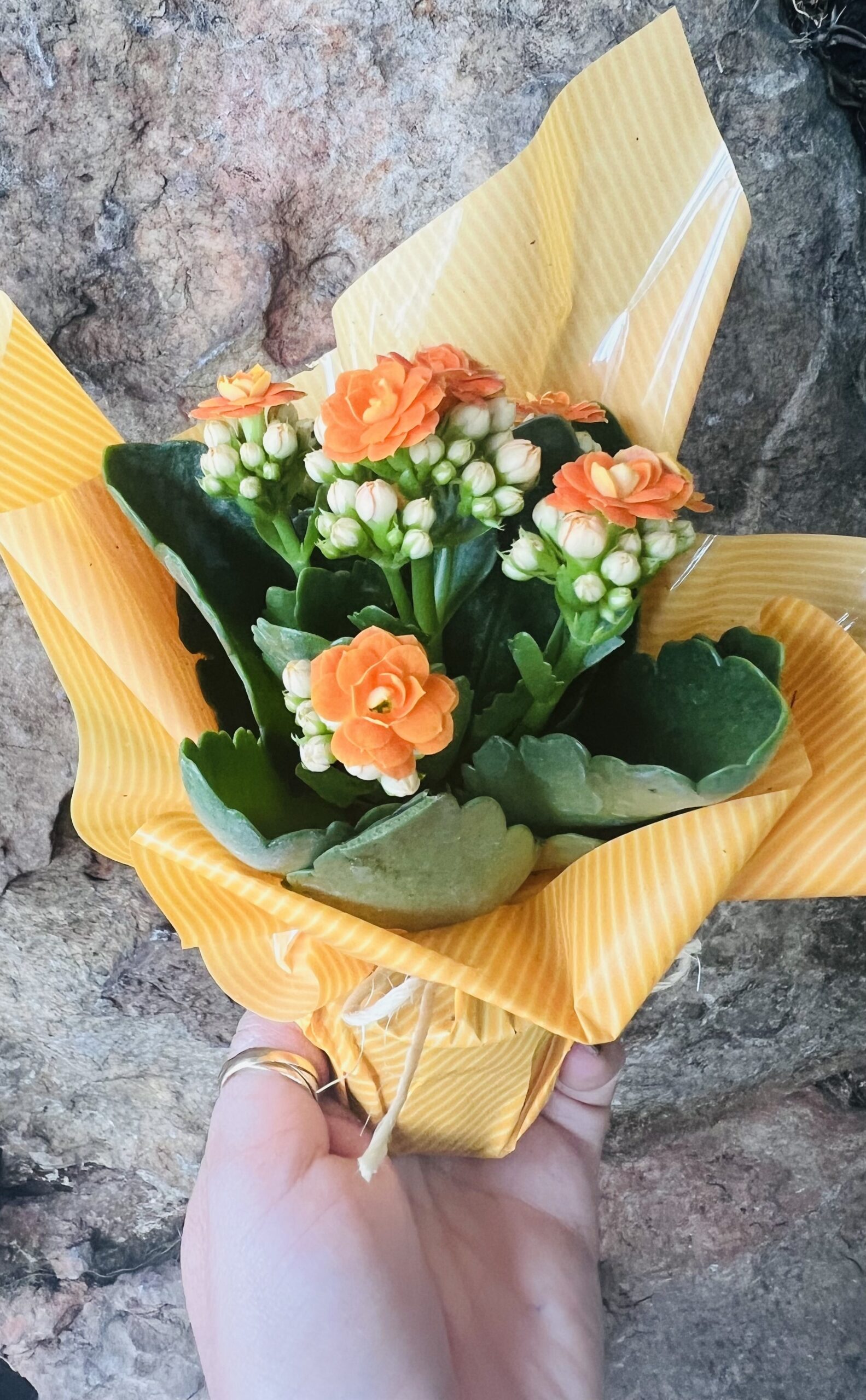 Delicado vaso plantado de mini Calandiva no pote 06 embalado com papel especial e laço