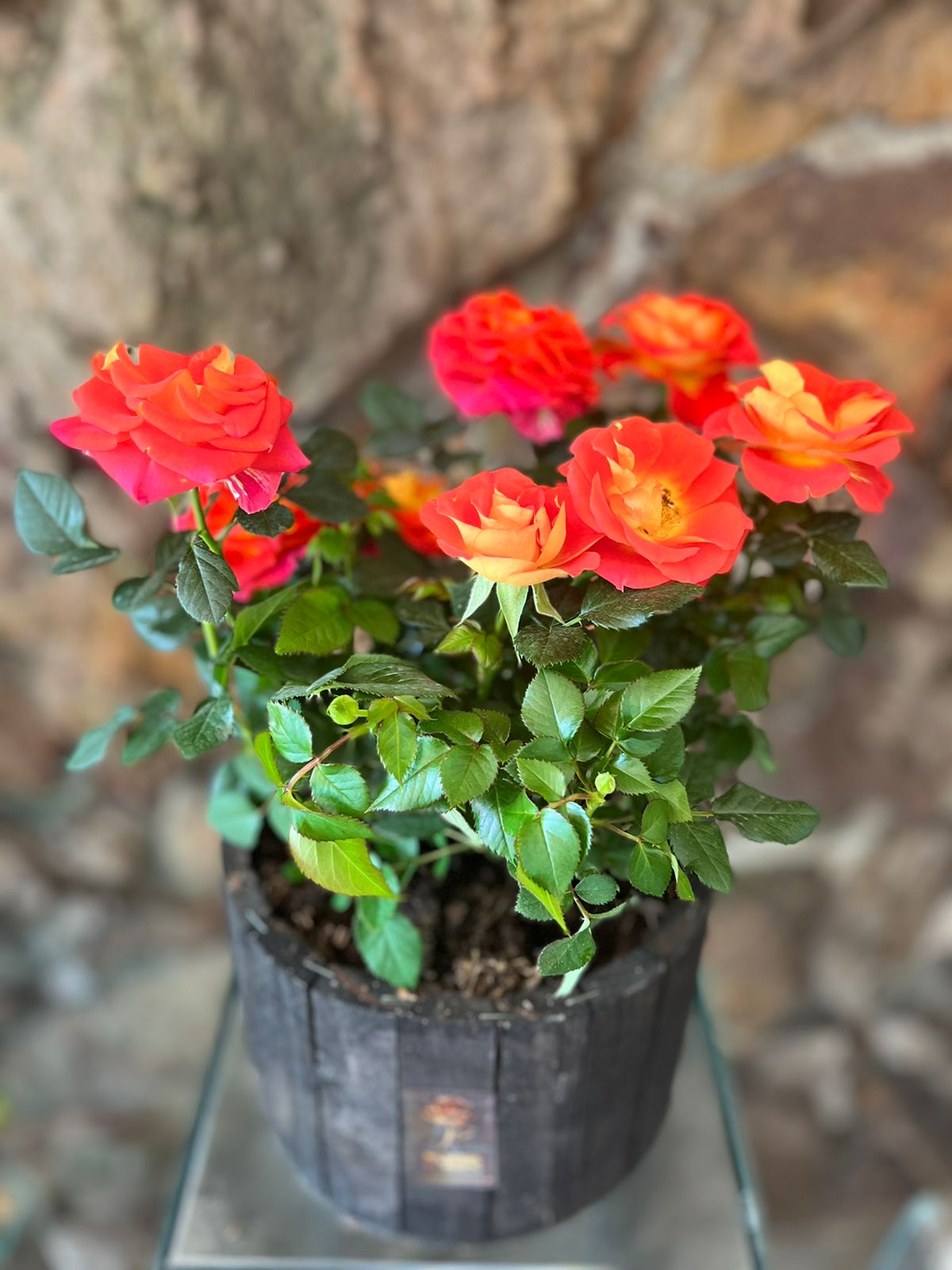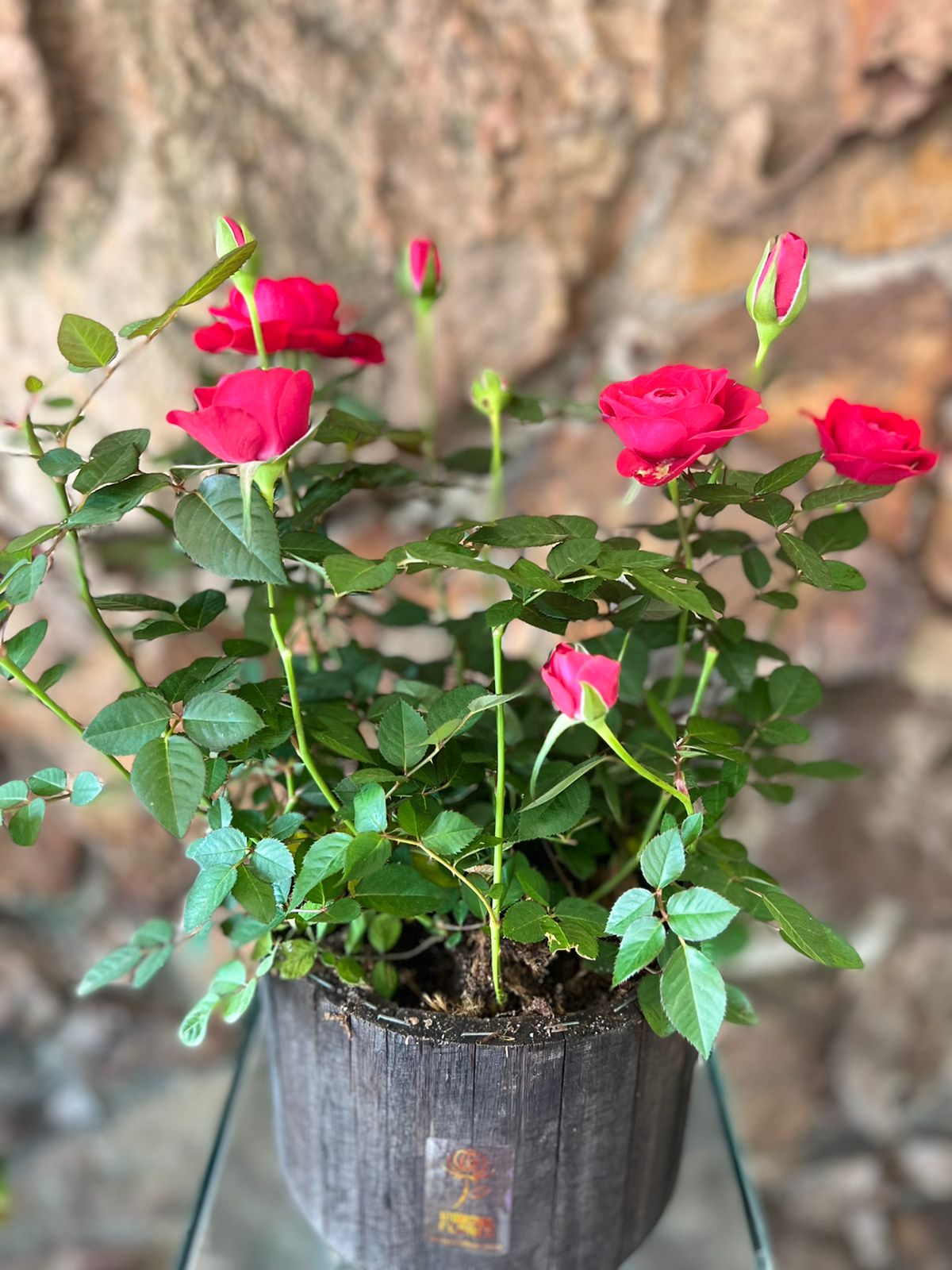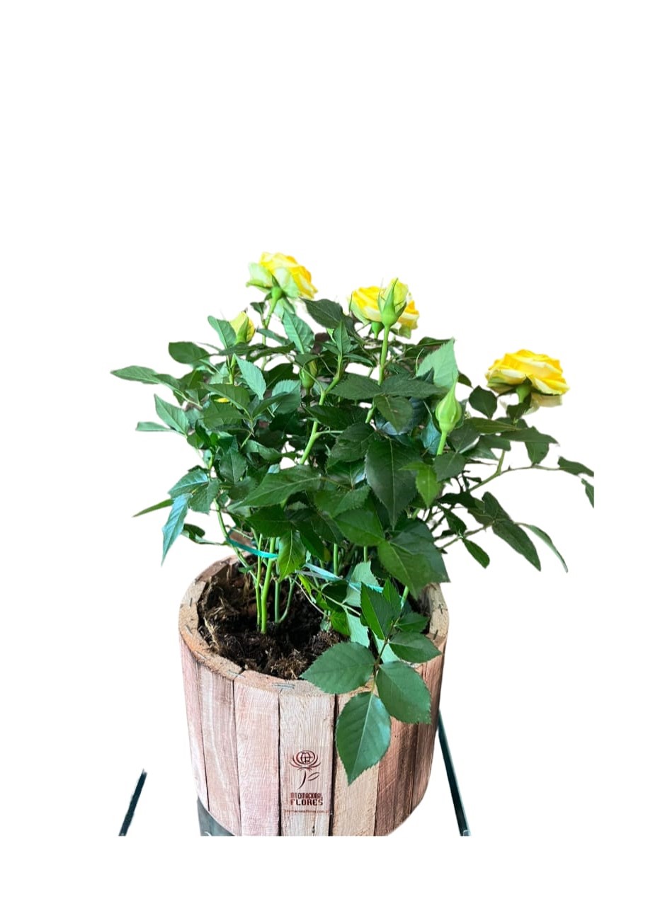 Vaso plantado de Roseira, de cores variadas (CONSULTAR COR DISPONÍVEL) de pote 15, dentro do cachepô de madeira rústica formato variado, vai embalado no celofane transparente com laço de fita especial.